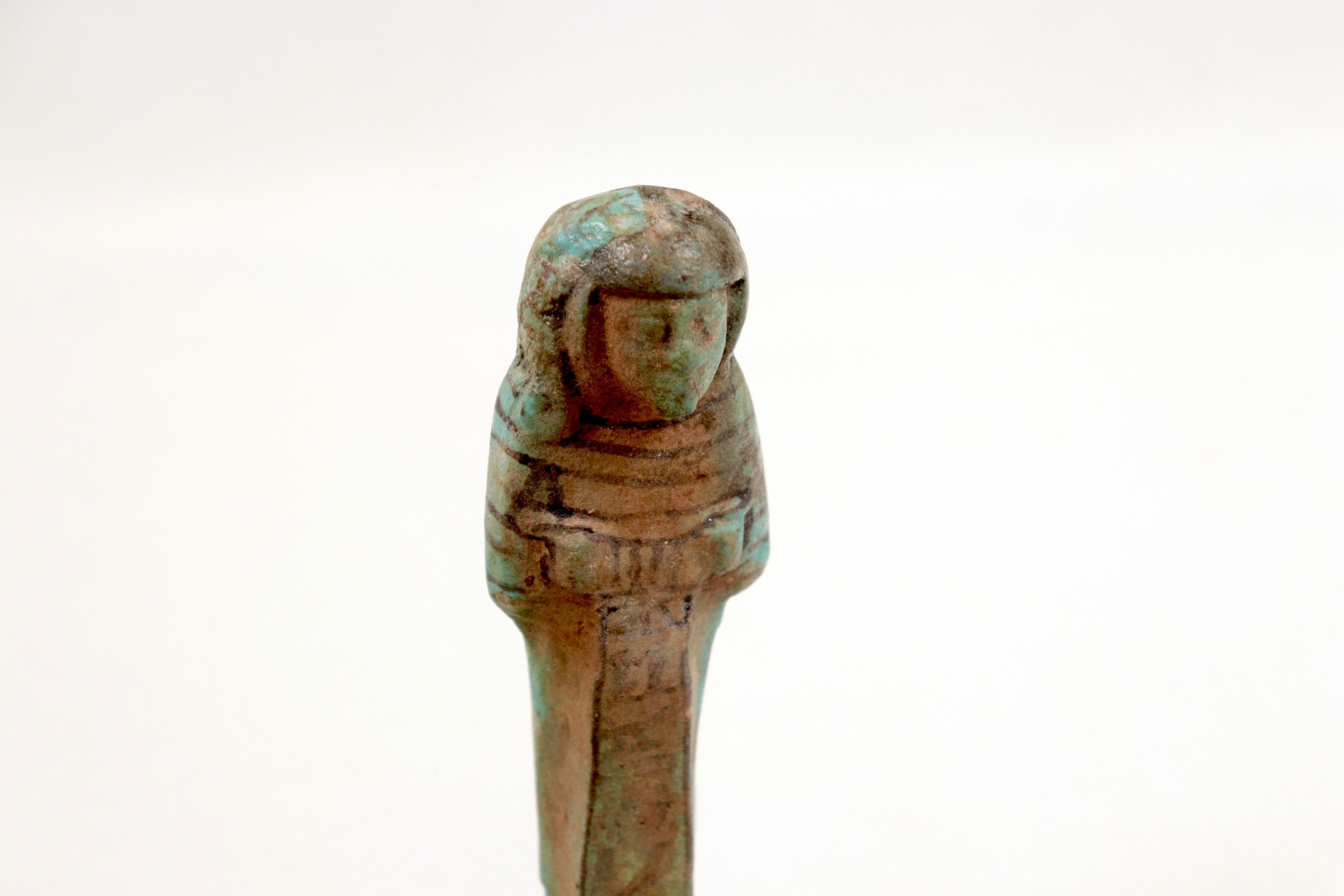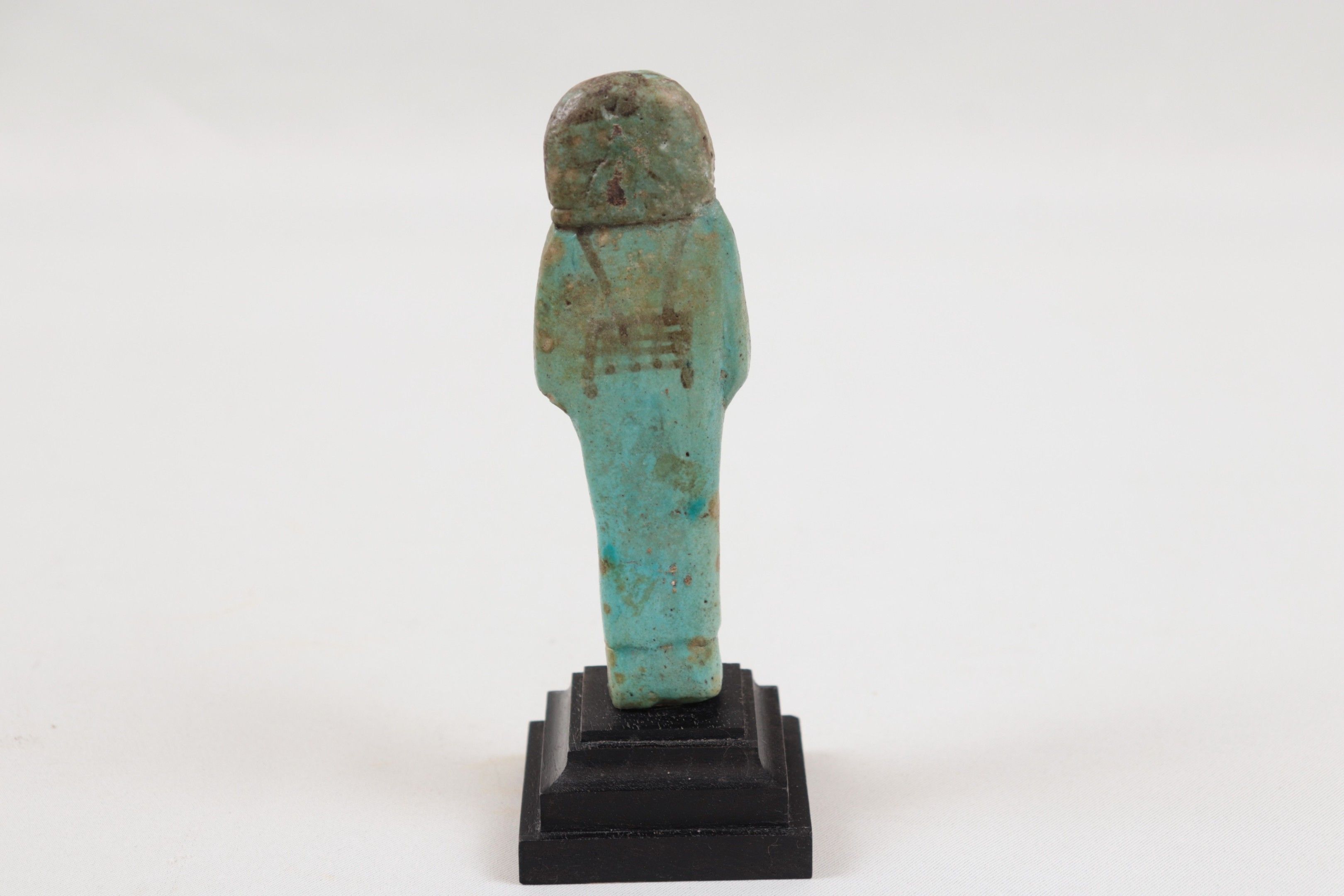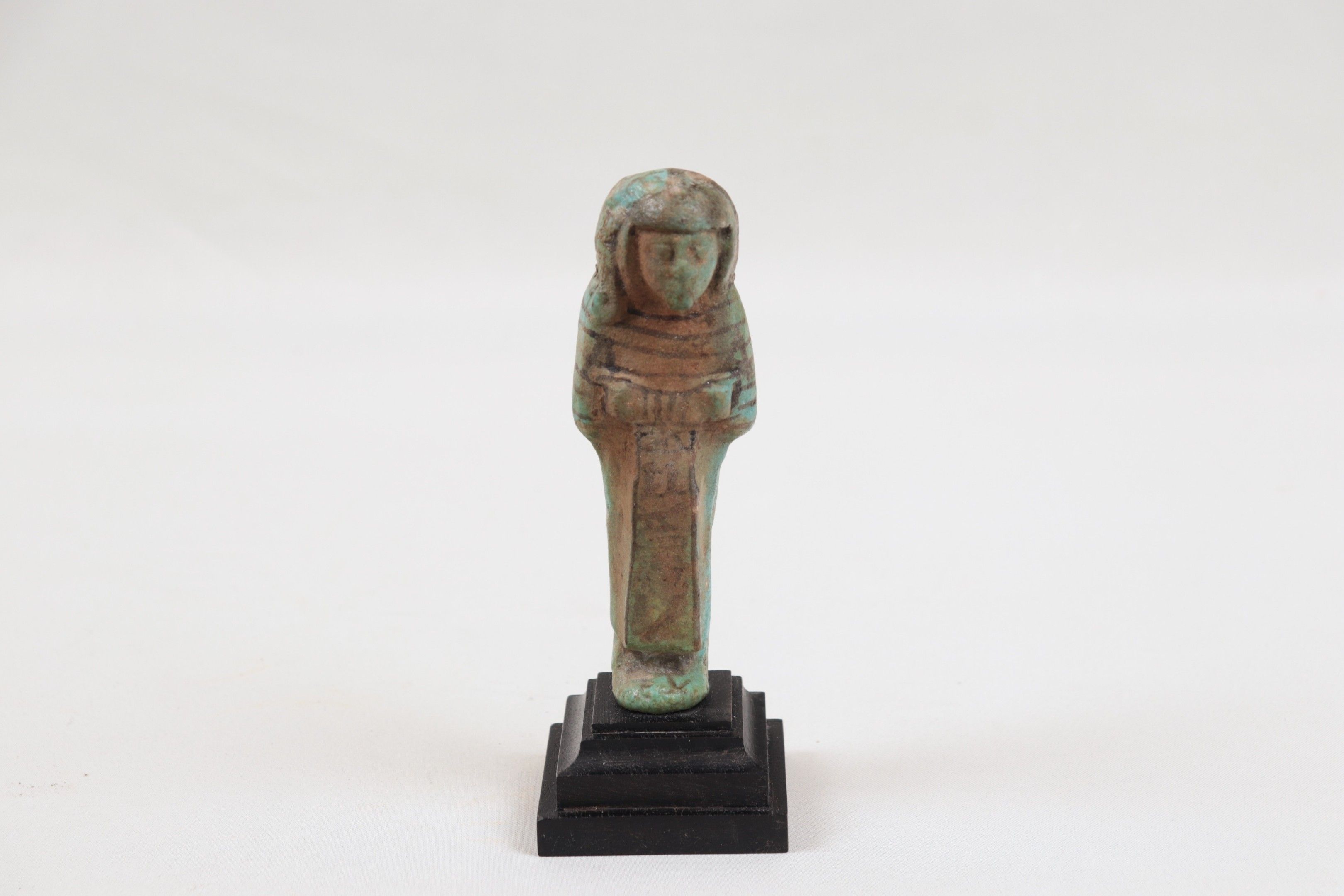 Chaouabti in living costume wearing a round wig with loincloth inscribed on a ventral column with the name of Hori high priest of Ptah, Fritte, - Egypt, New Kingdom, 19th dynasty (1292-1186 BC) - - Bibliography: JF Aubert statuettes funéraires égyptiennes Paris 1974. - Provenance: Hôtel Drouot, anonymous sale, December 2012.