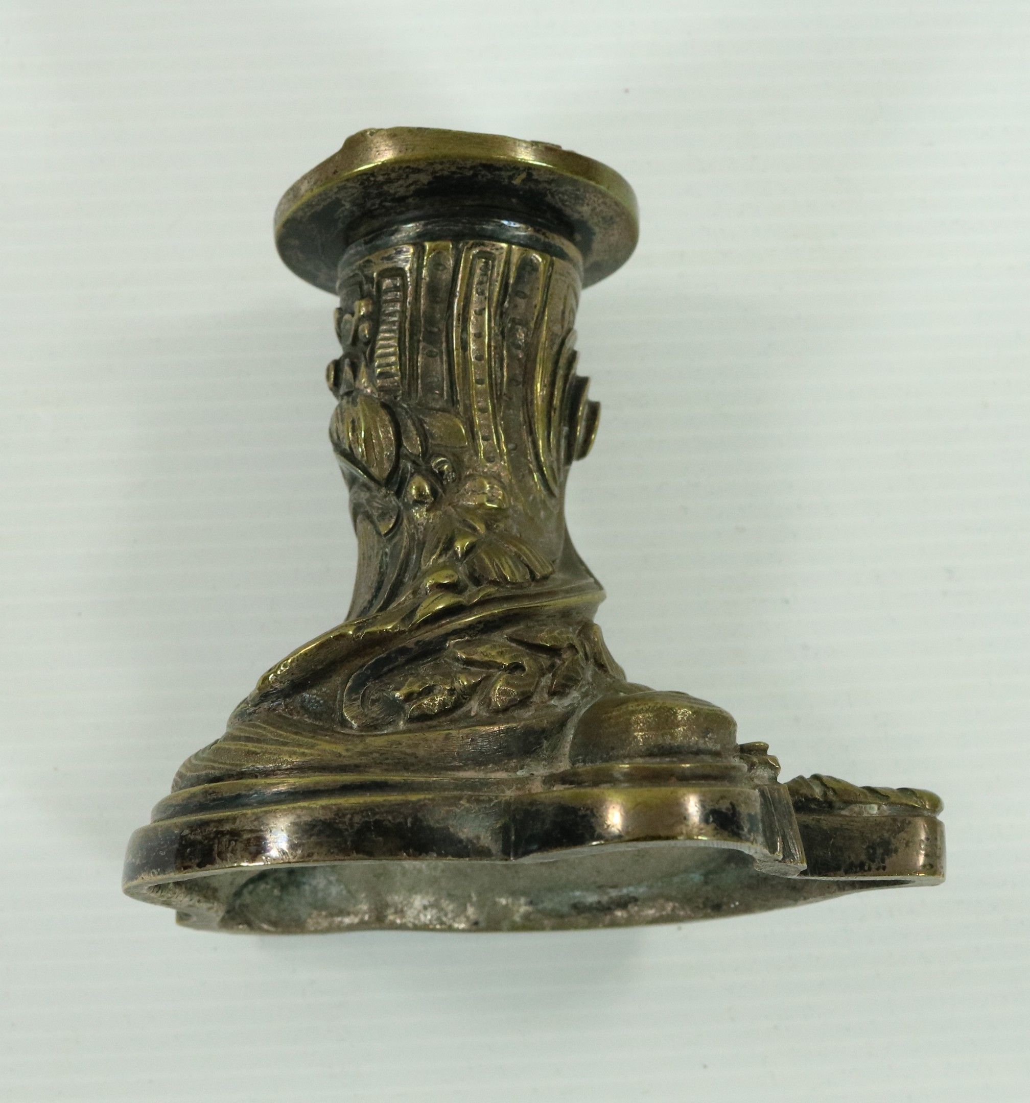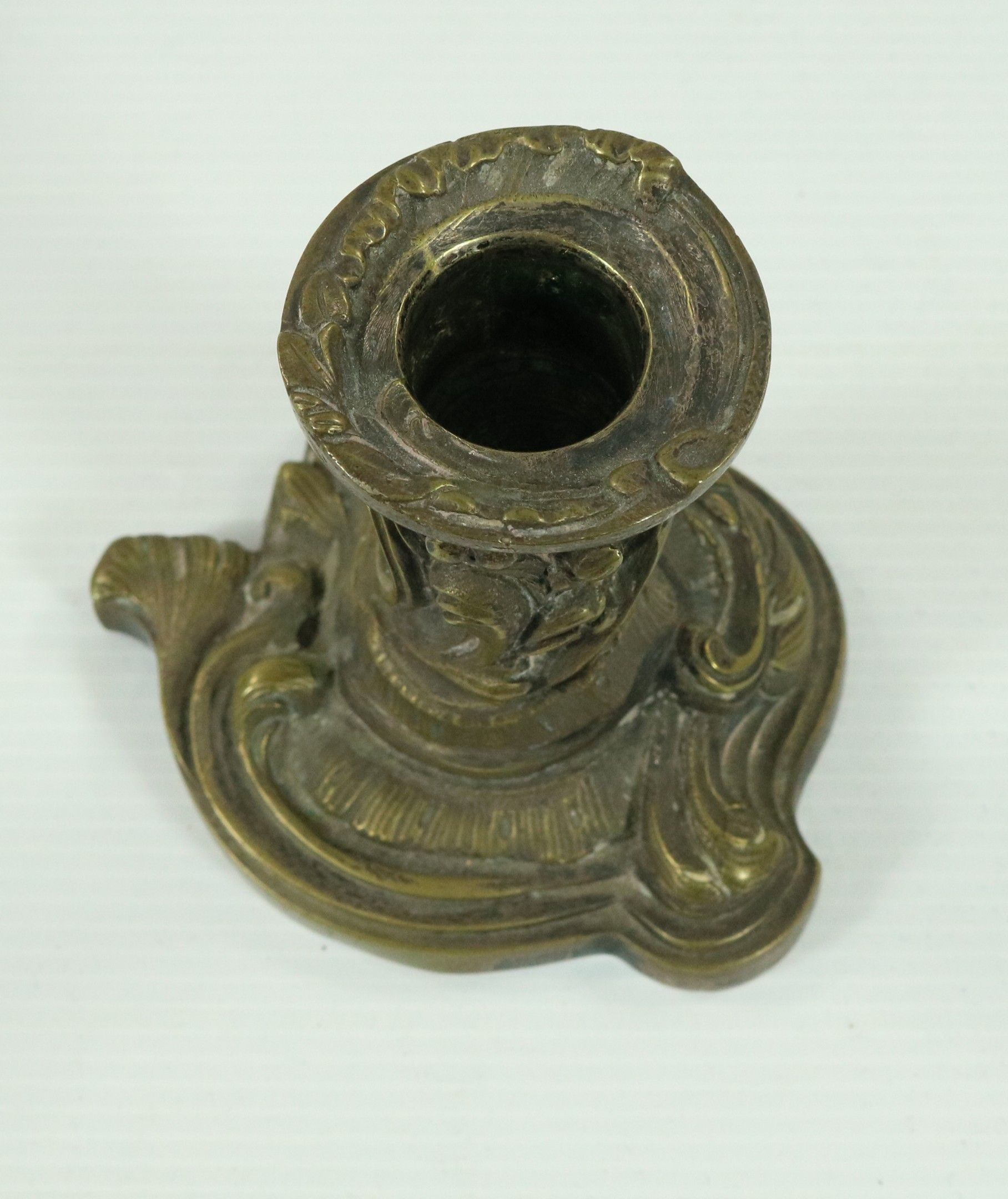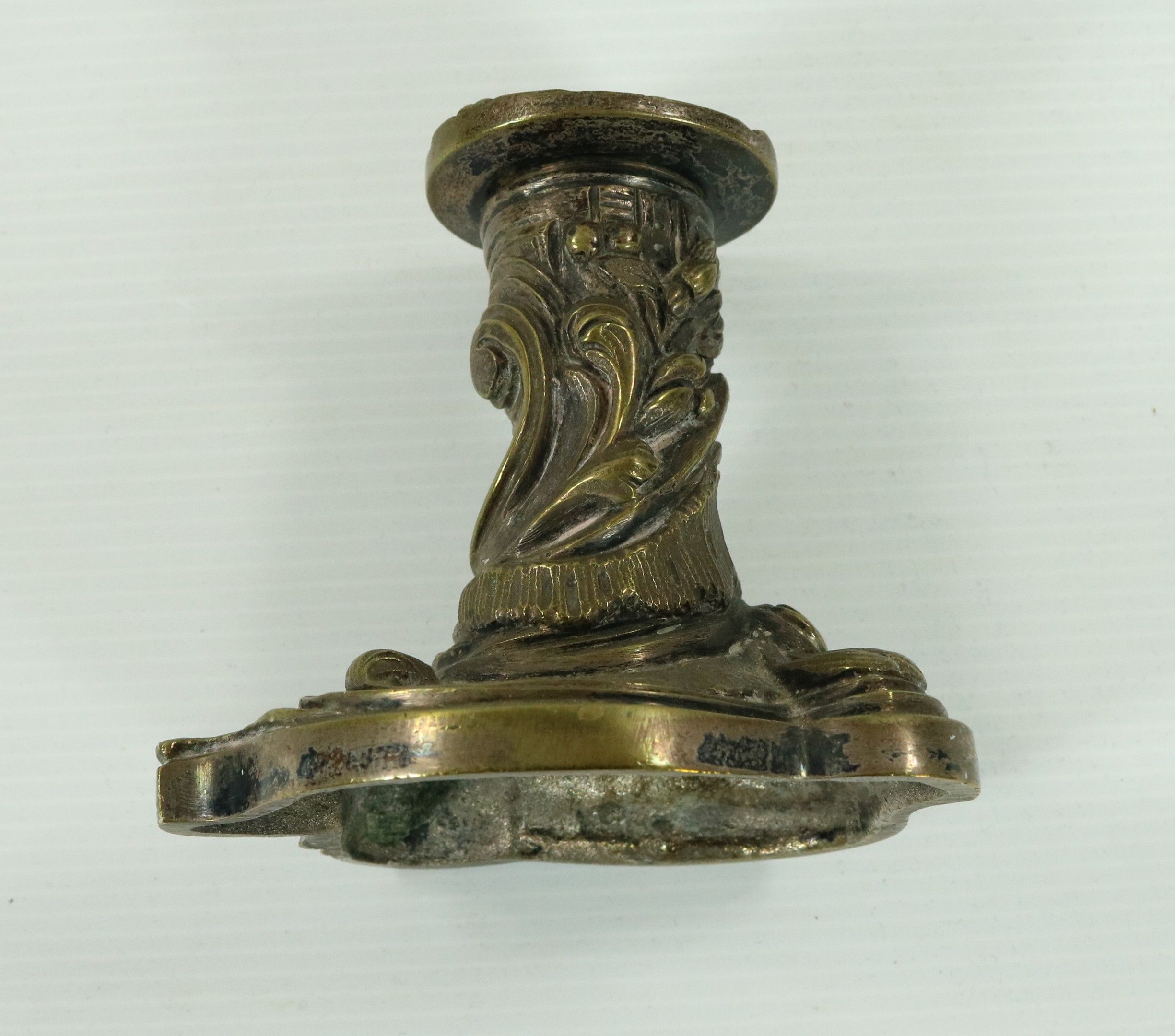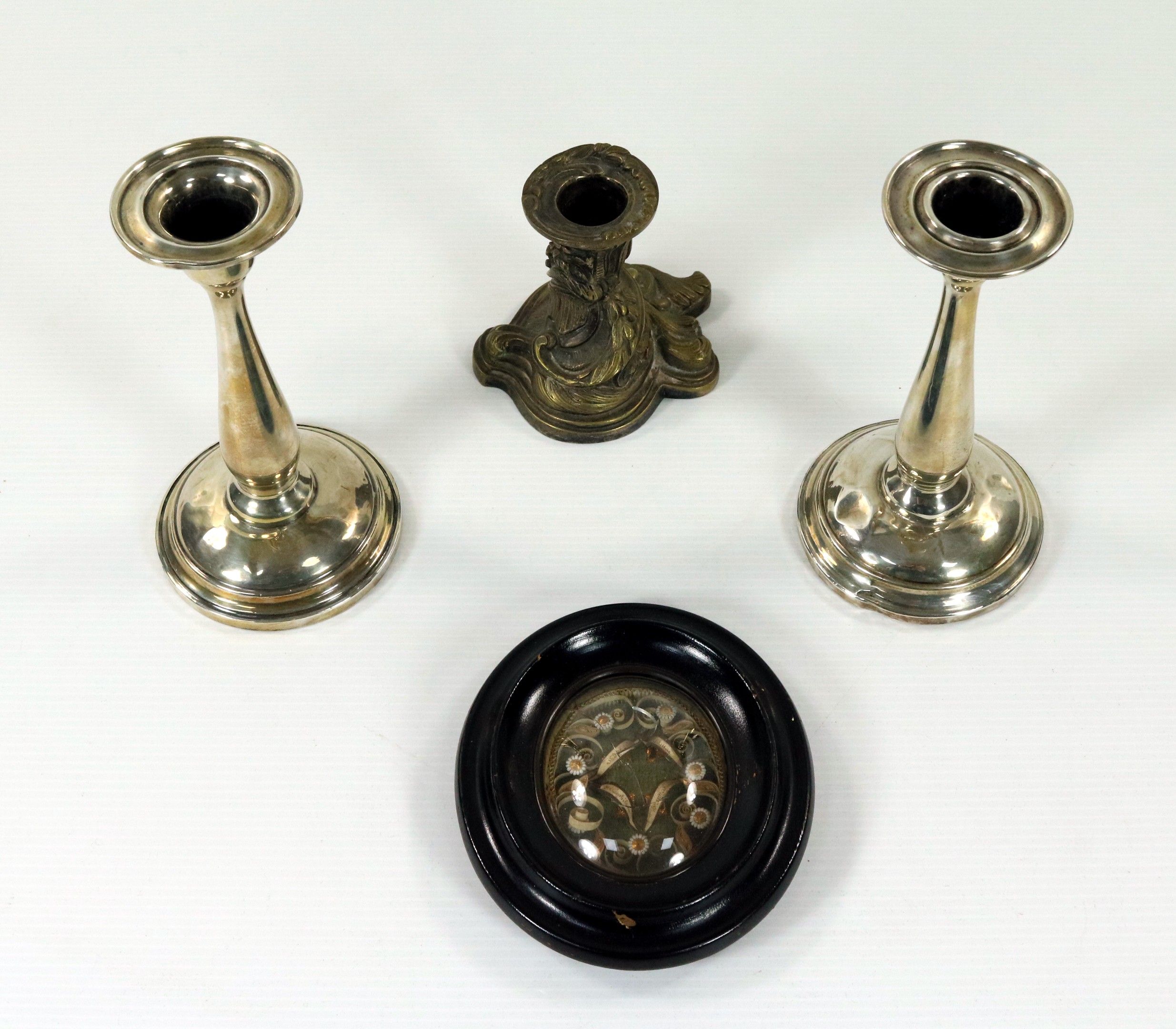 Lot. Pair of English silver CANDLESTICKS, Mo HAMILTON (feet with sand). PB: 518 grs, minor knocks - Small bronze Regency-style table CANDLESTICK (H: 8.5 cm) - Small RELIQUARY (damaged glass)