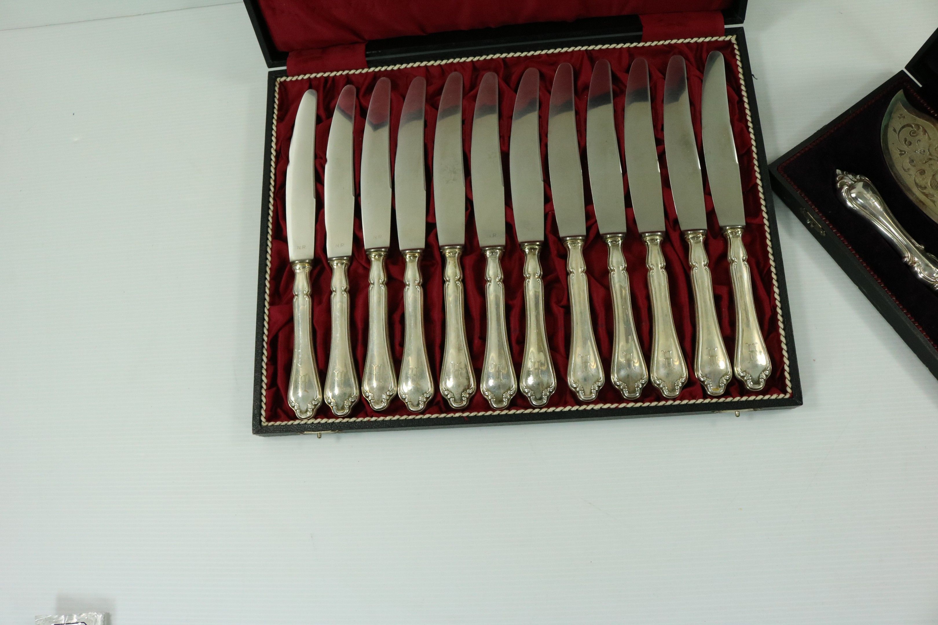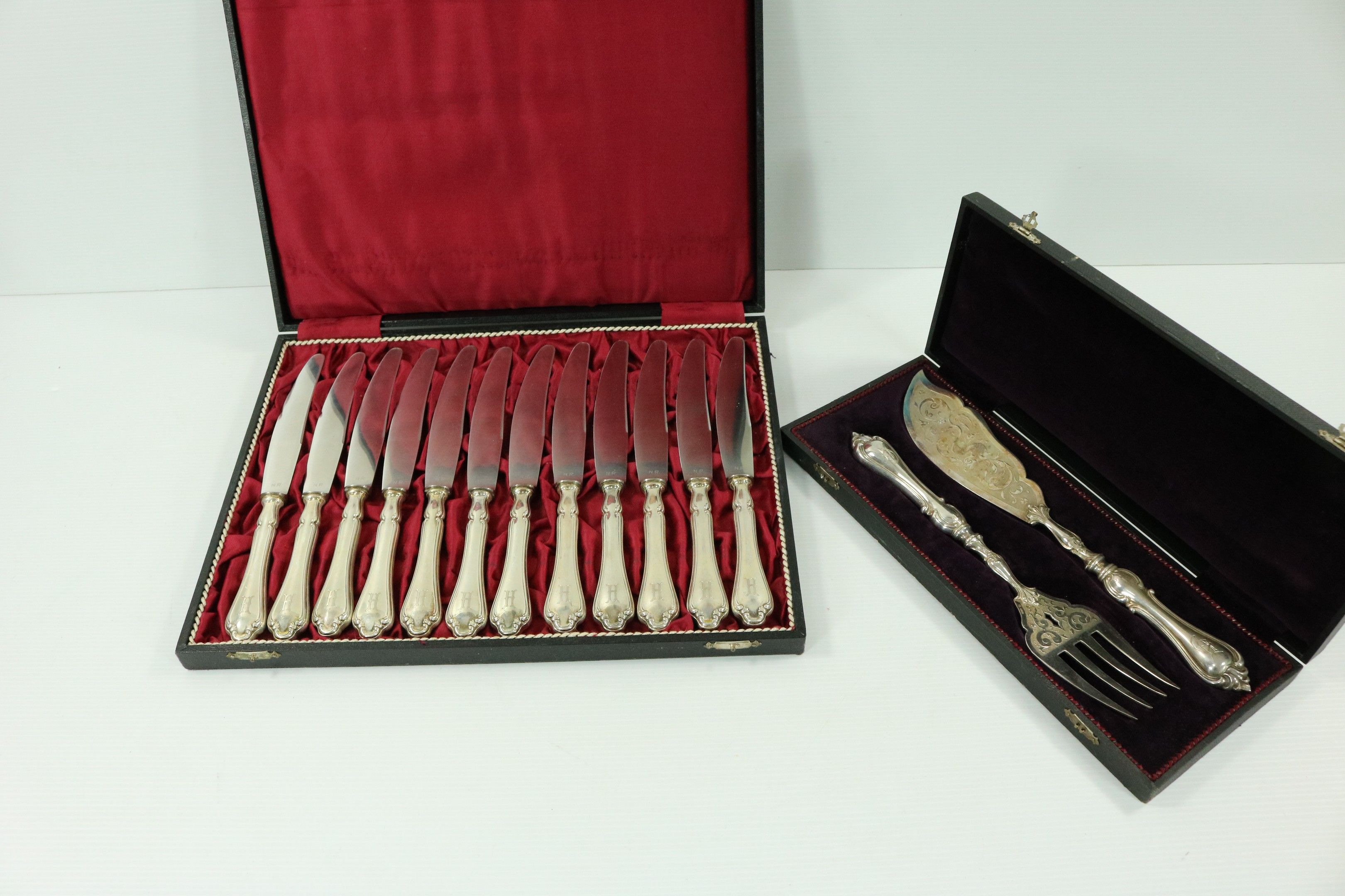 Germany, Box with twelve large knives with forged silver handles and Box with a fish service with forged silver handles. PB: 1 kg approx.
