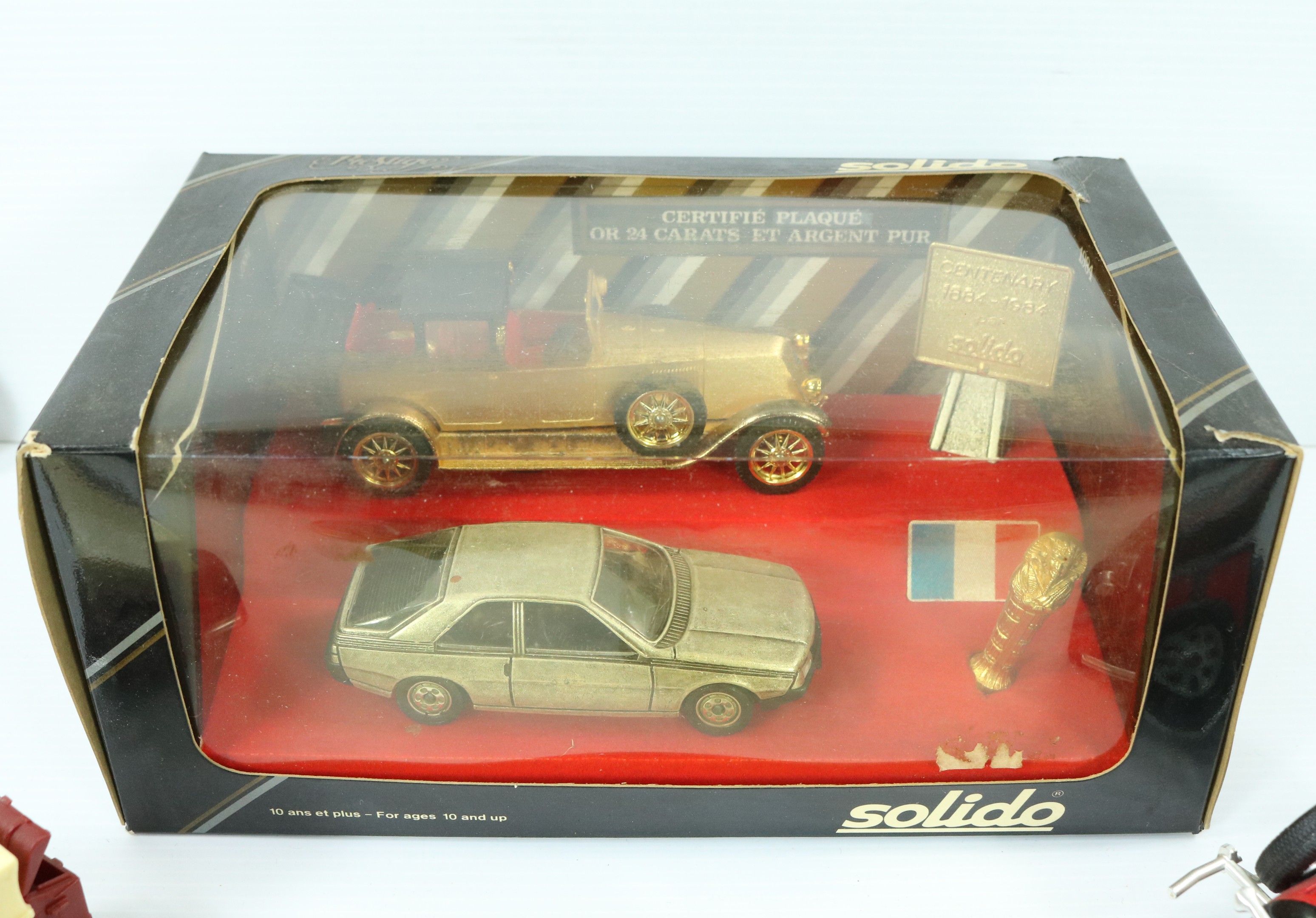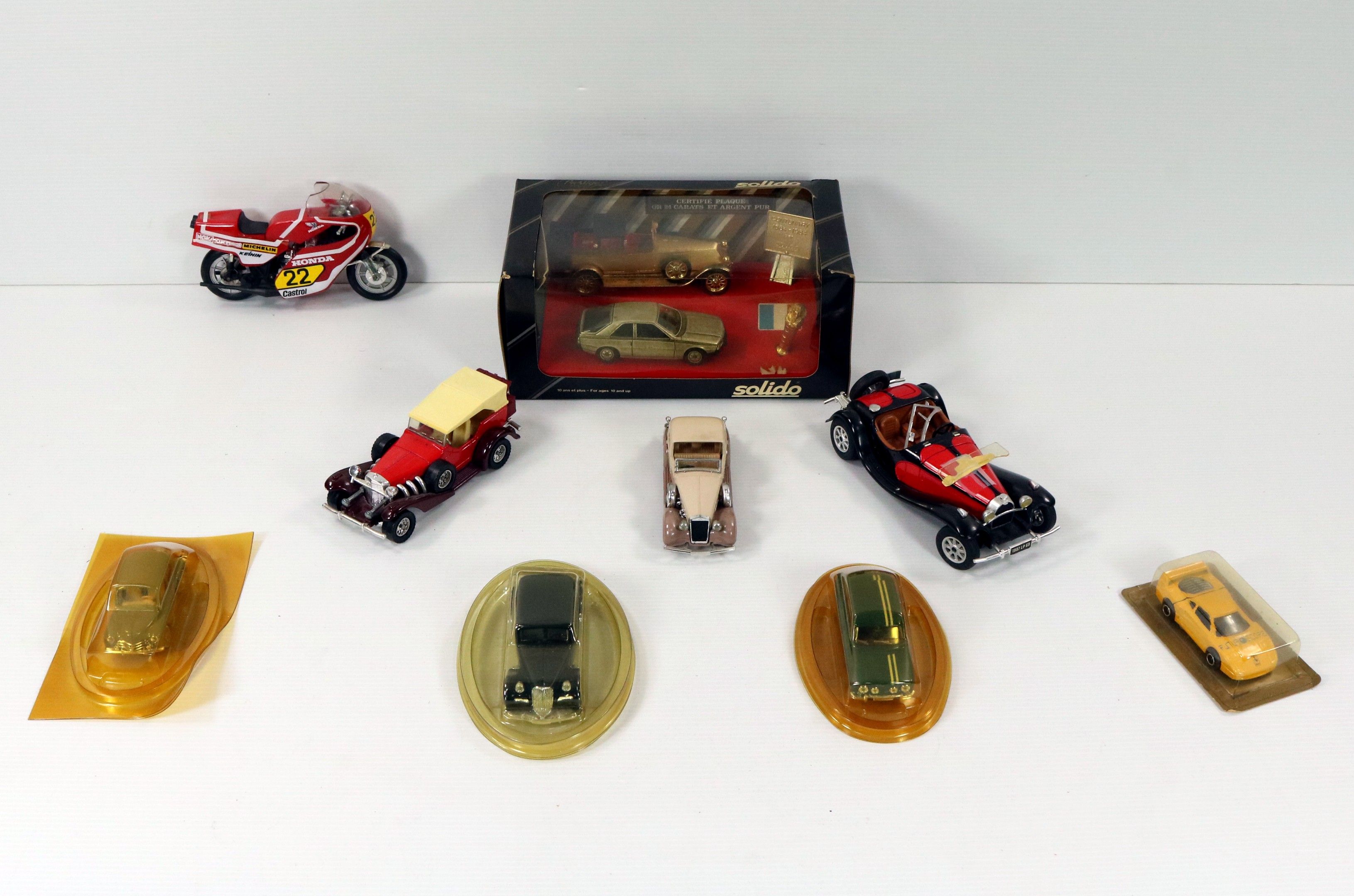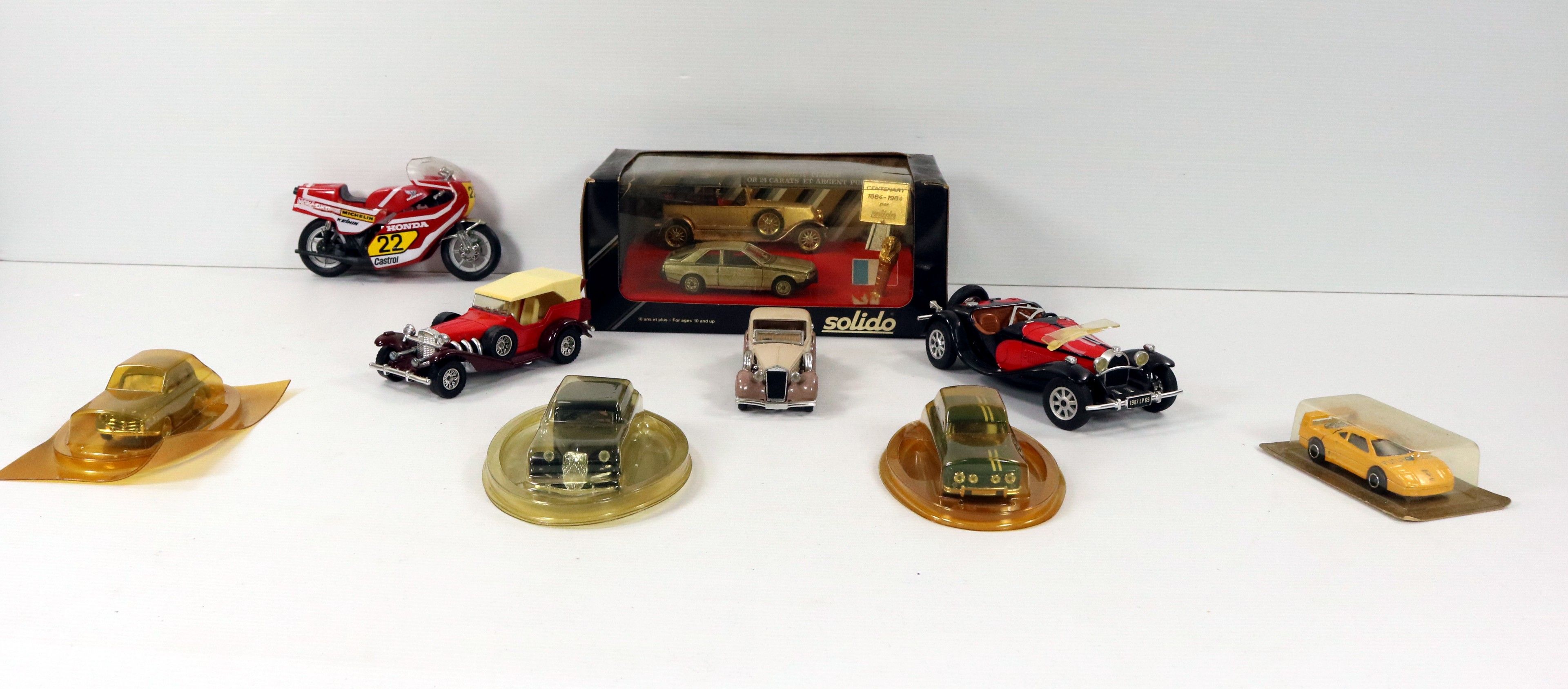 Set of 9 vintage metal cars, 4 of which are in boxes, with a SOLIDO Prestige box commemorating the centenary of 1884-1984, certified 24-carat gold-plated and pure silver. Attached is a HONDA plastic motorbike.
