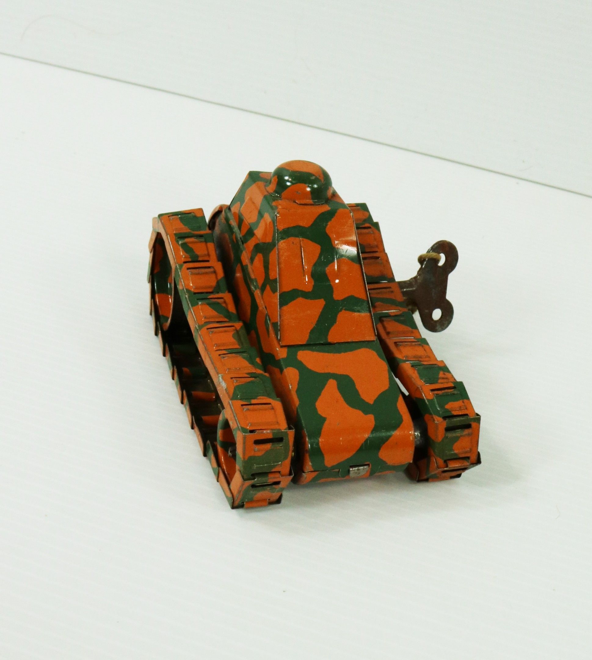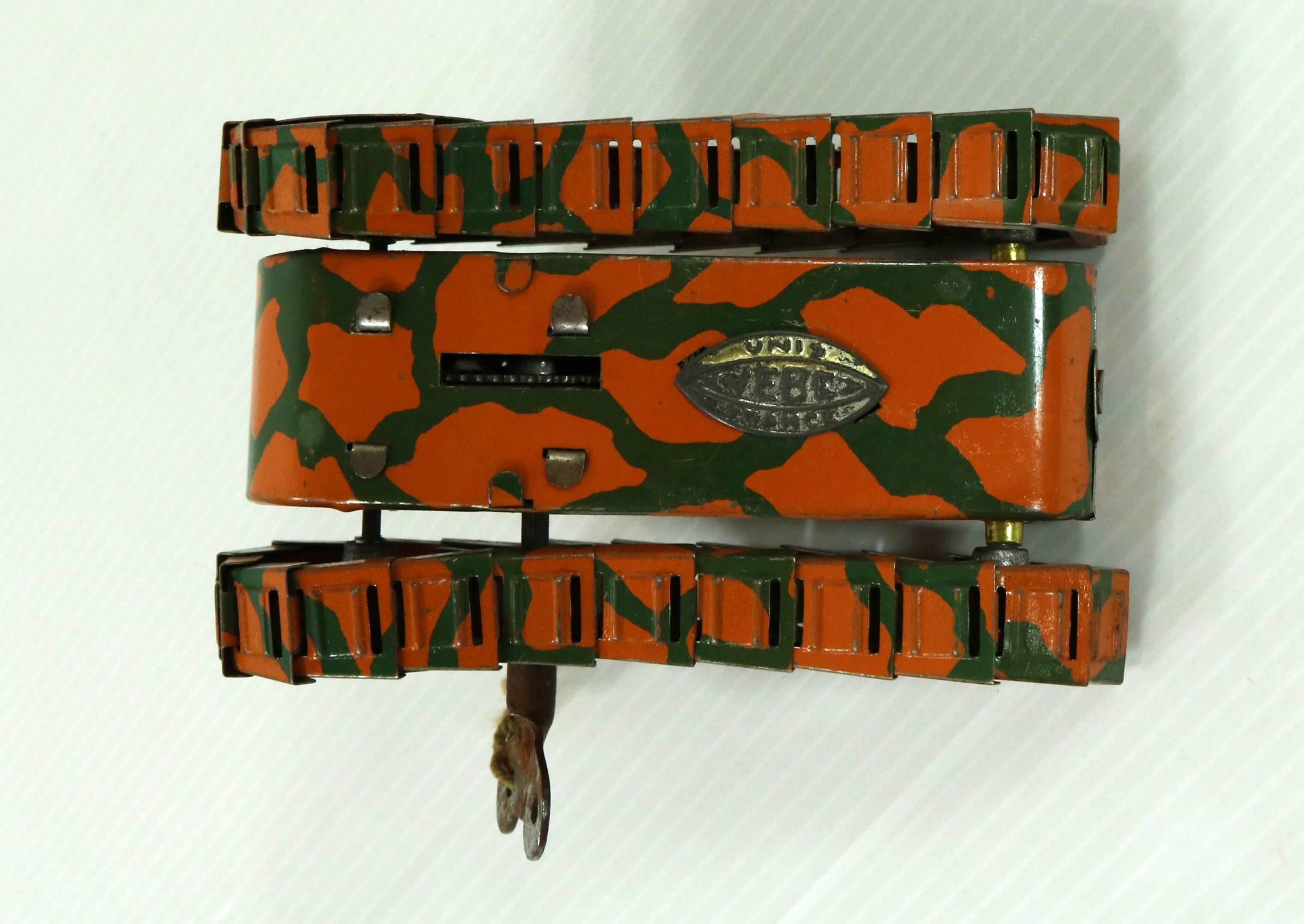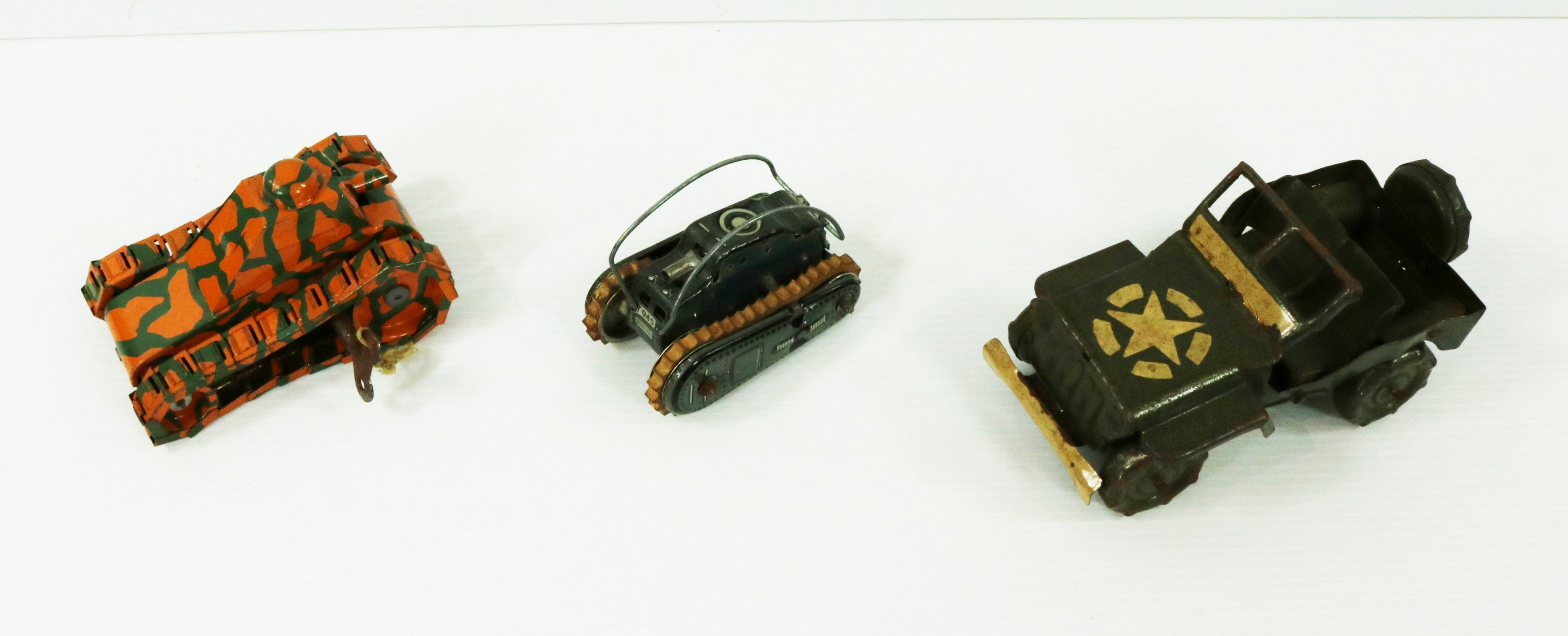 Reunion of three military vehicles in painted sheet metal: Jeep (6.5 x 14 x 7 cm) - Made in Paris rubber tracked tank (without key) - Orange and khaki camouflage tank, key mechanism in condition, made by Unis France VÉBÉ, circa 1939, L: 10 cm.