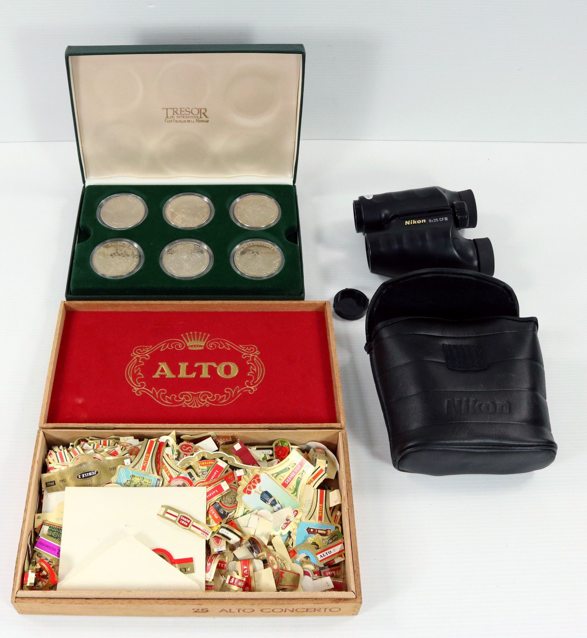 Lot. D-Day Collection boxed set: 12 medals in box - Pair of NIKON COMPACT 9X25CFIII JUMELLES - Collection of Cigar Rings