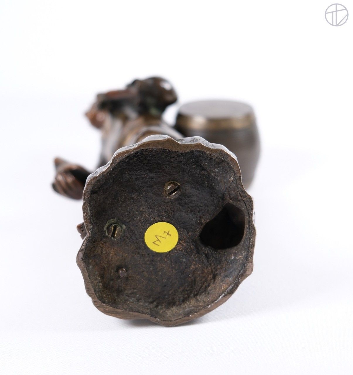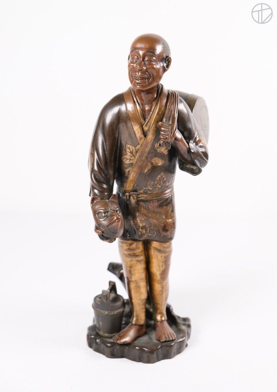 A patinated bronze okimono depicting an itinerant actor carrying a drum and a mask. Japan, Meij period (1868-1912). Height: 25 cm