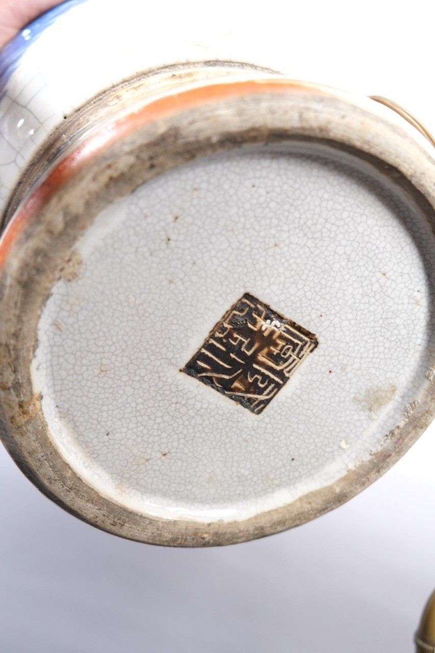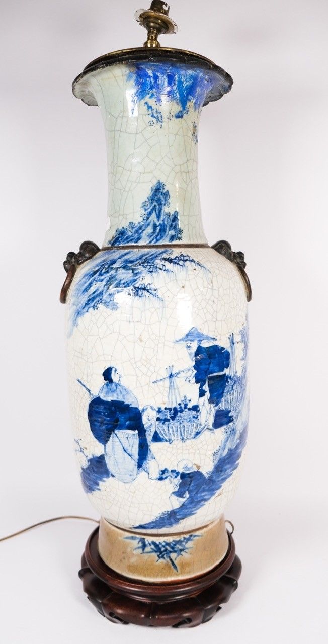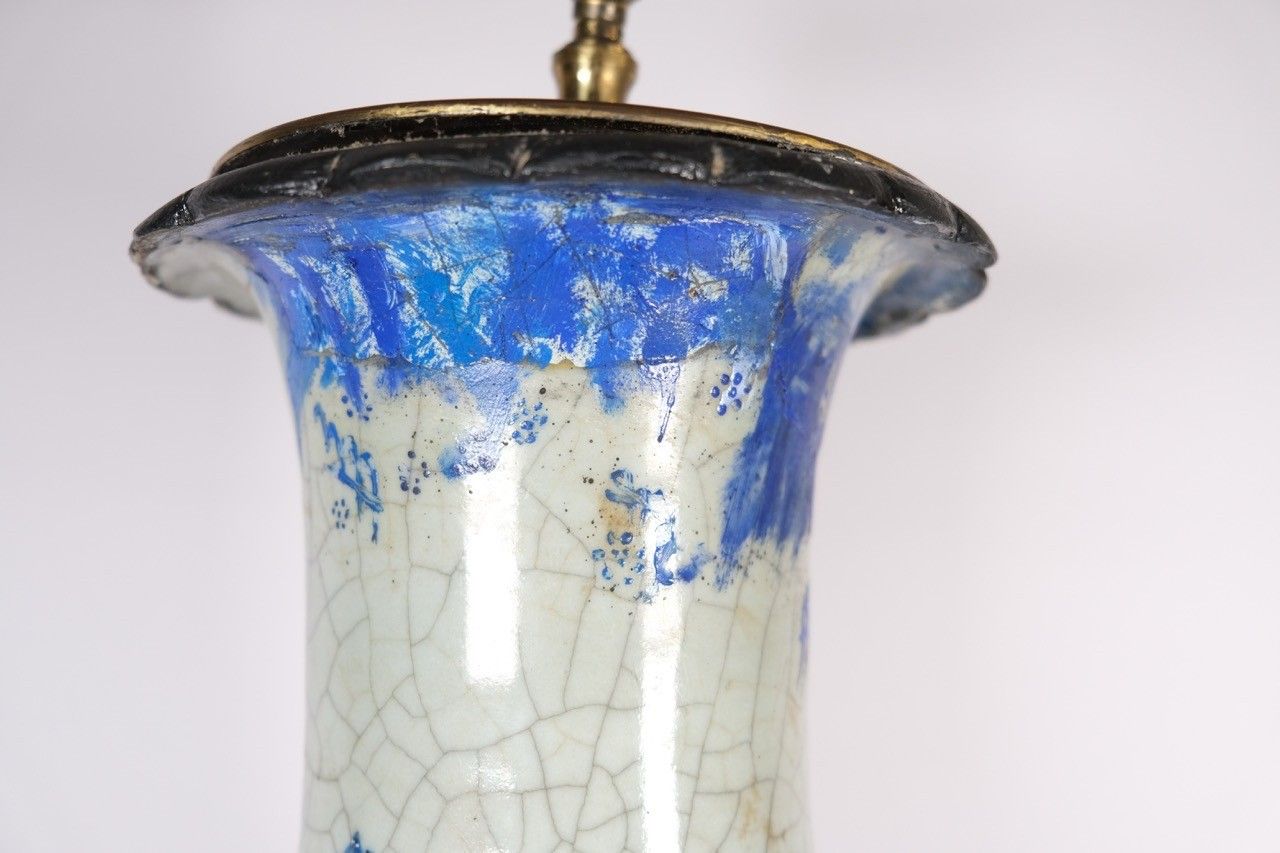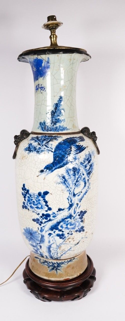 A large Nanking stoneware vase decorated with a bird and flowering branches. China, late 19th - early 20th century. Height: 60 cm. Mounted as a lamp on a wooden base (accidents and restorations)