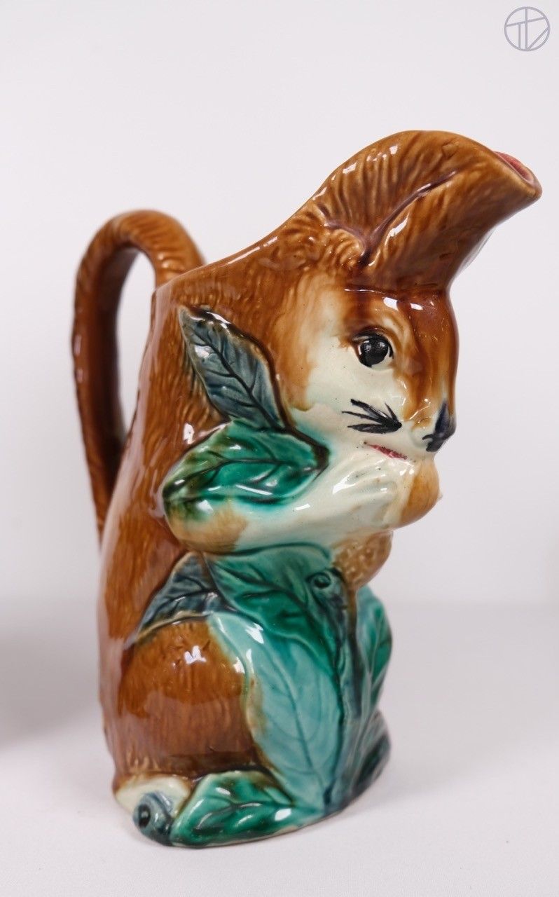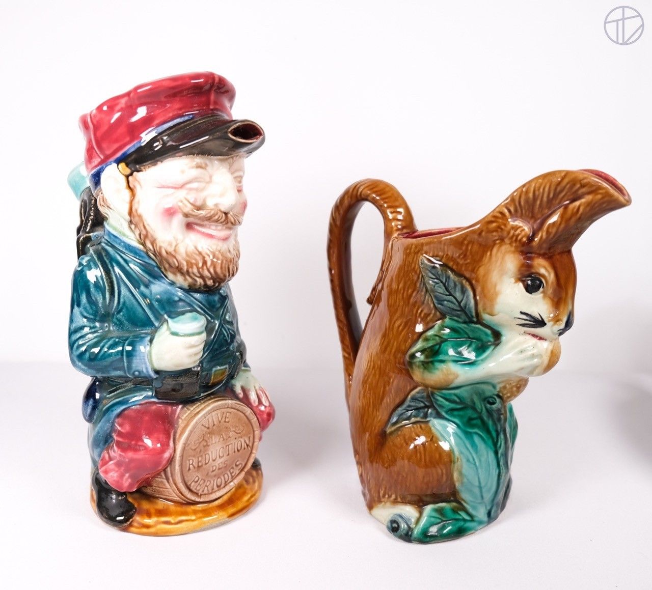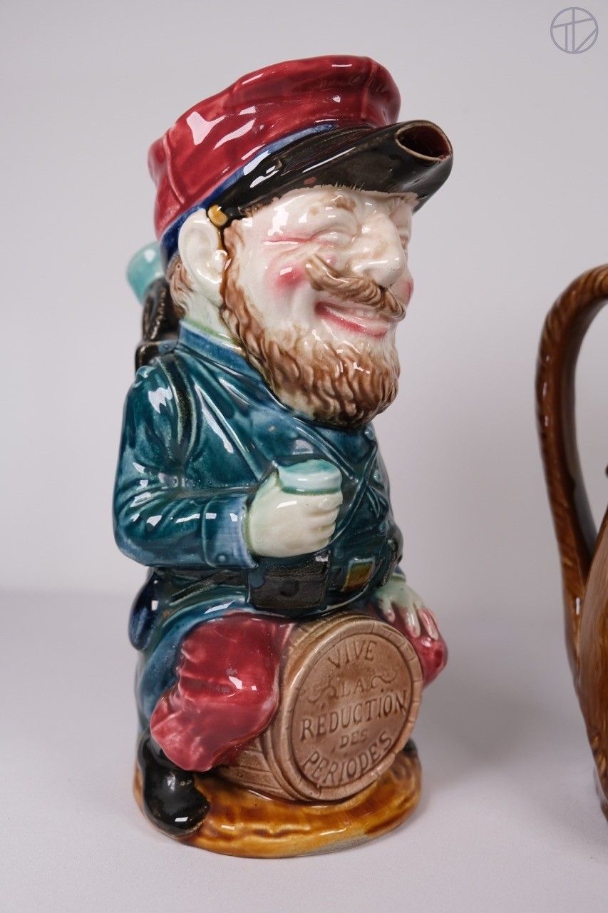 2 jugs including : - ONNAING, pitcher in polychrome barbotine "Vive la réduction des périodes" (Long live the reduction of periods) - ORCHIES, pitcher in barbotine model squirrel with hazelnut