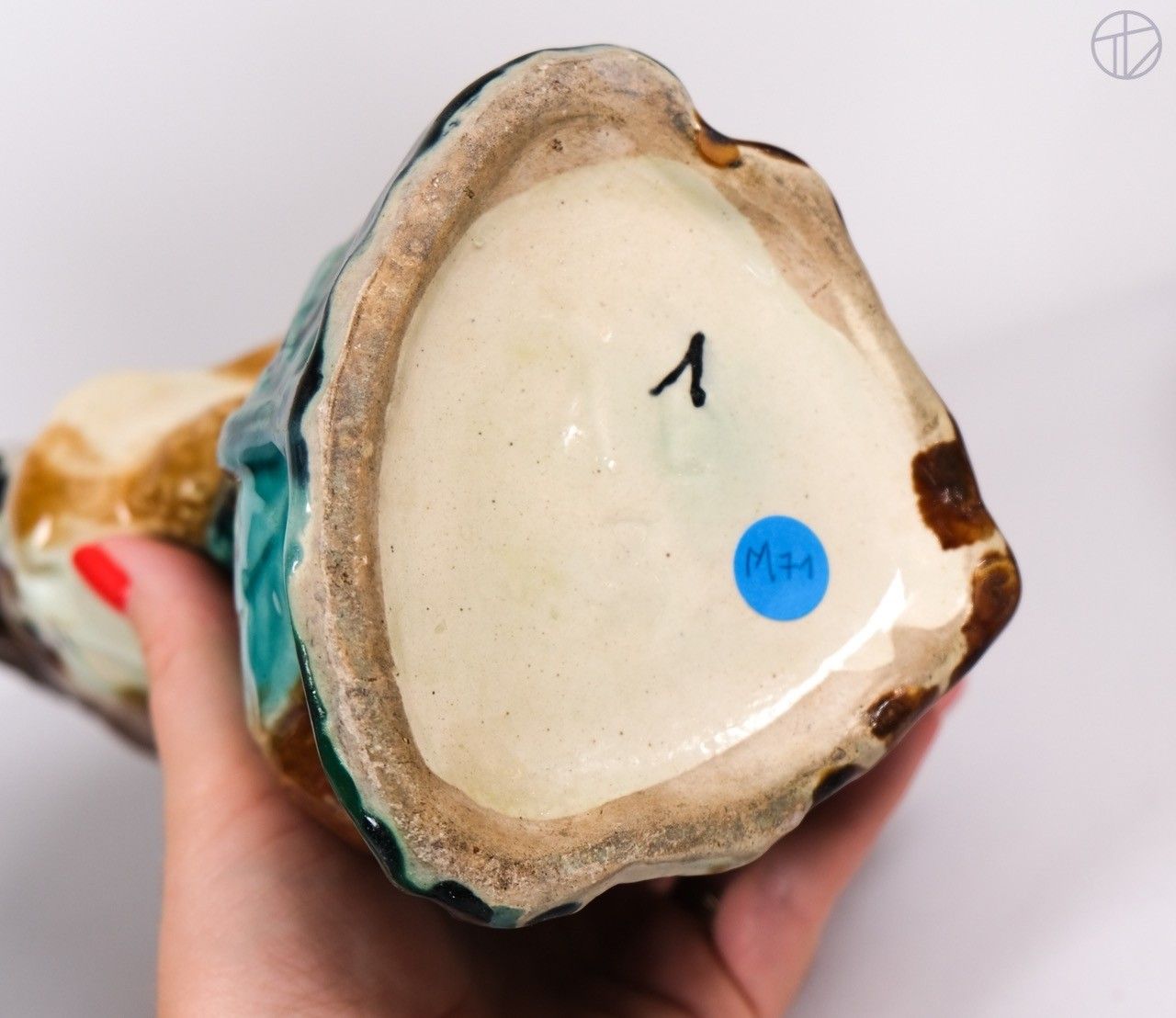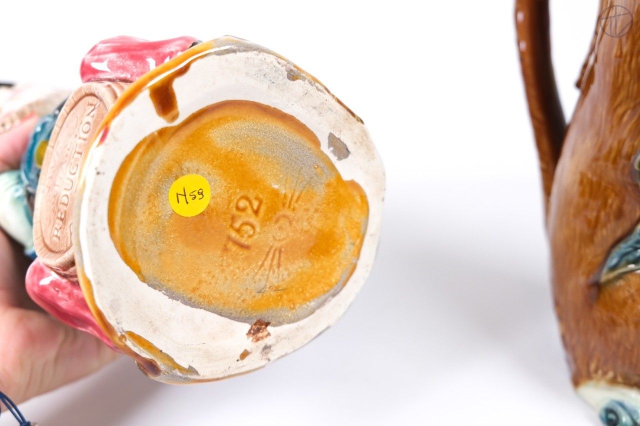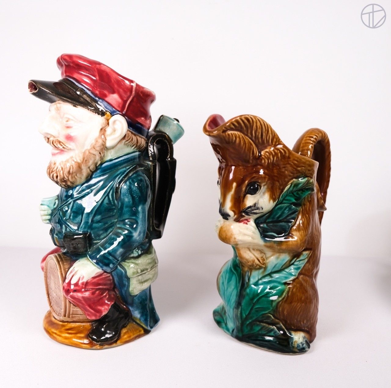 2 jugs including : - ONNAING, pitcher in polychrome barbotine "Vive la réduction des périodes" (Long live the reduction of periods) - ORCHIES, pitcher in barbotine model squirrel with hazelnut