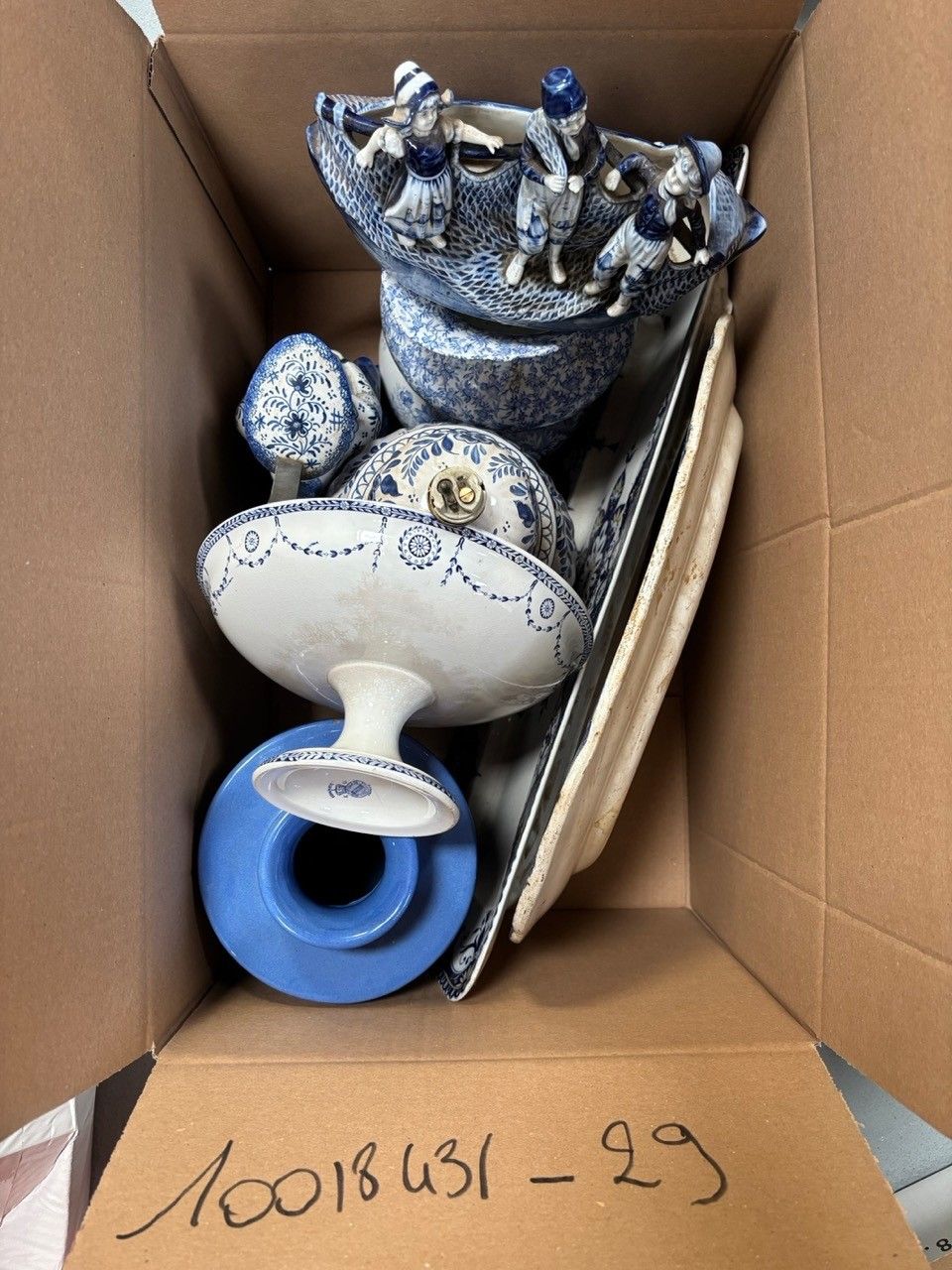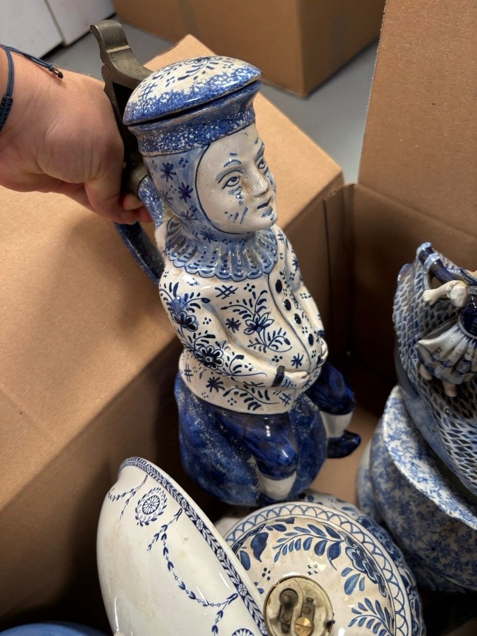 Lot of earthenware pieces (including Delft earthenware): anthropomorphic pitcher, bowls, jug, dishes, vase, lamp... in a box (accidents and missing pieces)