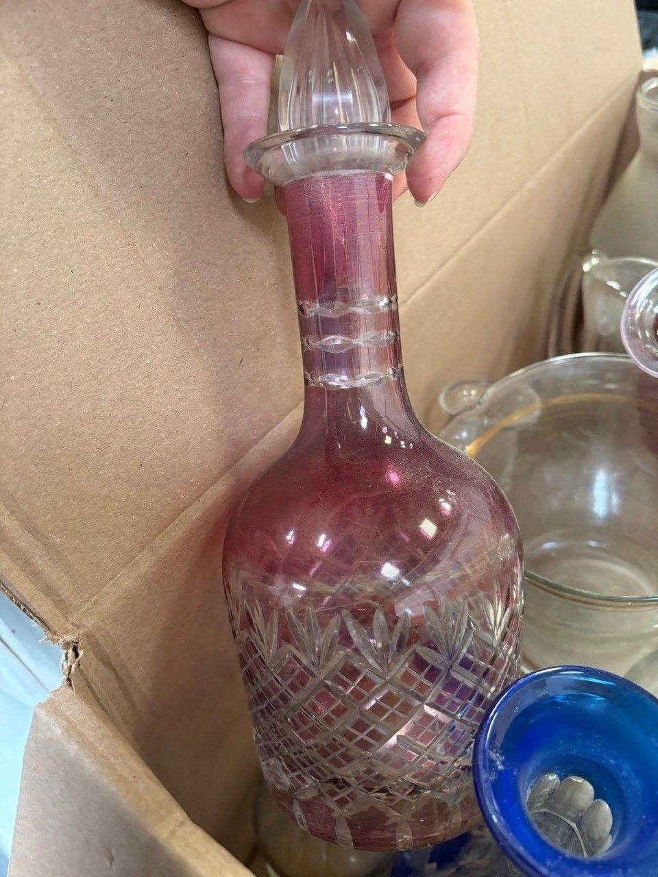 Glassware including bottles, carafes, jugs, knife holders.