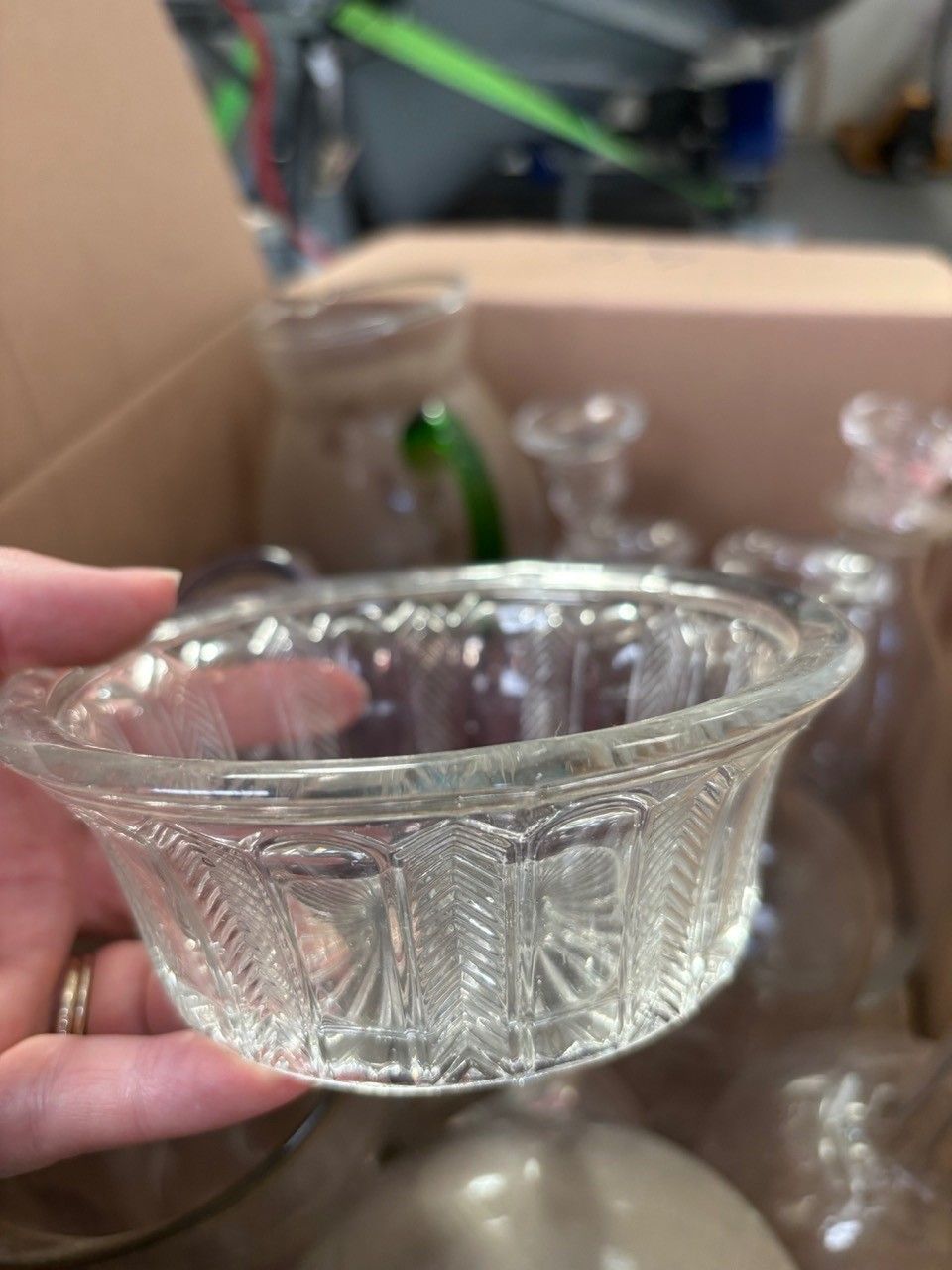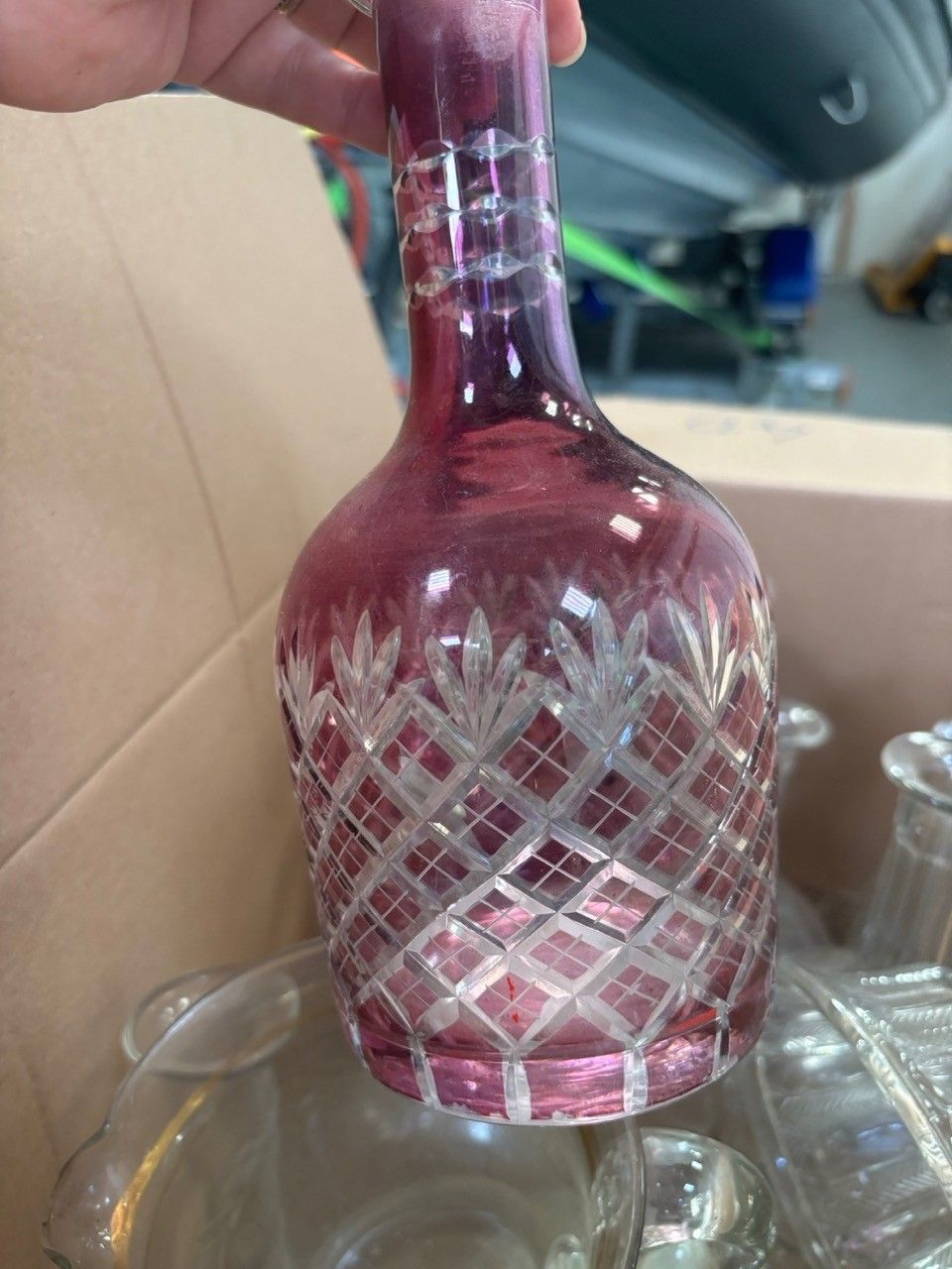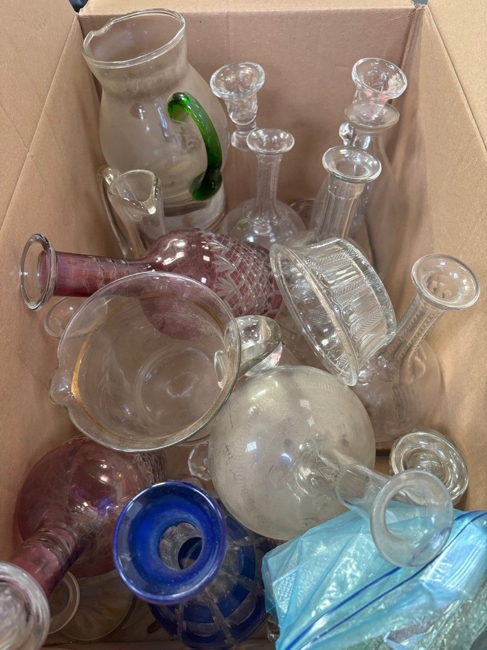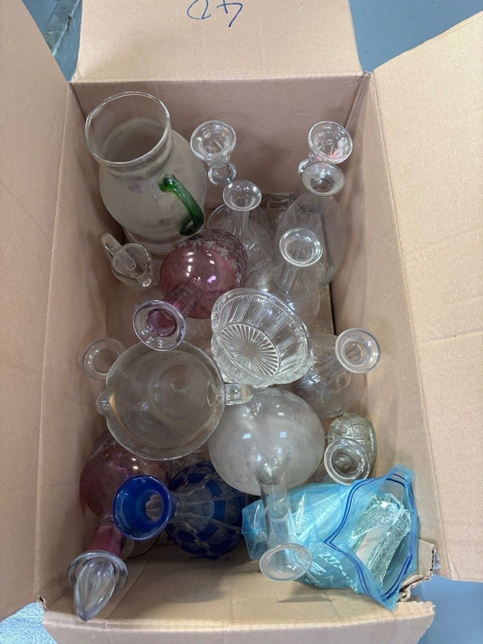 Glassware including bottles, carafes, jugs, knife holders... In a box (accidents and missing items) Lot located in our box in Lorient - Collection: ONLY on Thursday 27/11 from 2pm to 5pm or Tuesday 2 December from 9am to 12pm