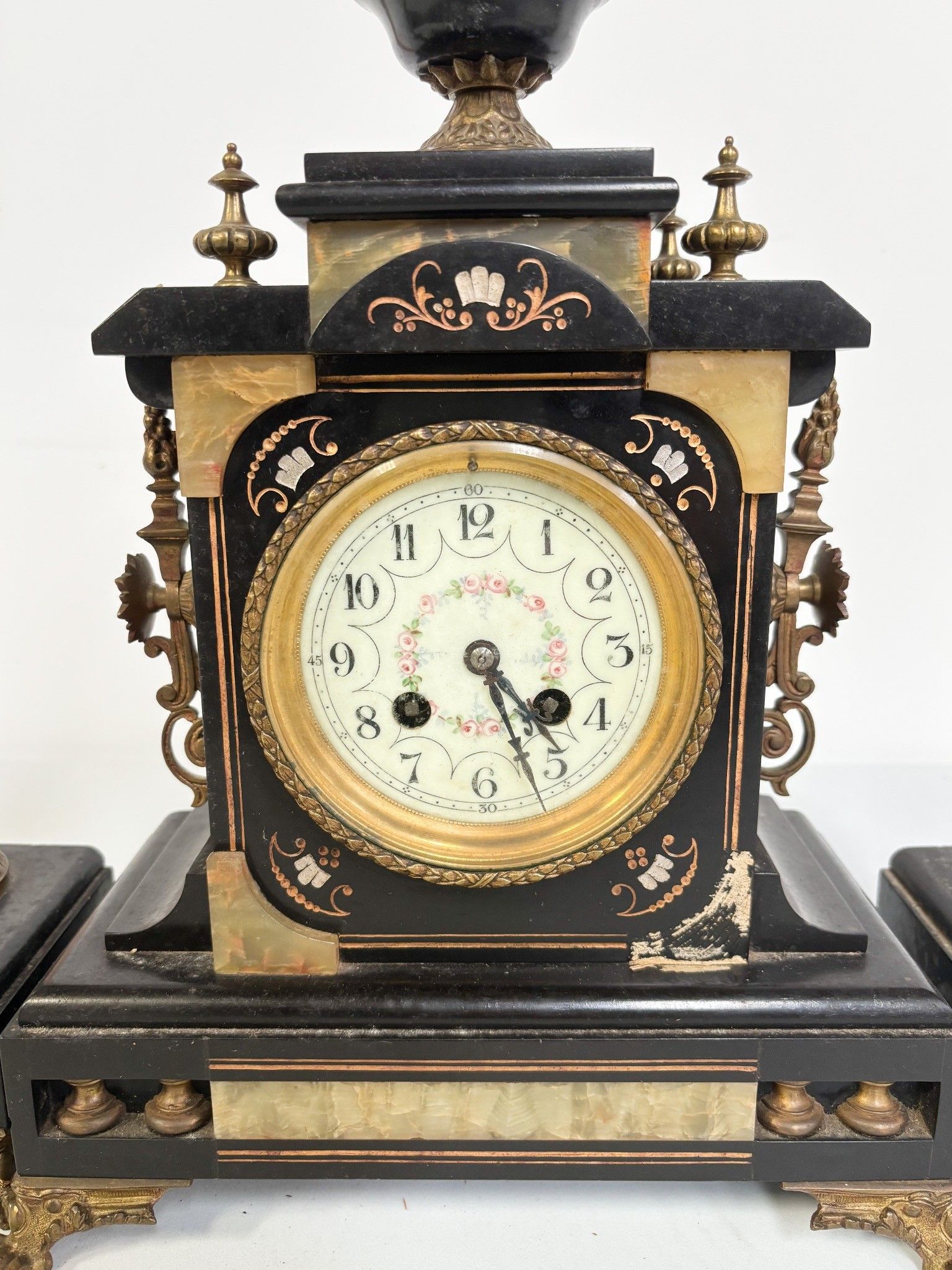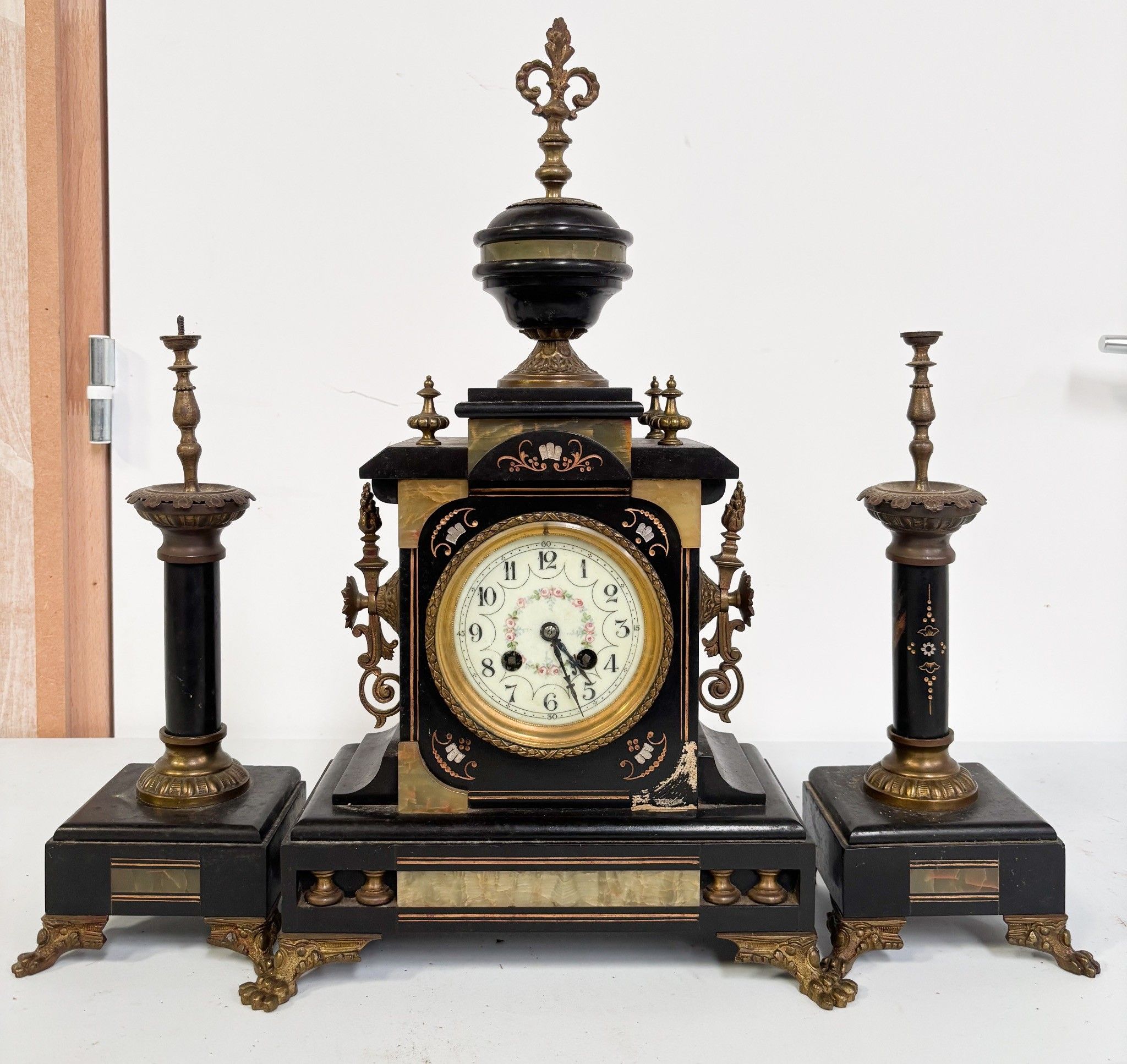 Black marble veneered mantel insert. Napoleon III period. H: 48 cm (accidents and missing pieces)