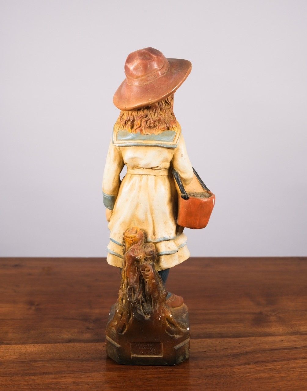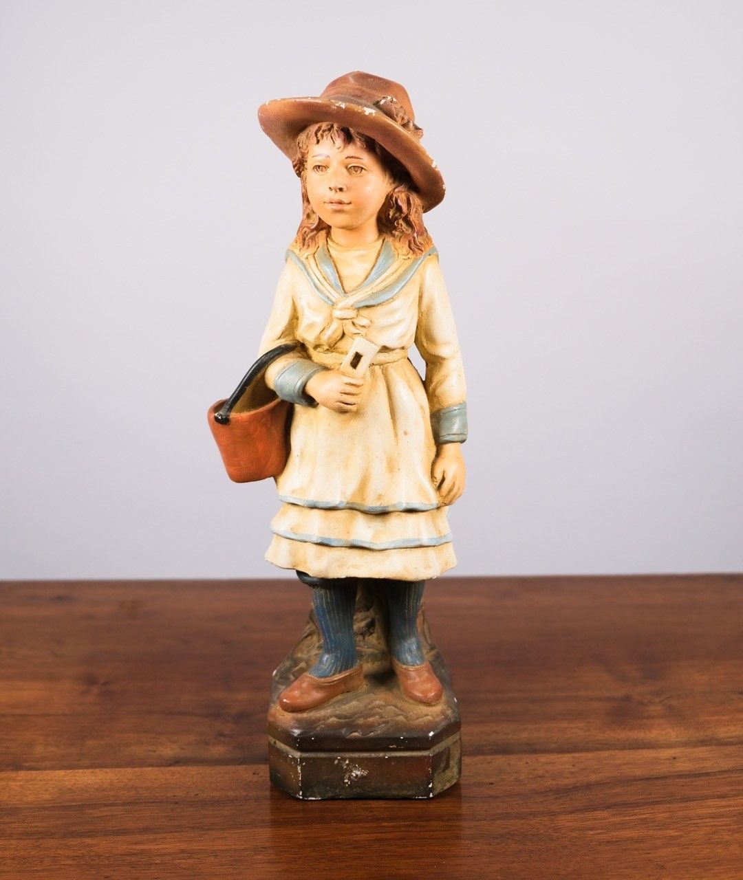 COUNTRY CORNER, Little girl with a bucket. Sculpture in patinated plaster. H: 38.5 cm (missing) Lot located in our Lorient showroom - Collection: ONLY on Thursday 27/11 from 2pm to 5pm or Tuesday 2 December from 9am to 12pm
