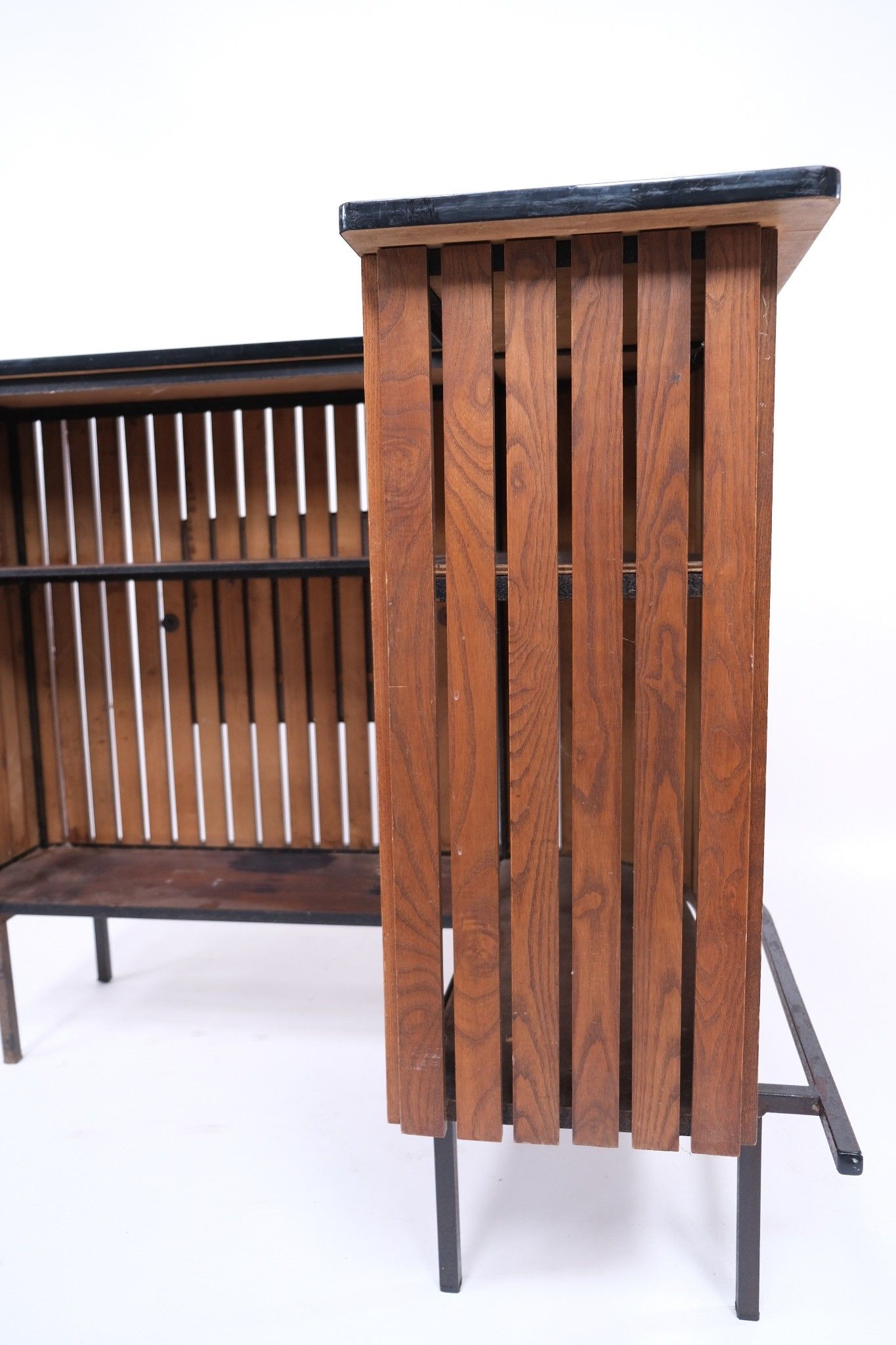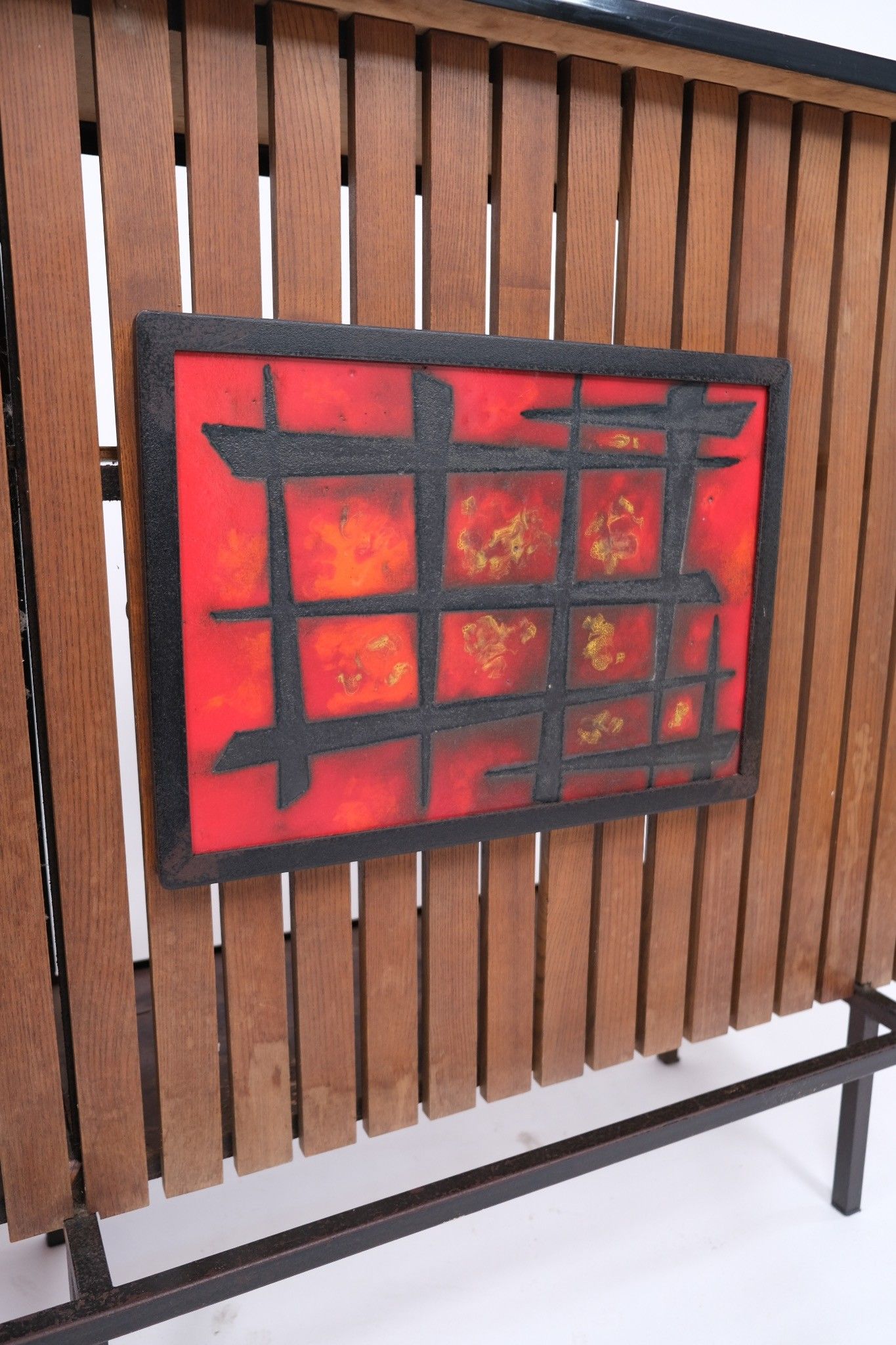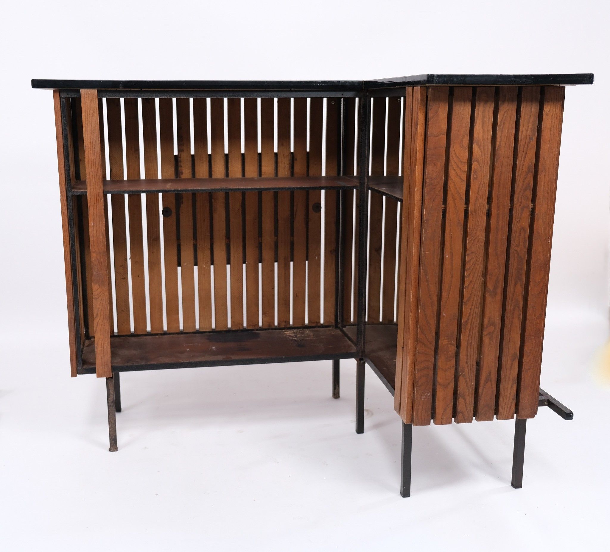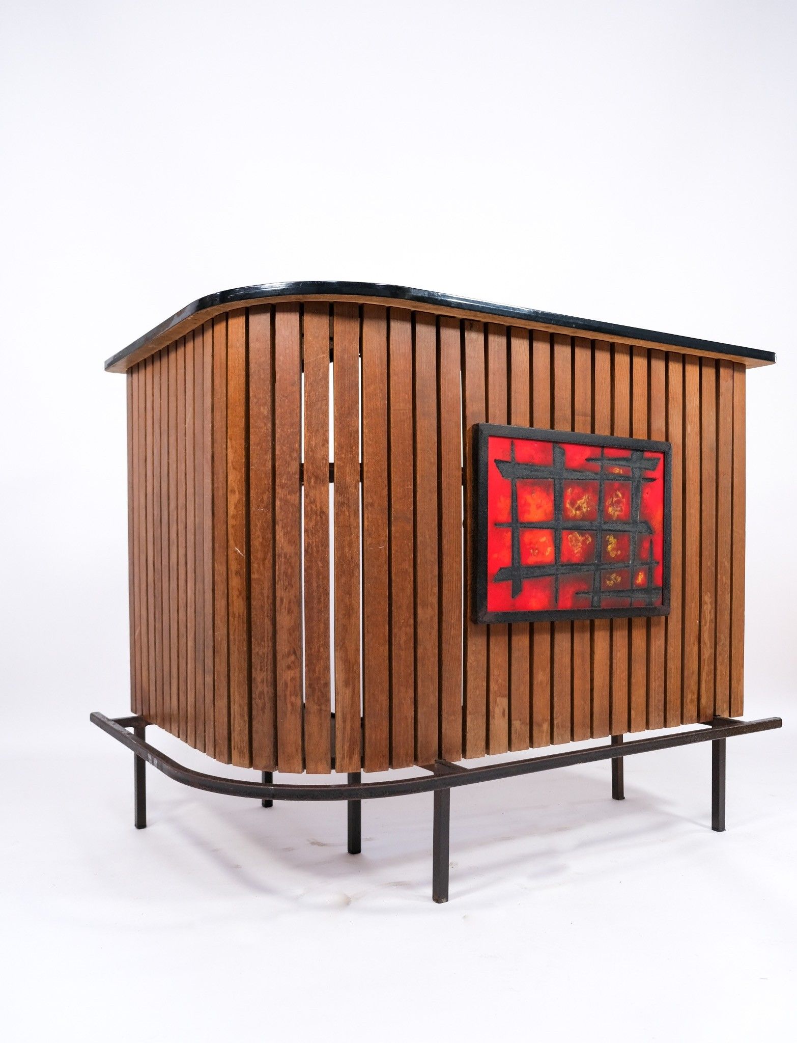 Attributed to Jacques ADNET (1900-1984), corner bar in ash strips, decorated with a large ceramic panel (47 x 34 cm) attributed to Robert (1930- 2008) and Jean CLOUTIER (1930- 2015). Resting on a blackened metal base. Work of the 1960s. 101 x 86 x 118 x 36.5 cm approx.