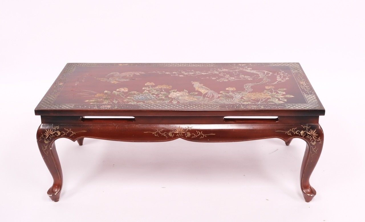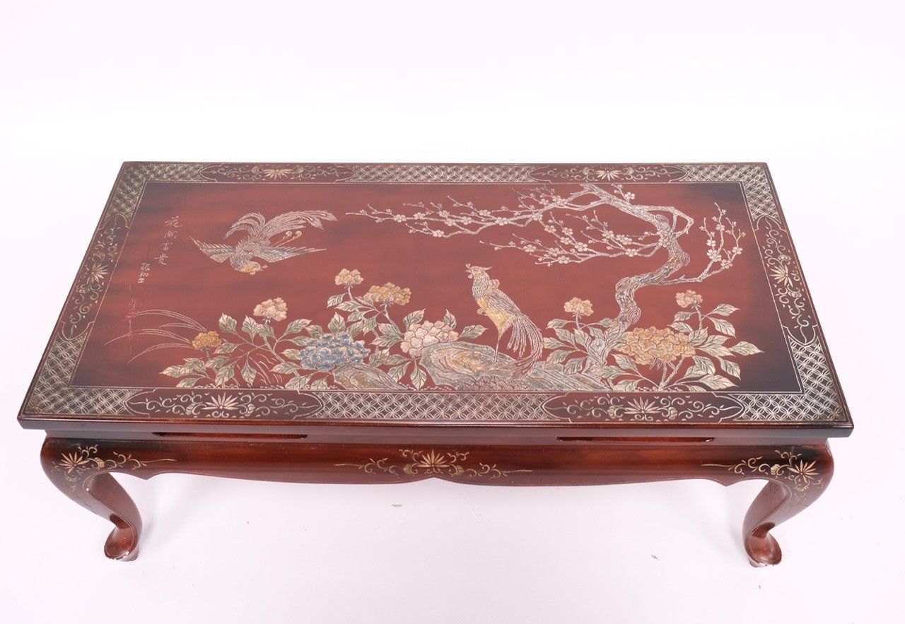 Carved and lacquered wood coffee table. Modern work in the Chinese style. 39 x 100 x 50 cm.