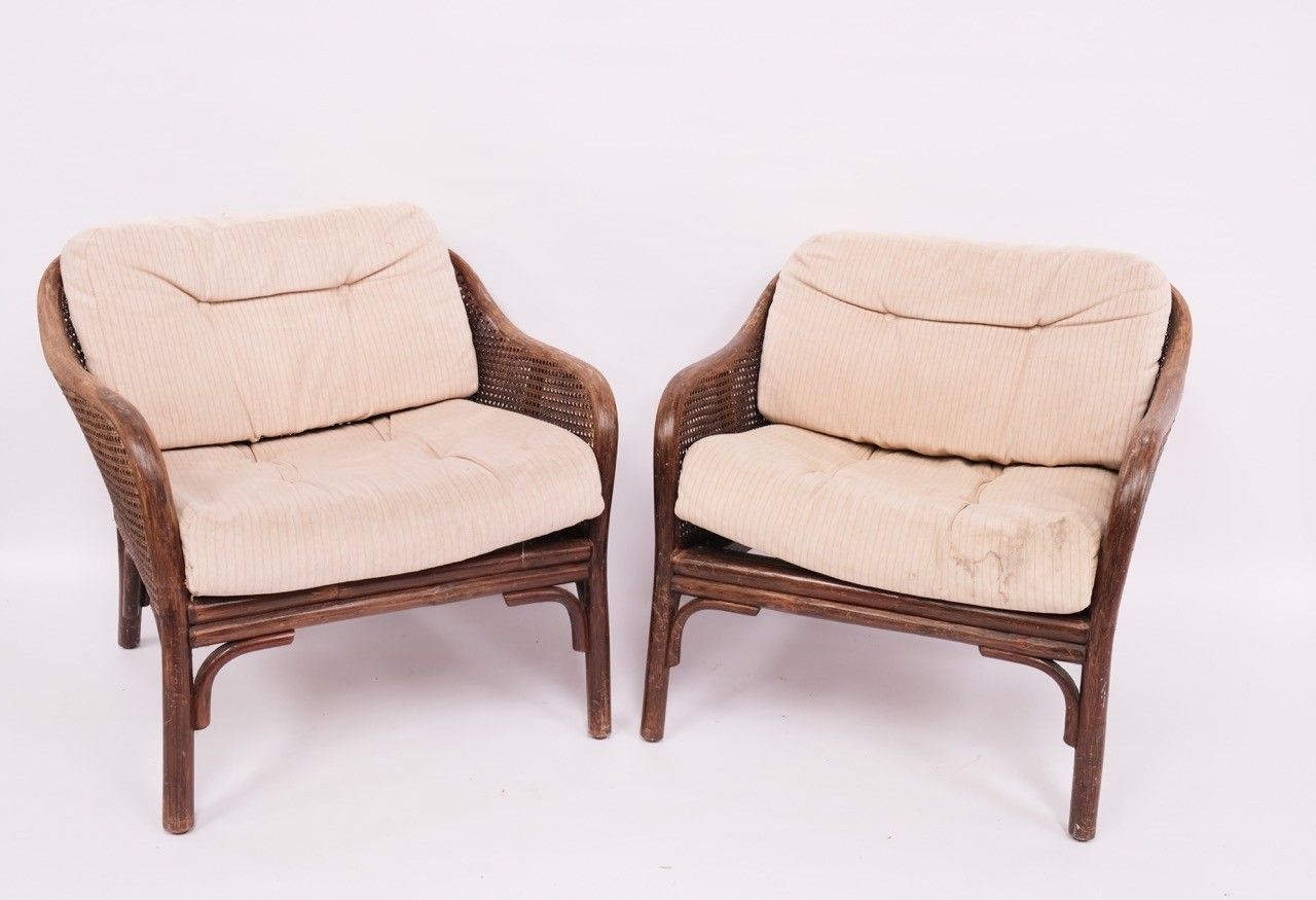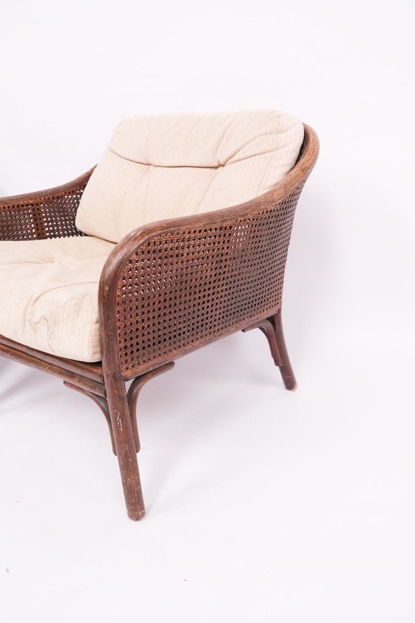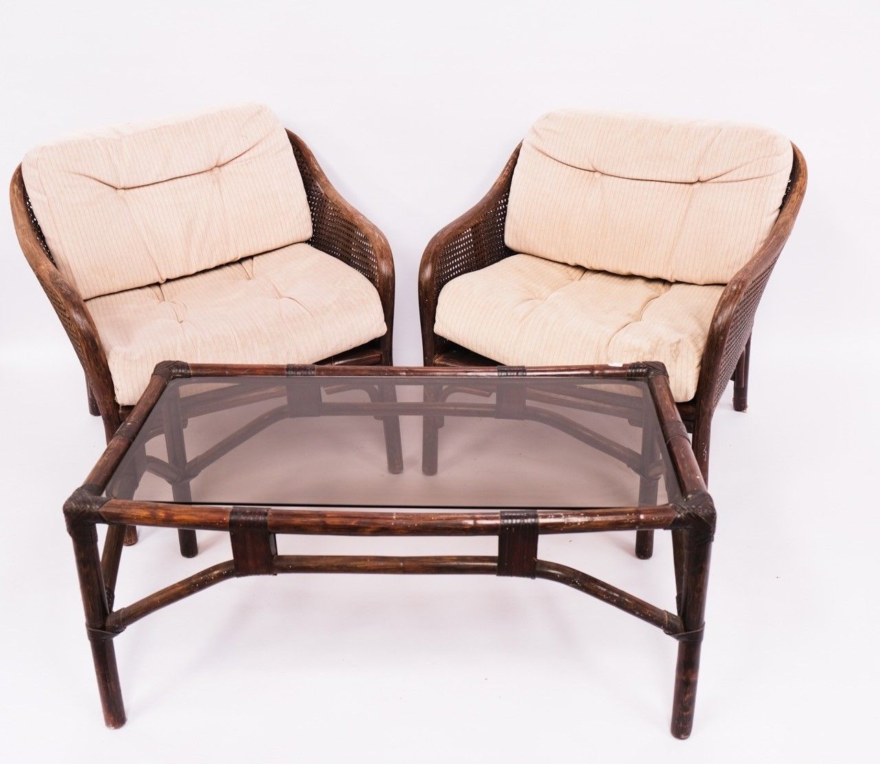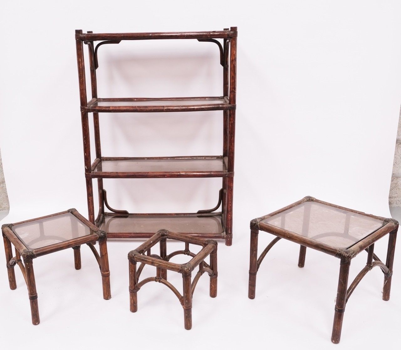 Rattan lounge including 2 armchairs, 1 shelf, 3 nesting tables and 1 coffee table (worn)