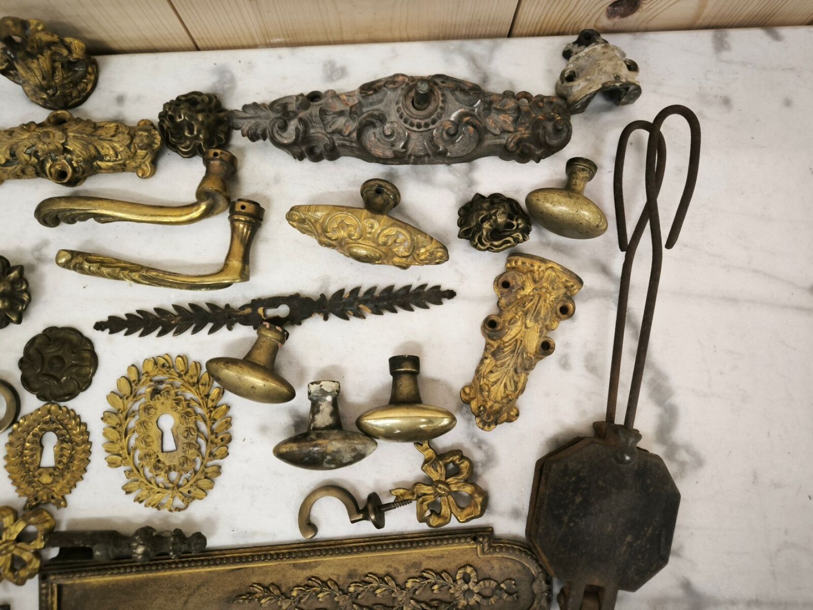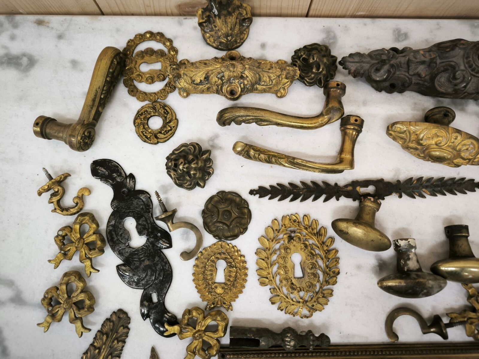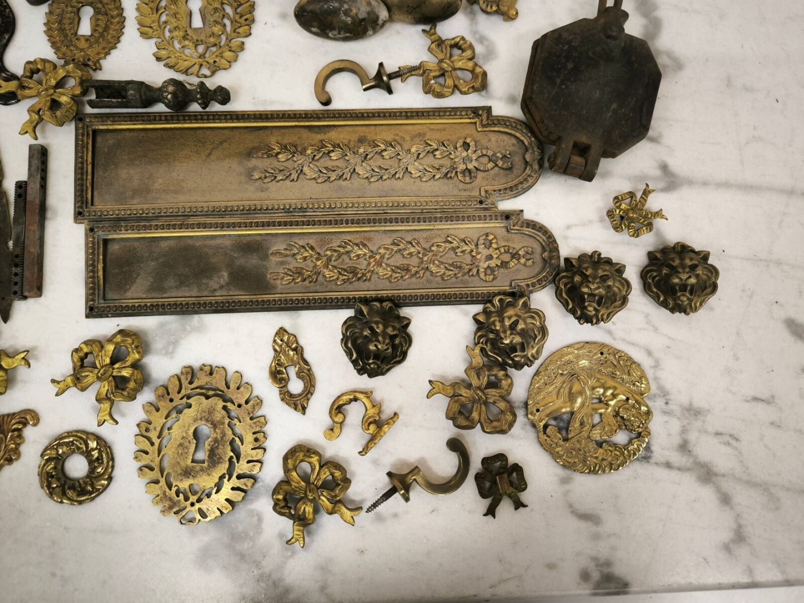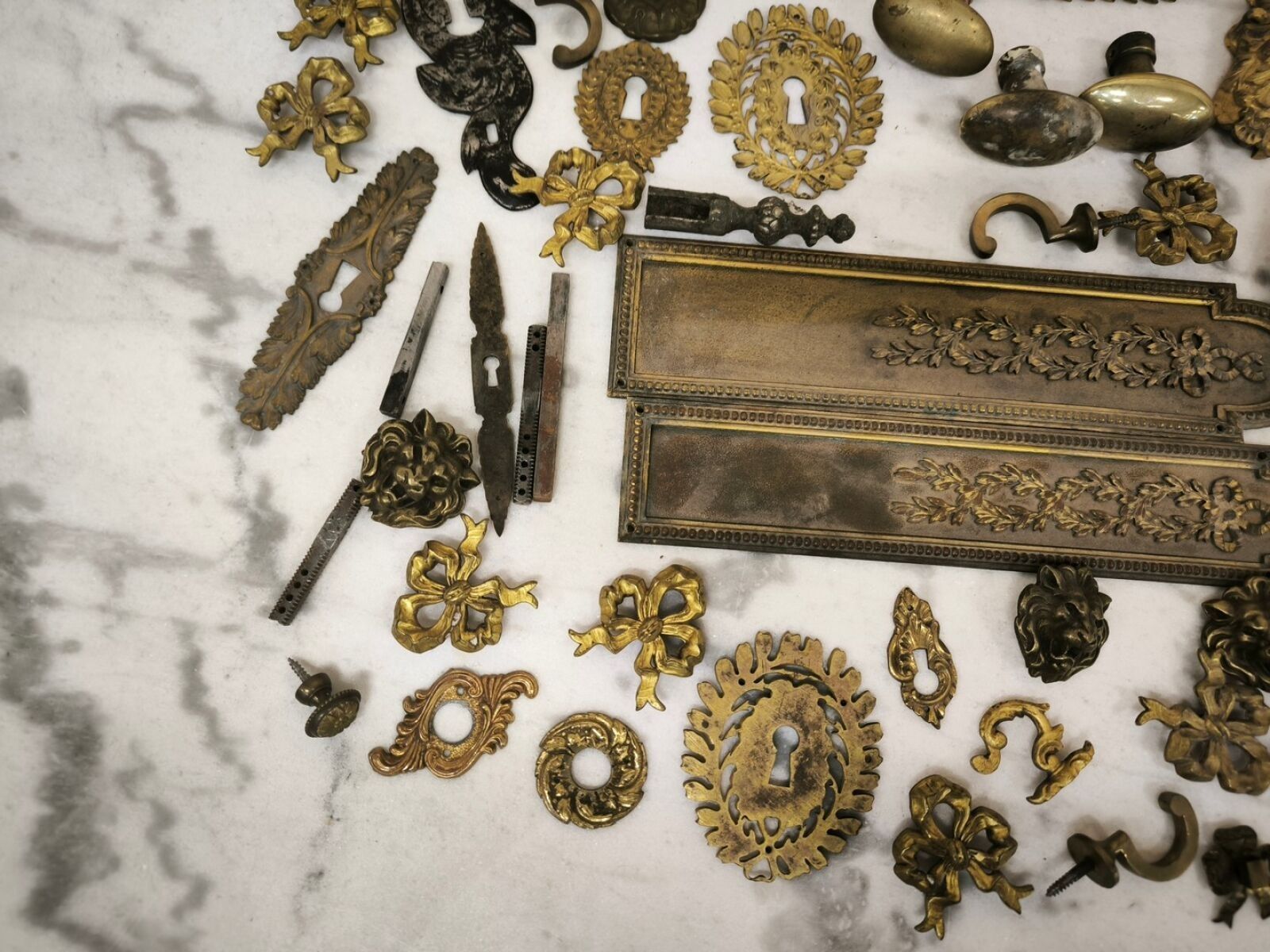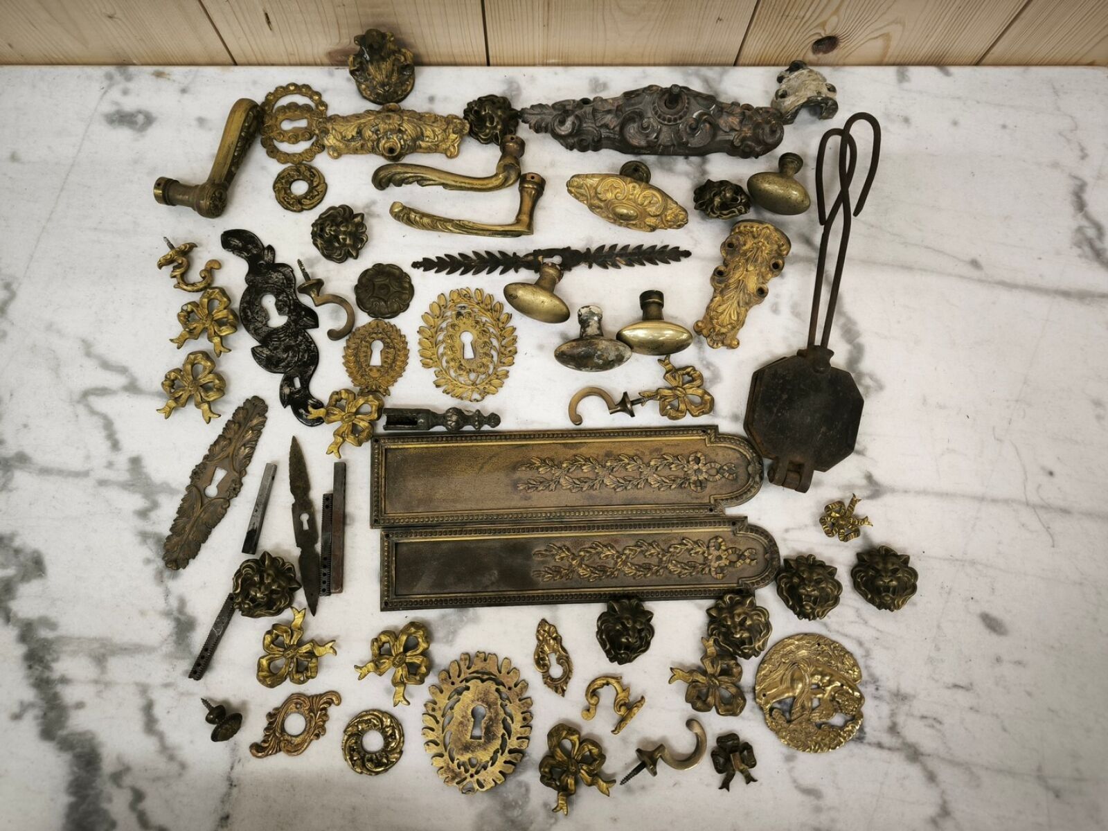 A set of furniture ornaments, including handles, lock escutcheons and miscellaneous. A waffle mould is included.