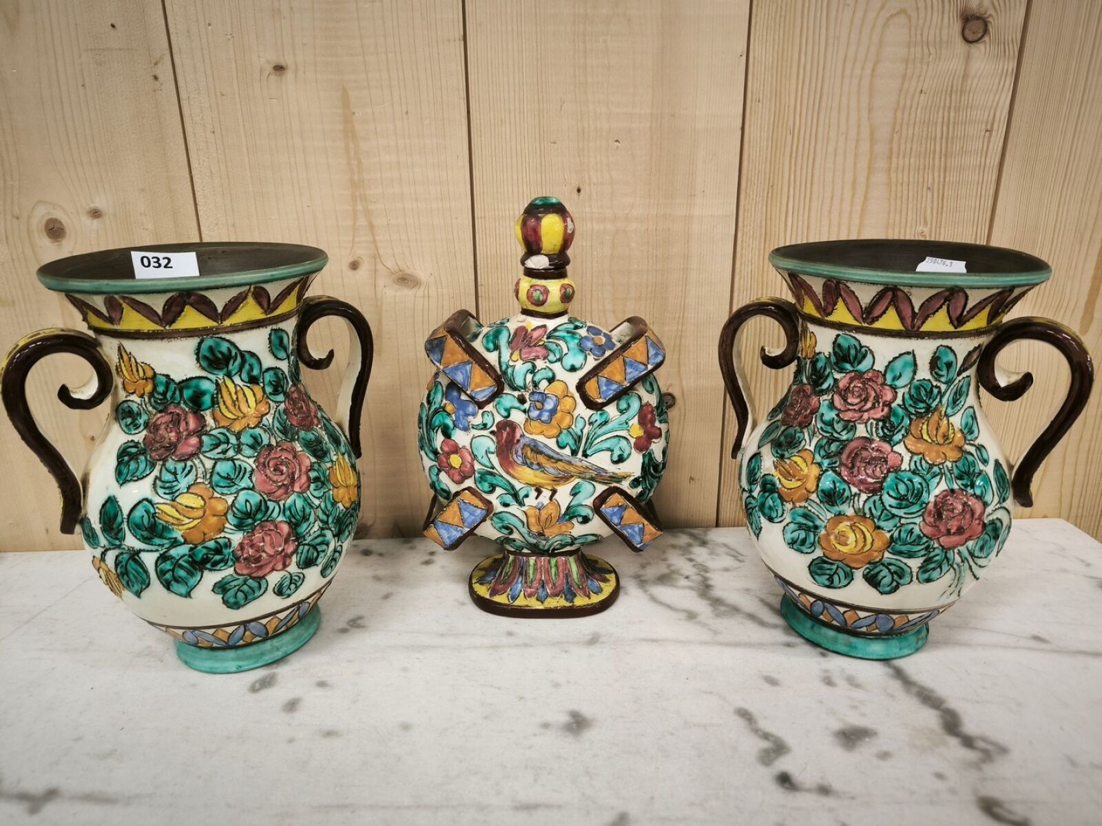 Ceramic mantel set including a pair of vases and a gourd (accident to the stopper)