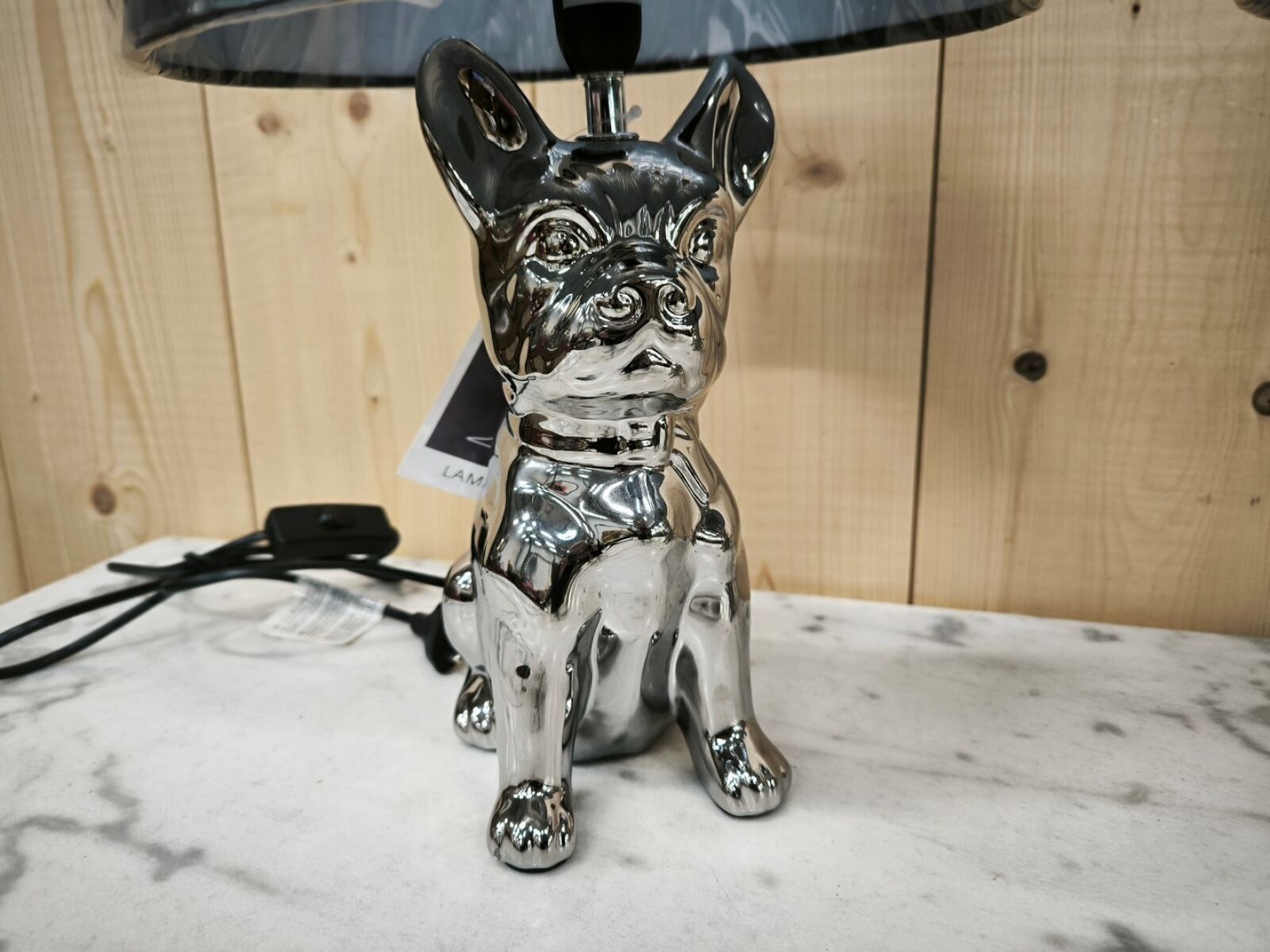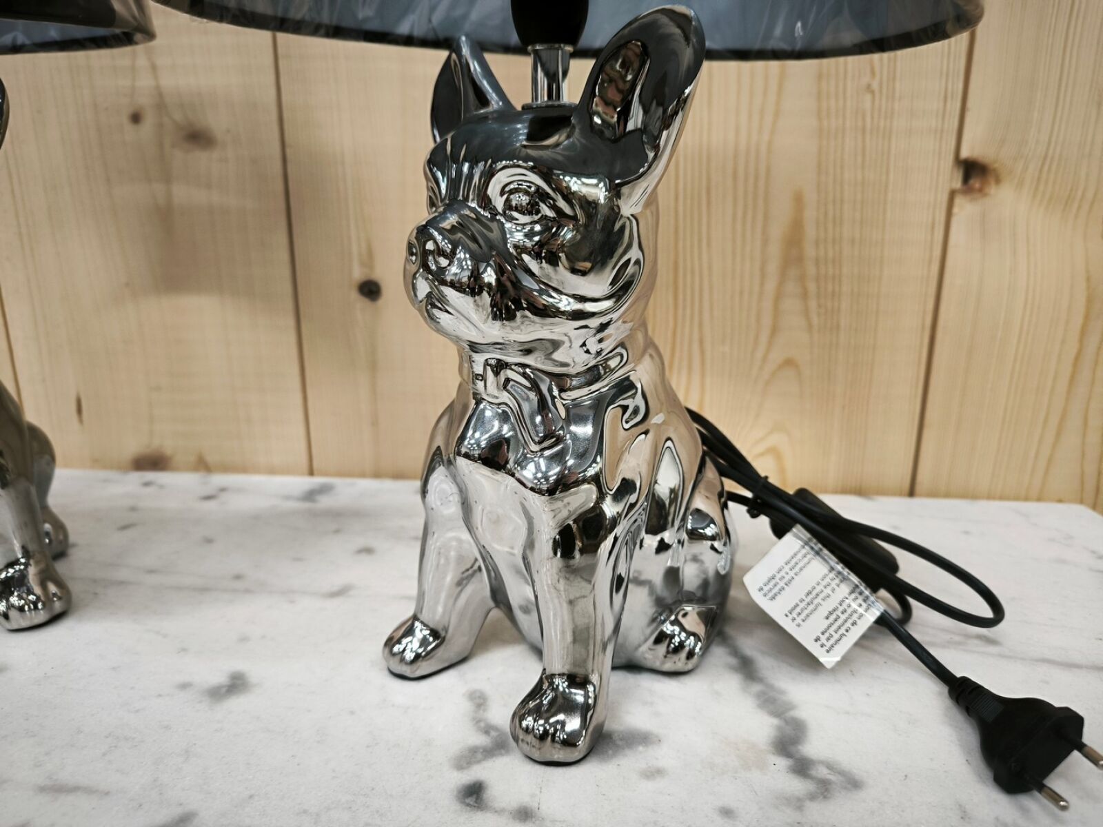 Pair of bulldog-shaped lamps in silver-glazed ceramic.