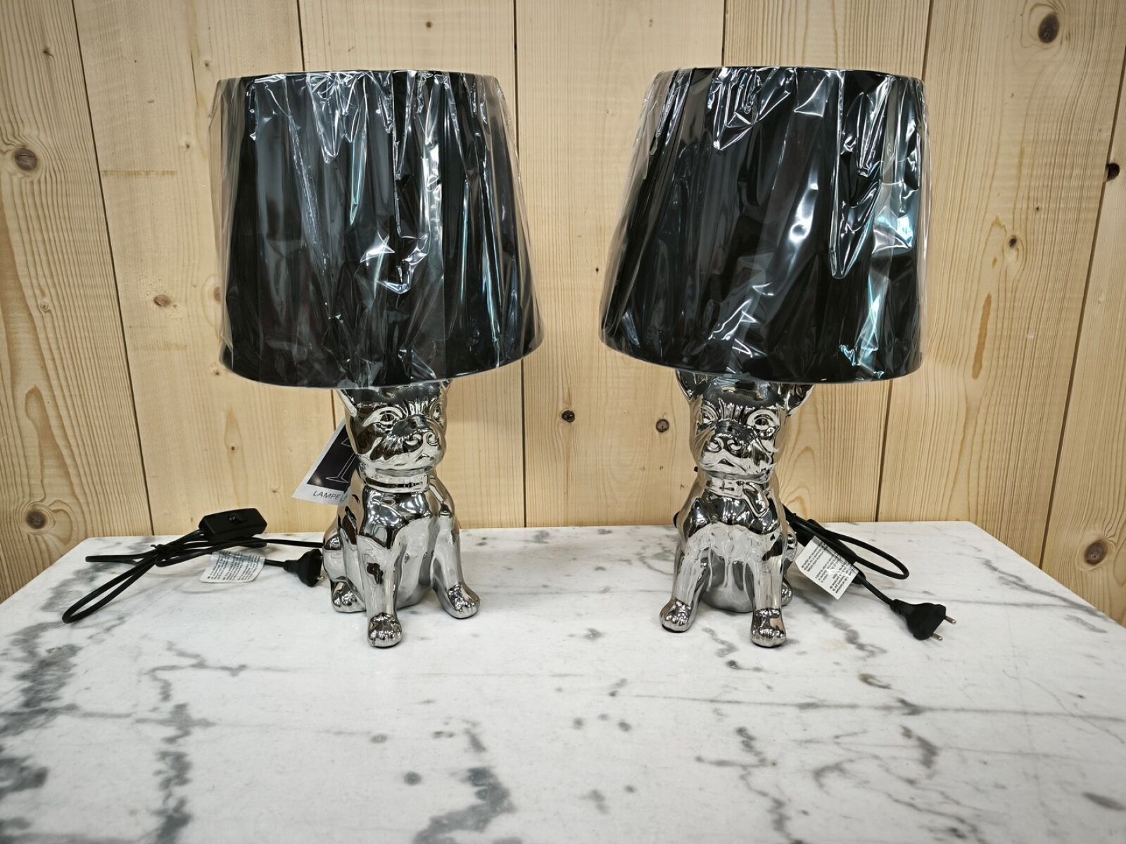OSTARIA Pair of bulldog-shaped lamps in silver-glazed cerami…