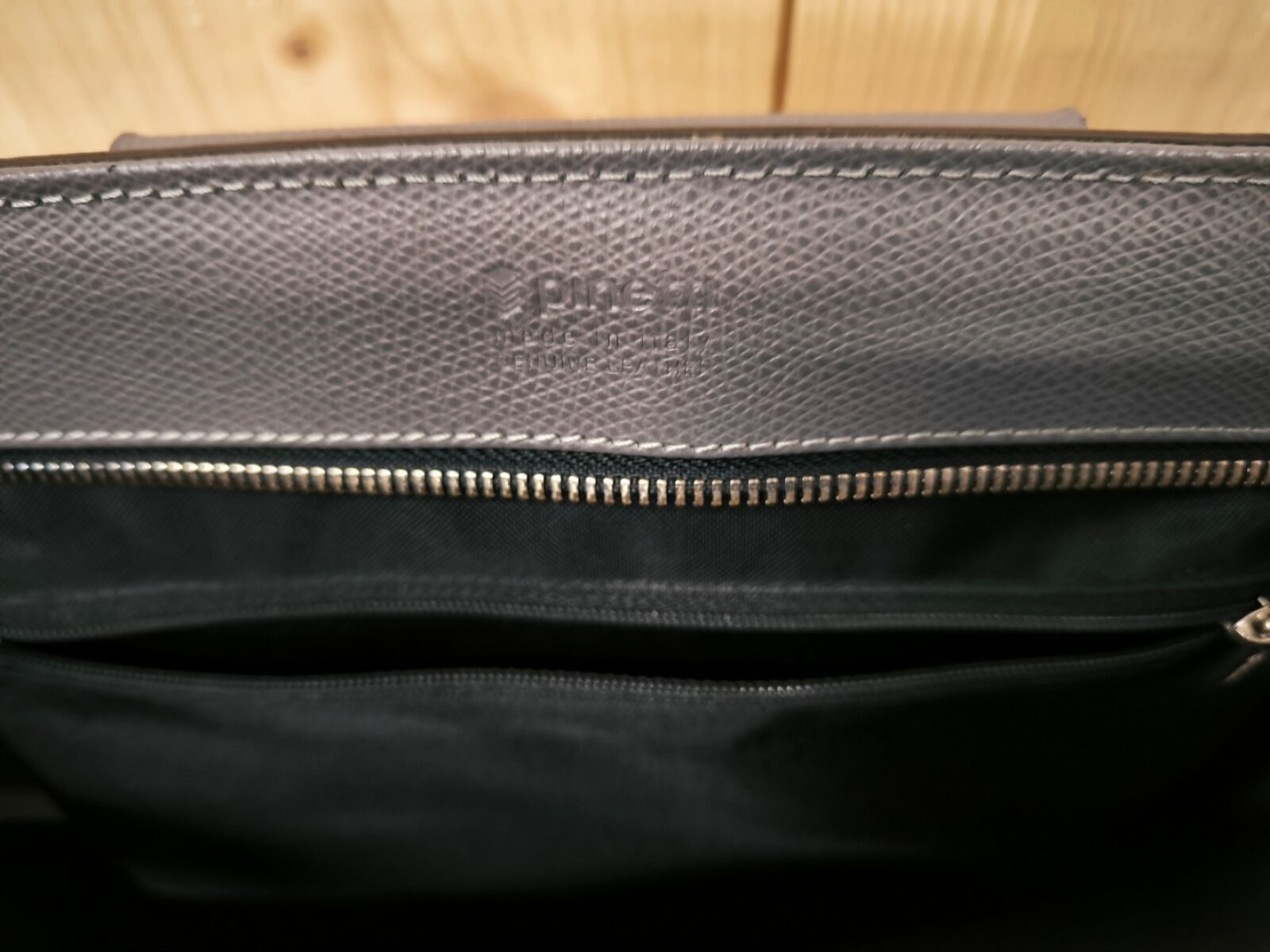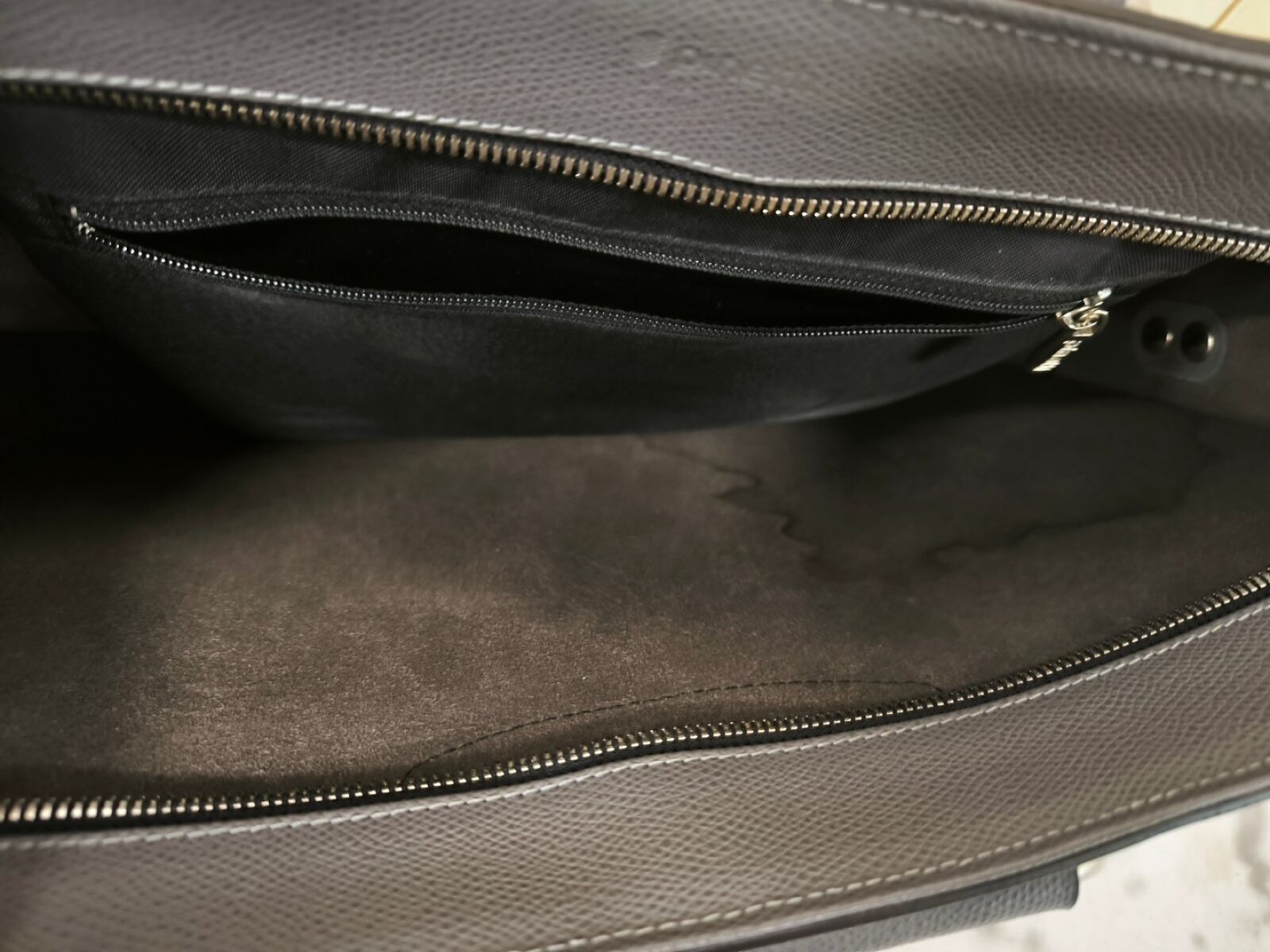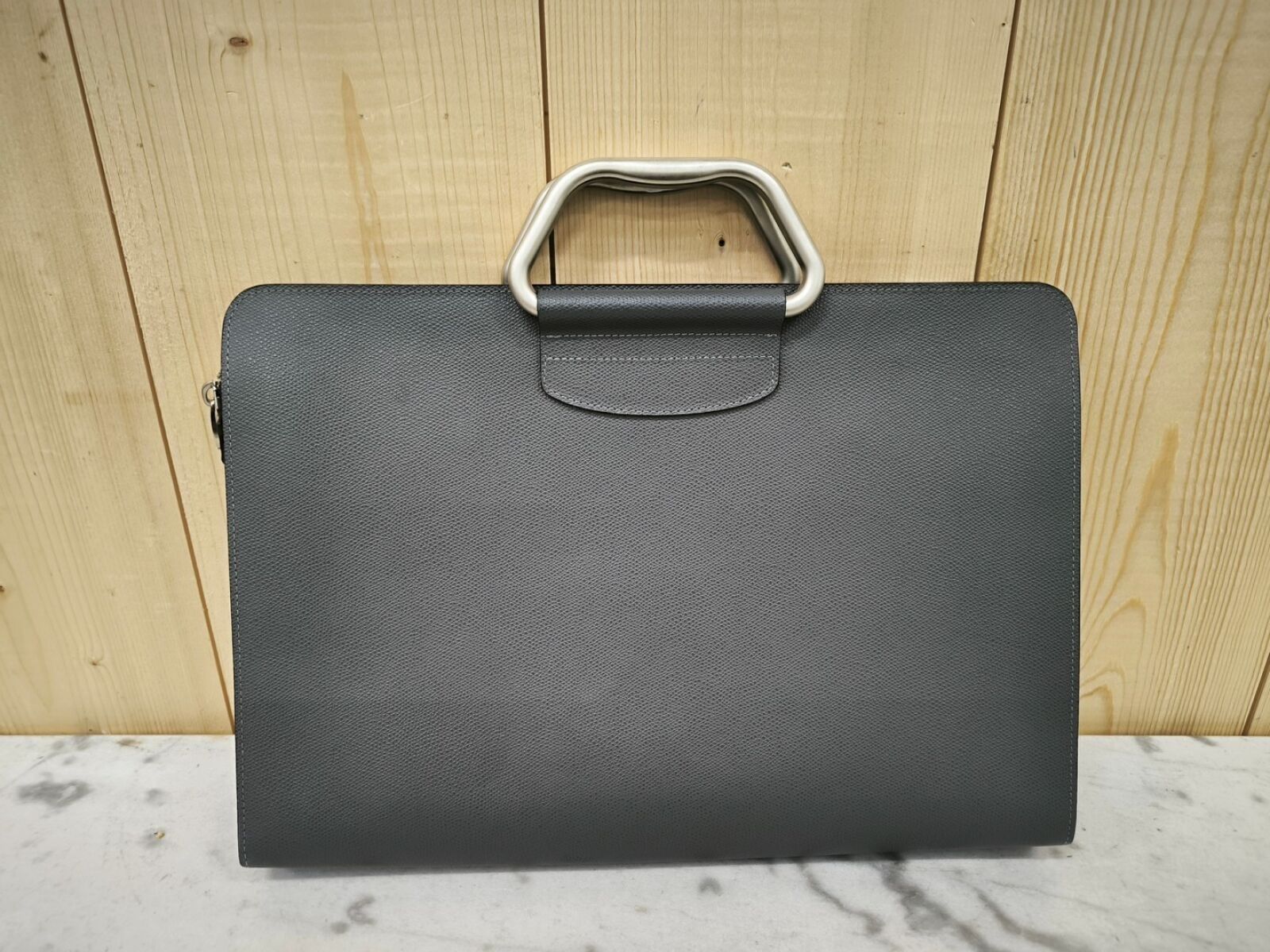 Grey leather briefcase.