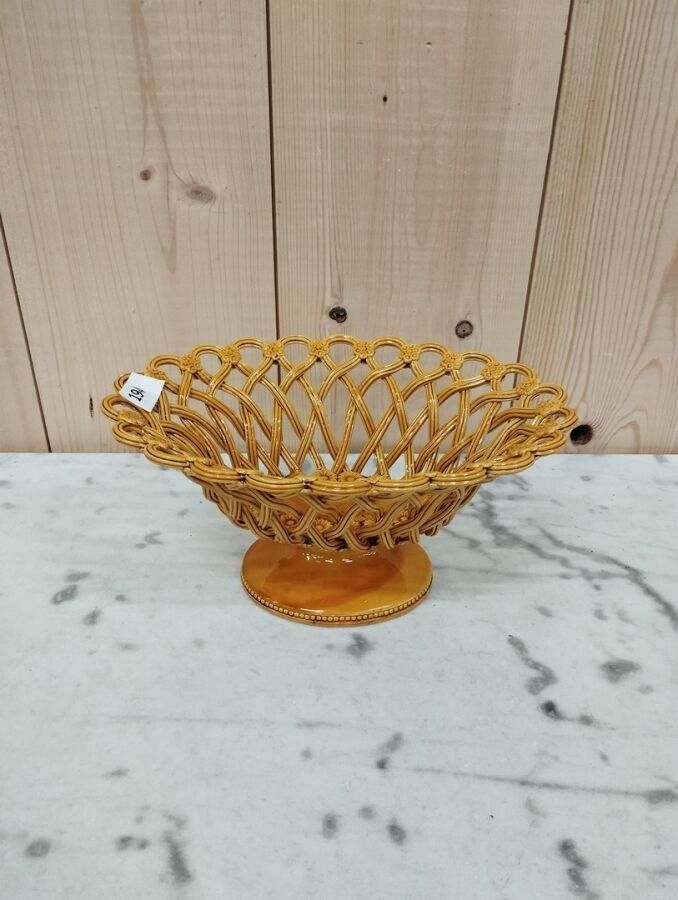 Yellow enamelled ceramic bowl on a shuttle-shaped foot.
