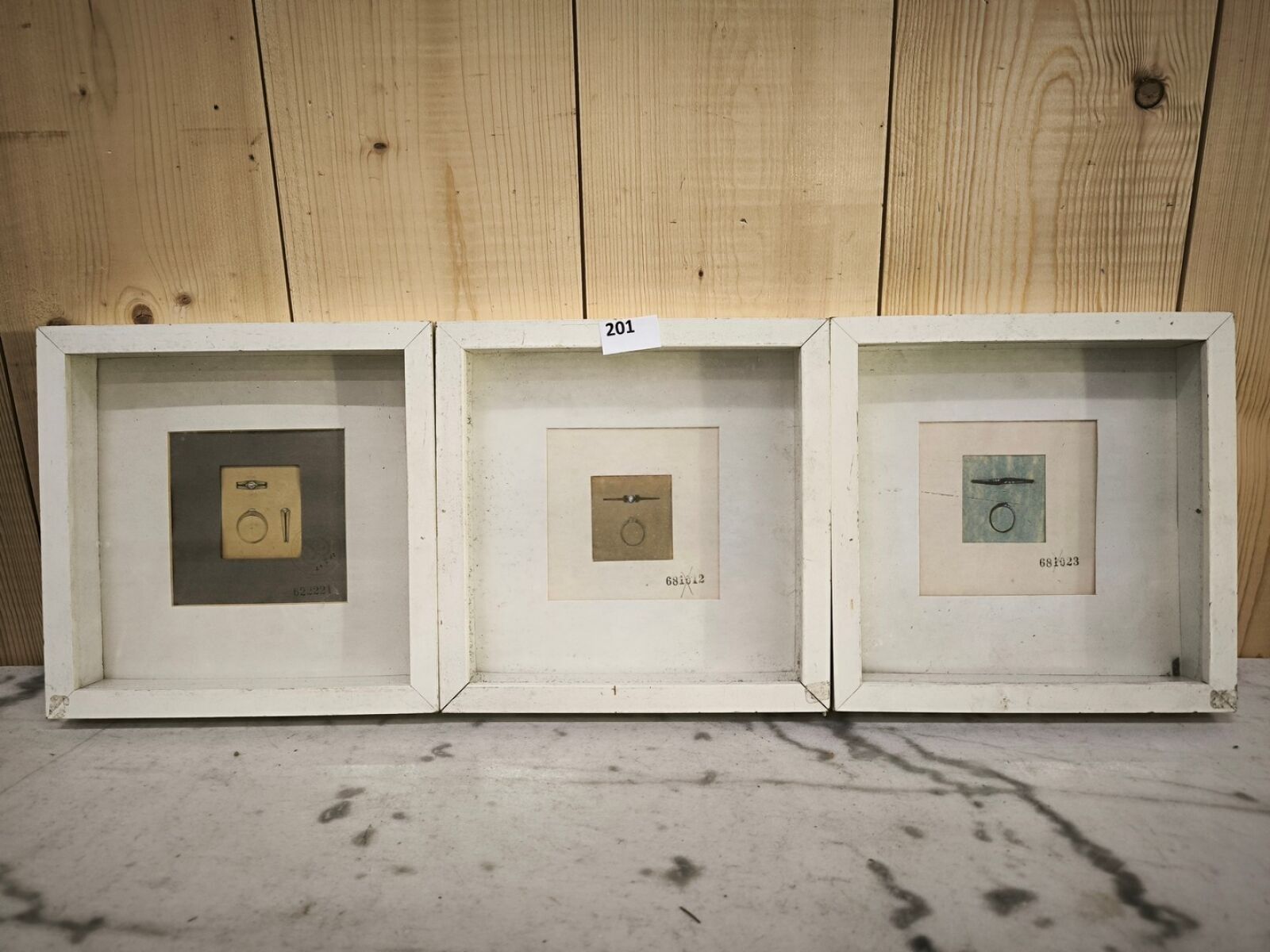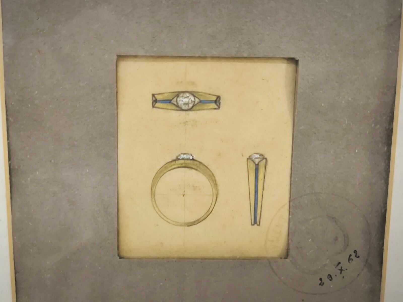 [Jewellery] Suite of three preparatory drawings or jewellery projects, circa 1960. Framed.