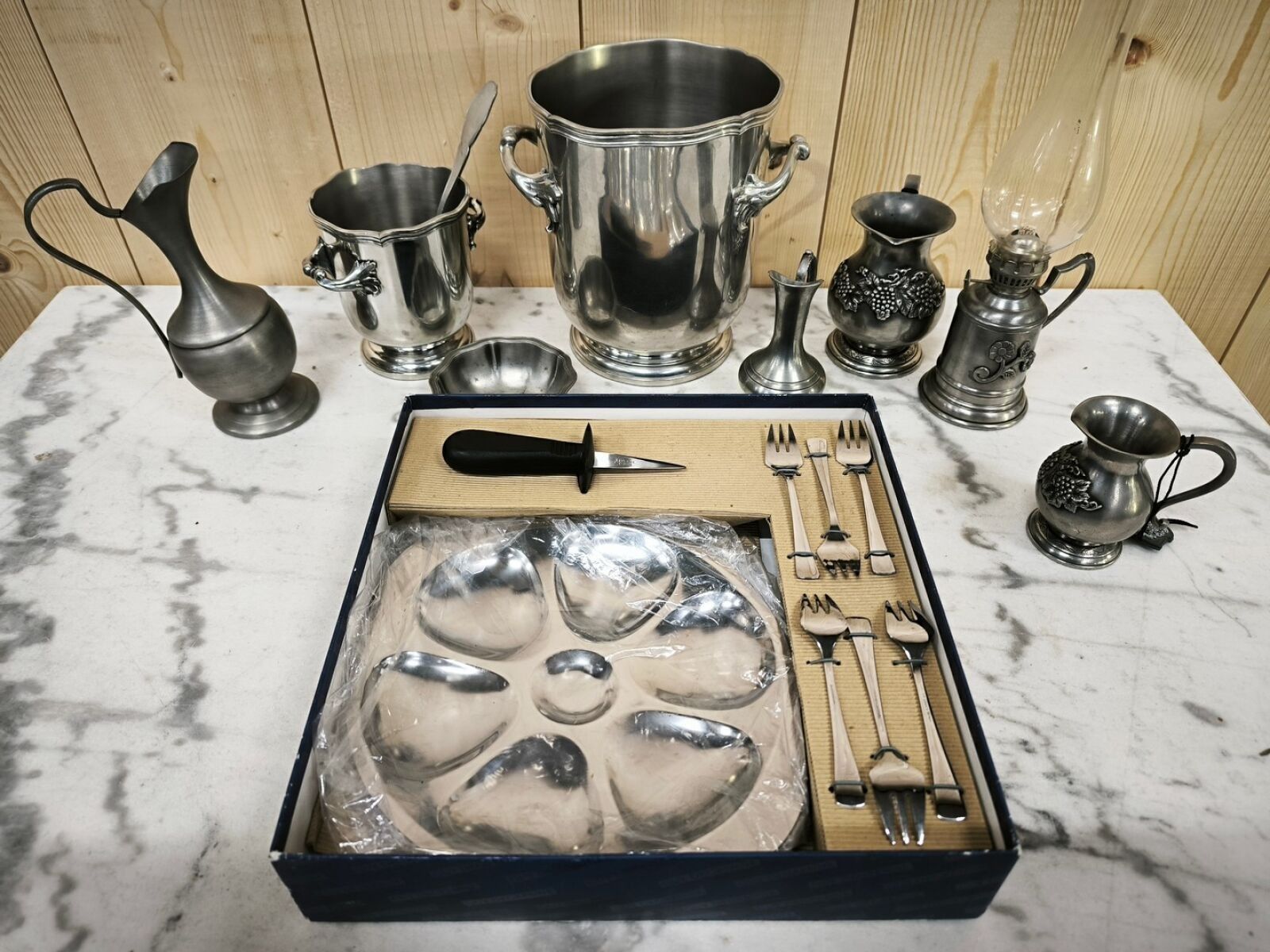 A set of pewter tableware including a bottle bucket and an ice bucket, together with a silver-plated oyster set.
