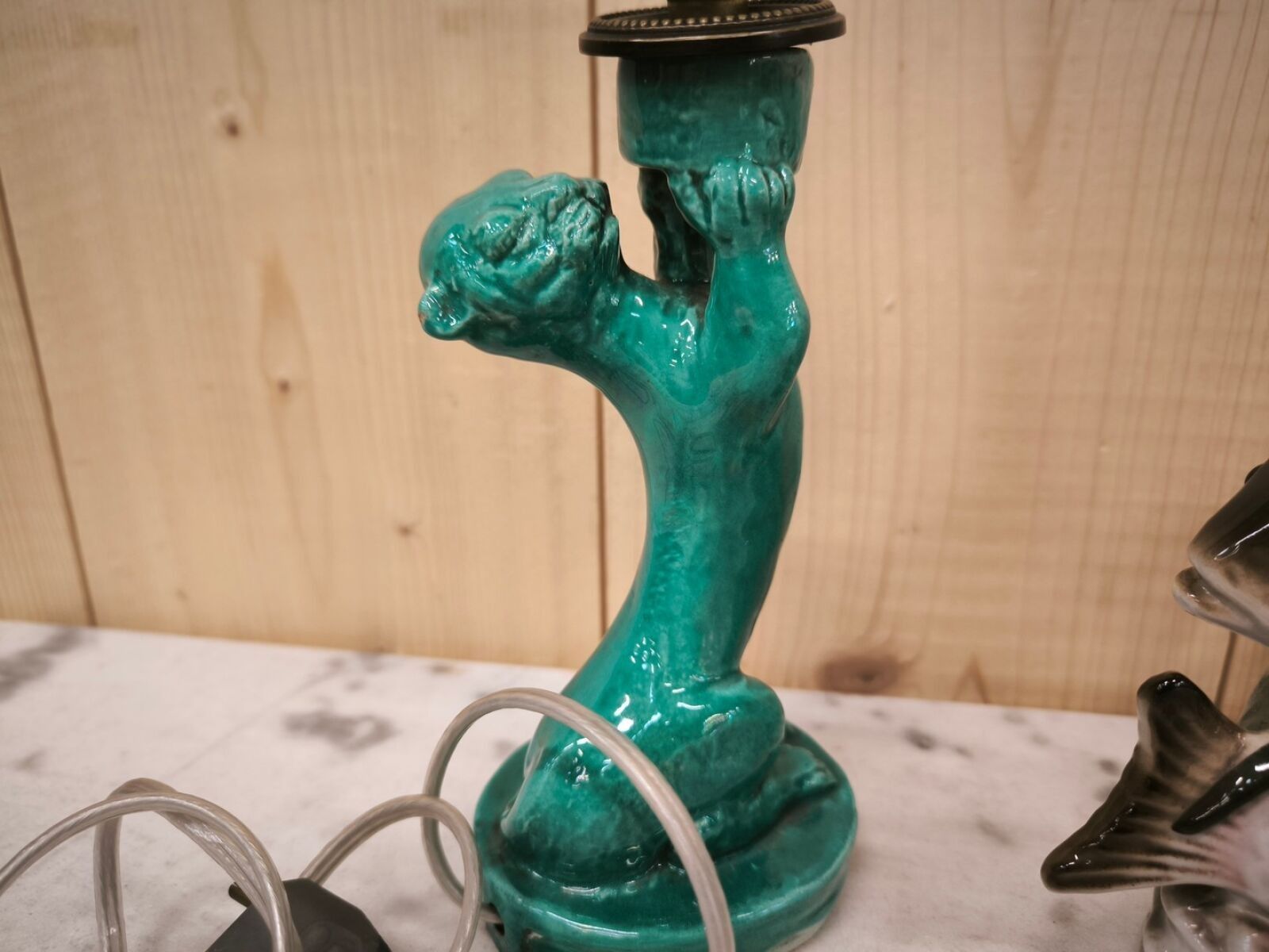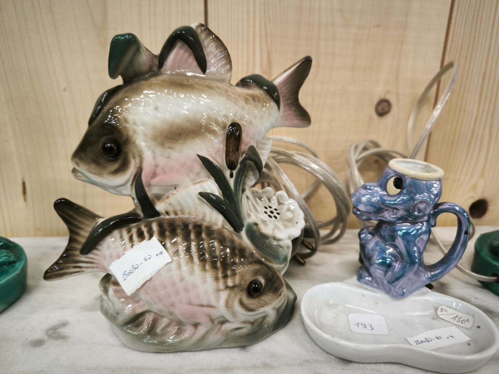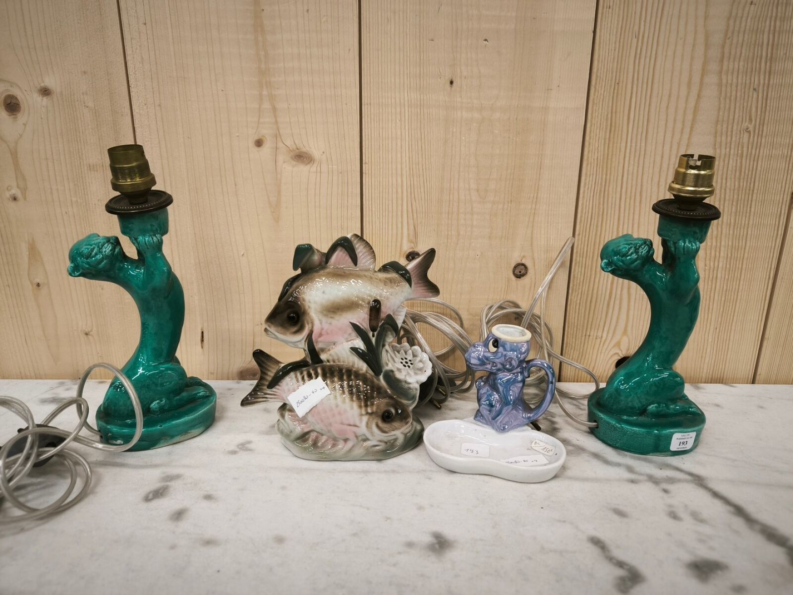 A set of zoomorphic ceramic subjects including a pair of otter(?) candlesticks, a fish nightlight and a monkey hand candlestick.