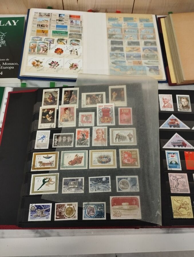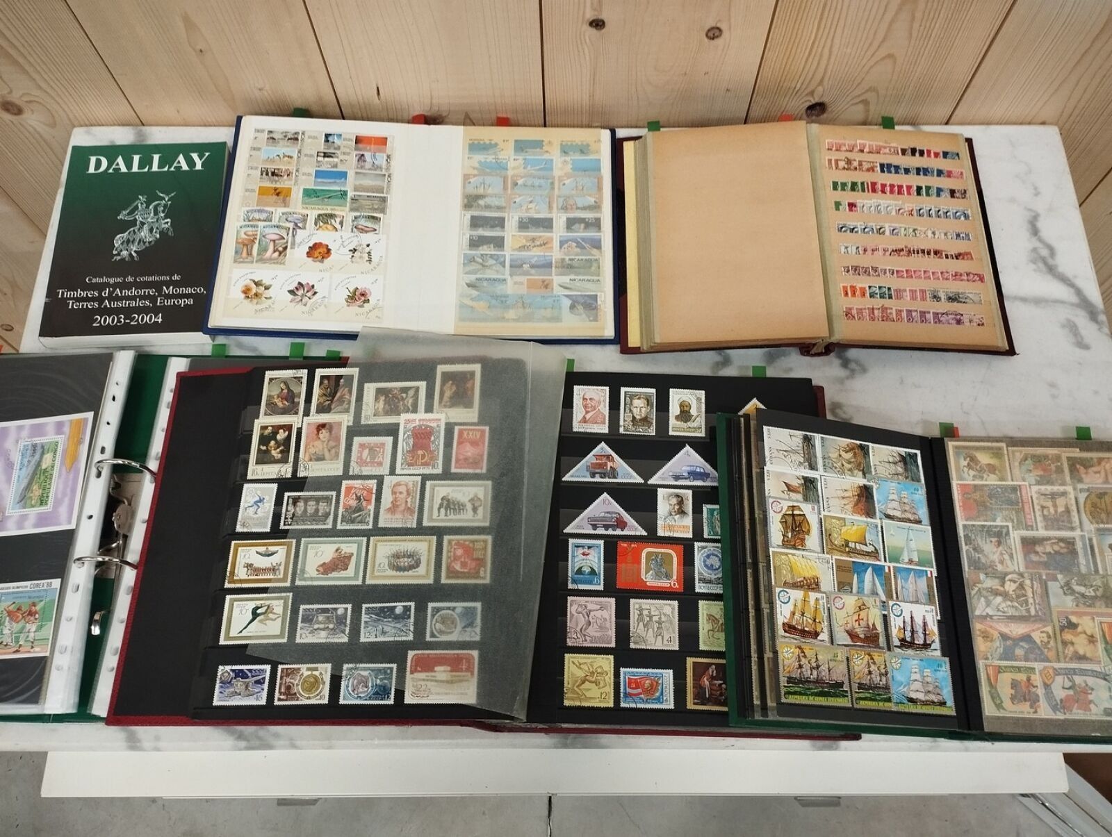Set of 5 albums of various foreign and colonial stamps, including 1 foreign souvenir sheet album (over 150), 1 Russia album, 1 World album, 1 colonial album, 1 Nicaragua album, and 1 Dallay quotation catalogue.