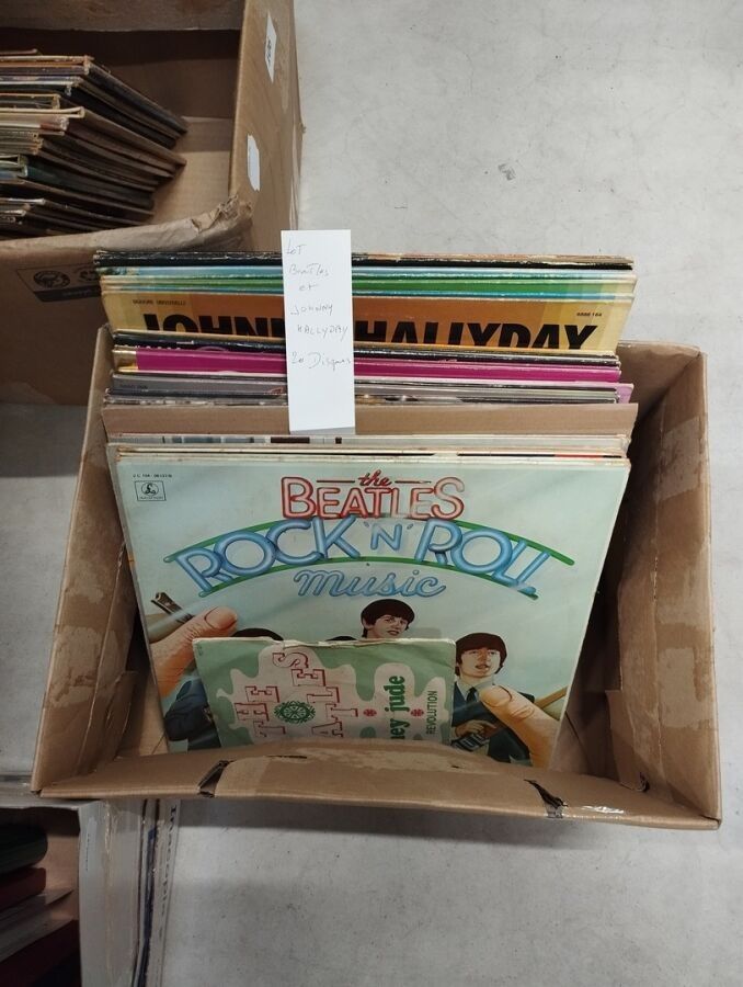 Set of 33T vinyl records by The Beatles and Johnny Halliday.