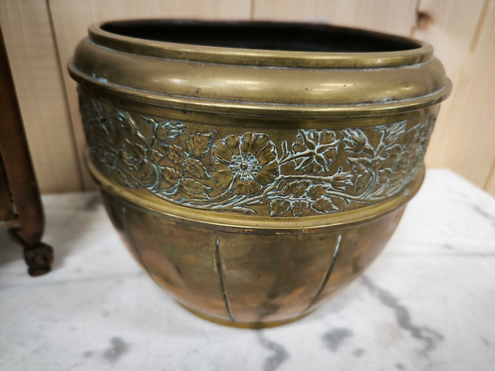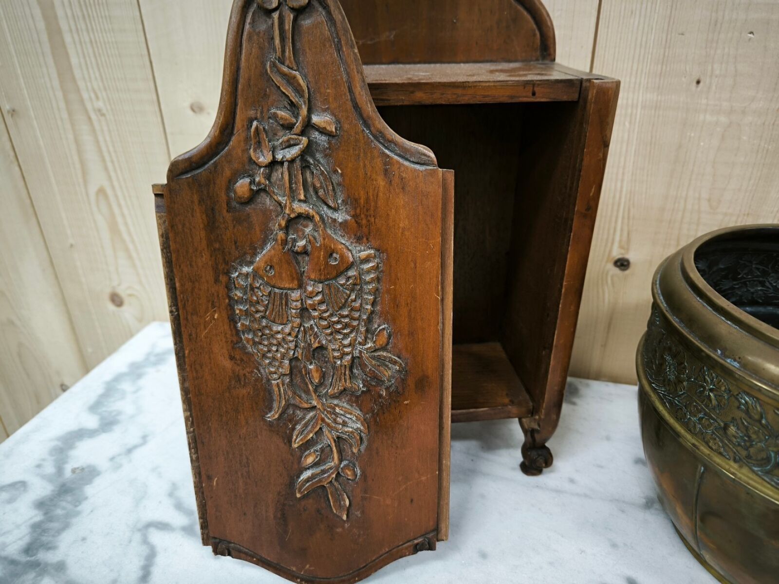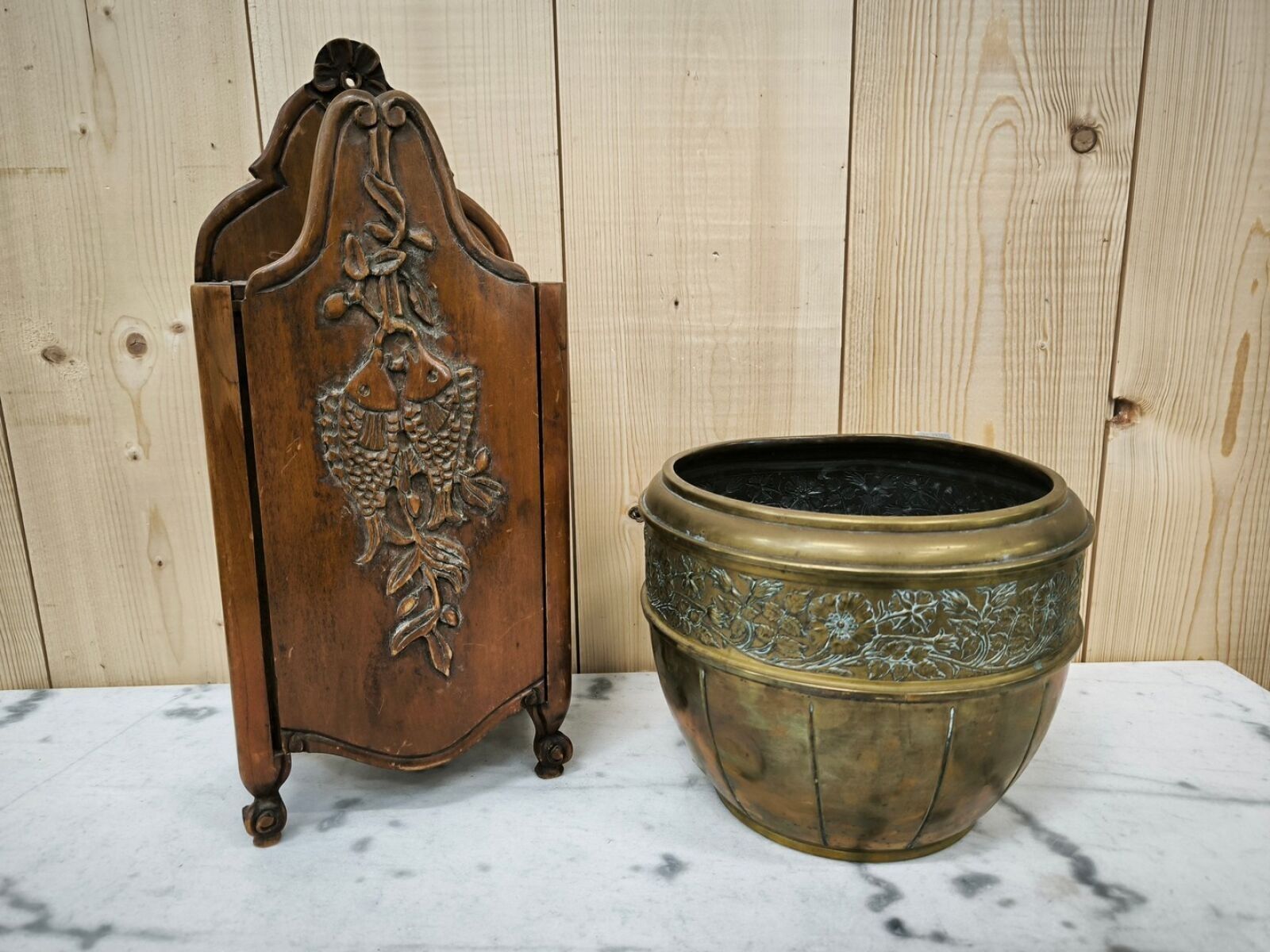 A set comprising a Provençal carved wooden flour container with a fish motif (H. 45 cm) and a metal planter with an embossed frieze of flowers (H. 21 cm).