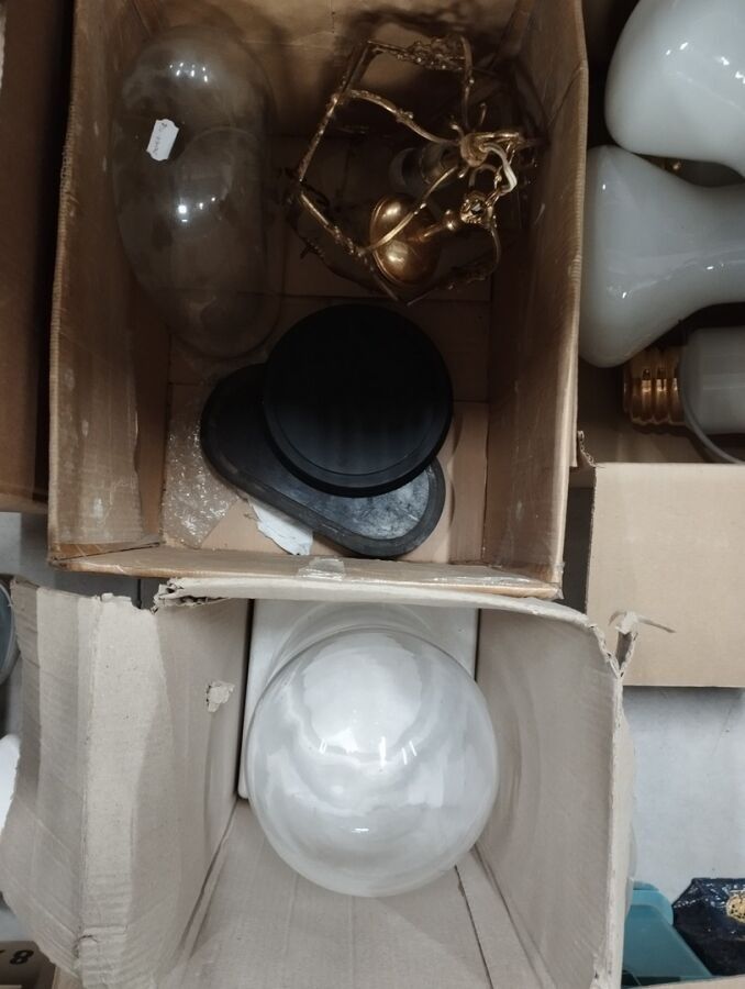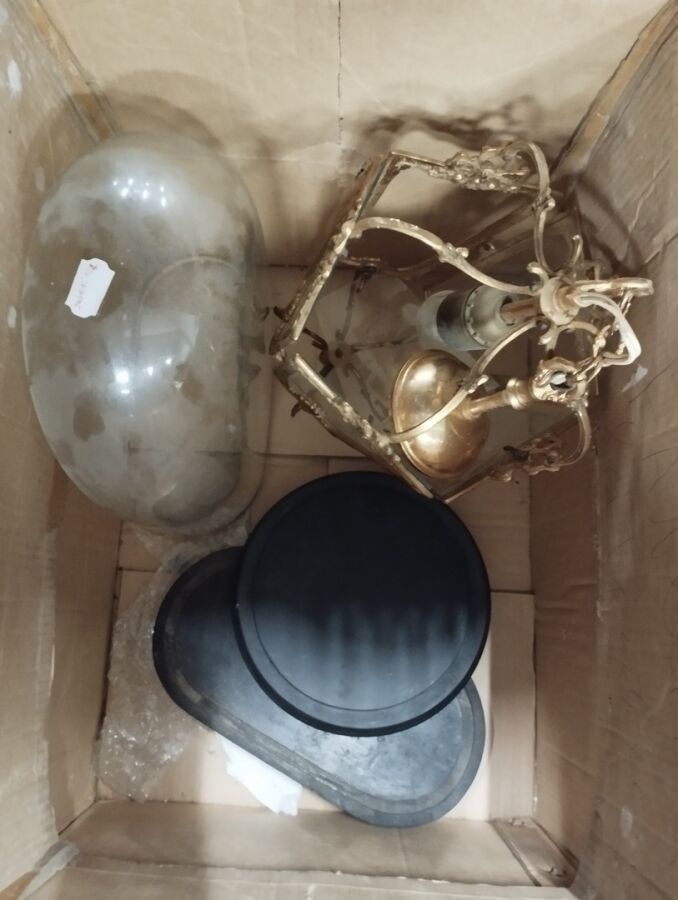 A lot of miscellaneous items including a bugle, a lantern, wooden skittles, modern globes and various decorative items. An eagle-shaped coffee table leg in green resin is included (the top is missing).