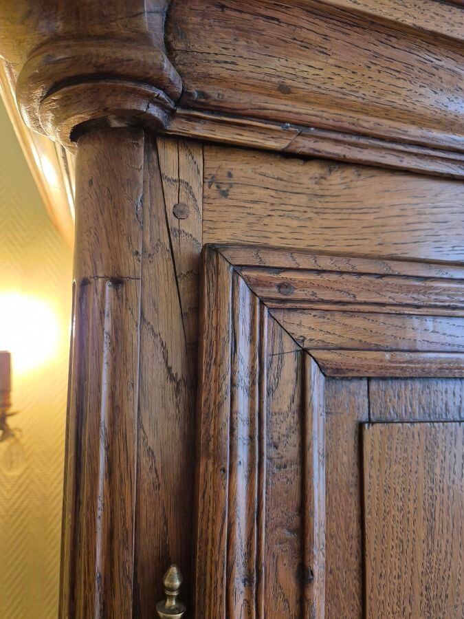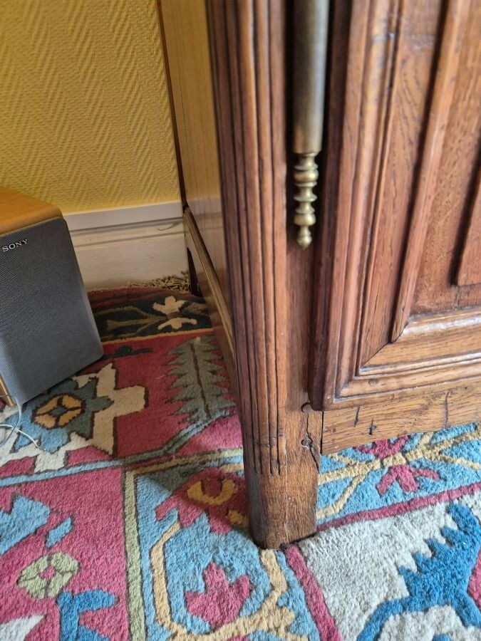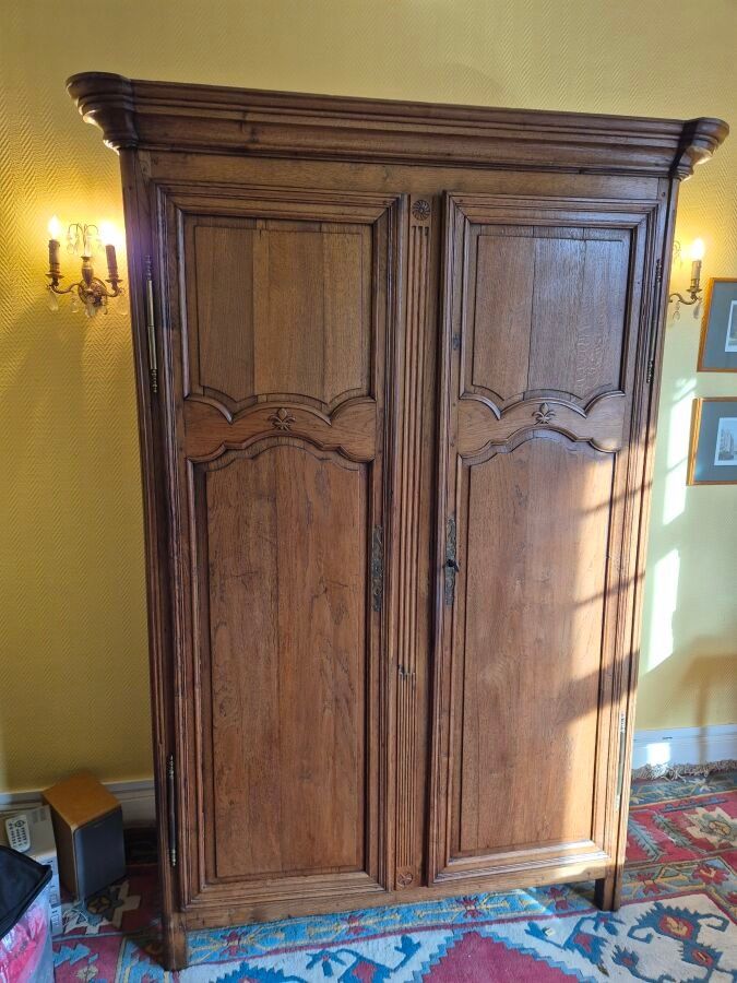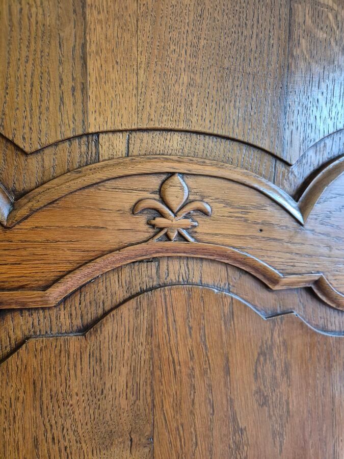 Natural wood cabinet moulded and carved with fleur-de-lys.