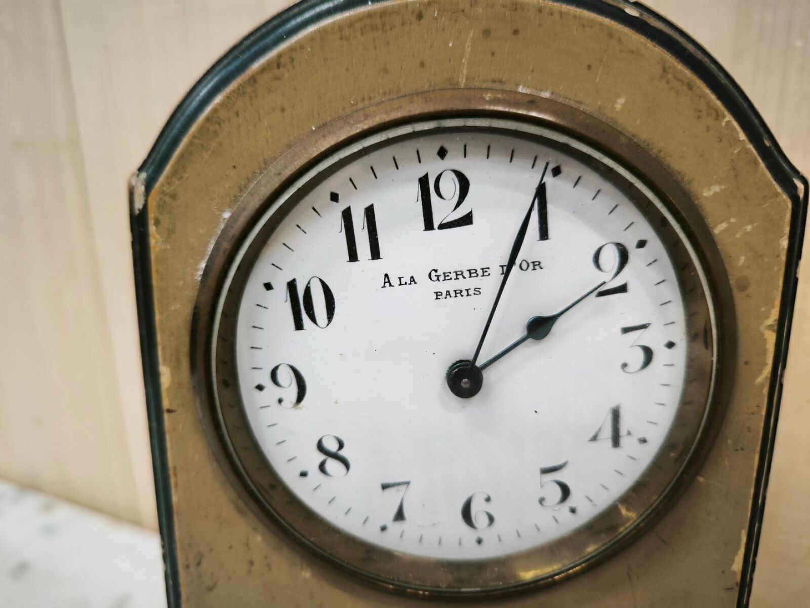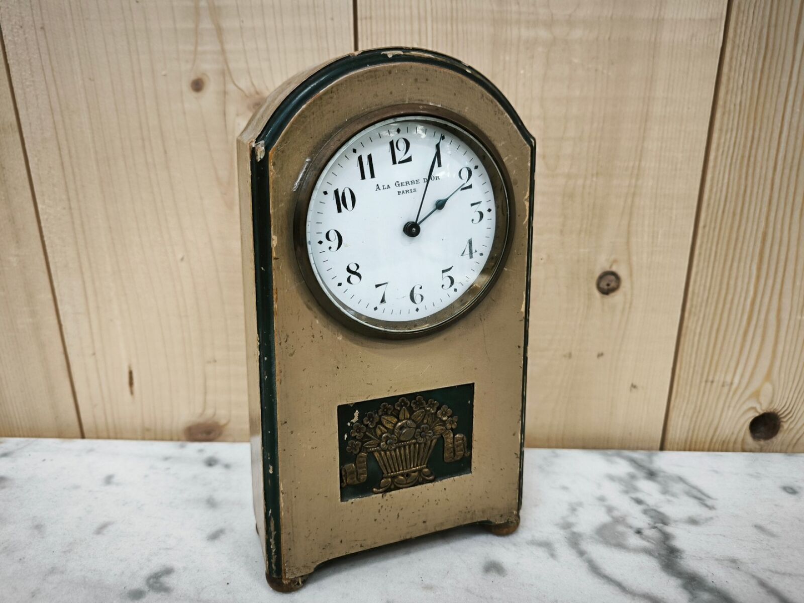 Moulded wood clock with applied decoration of a basket in gilt metal. The dial is signed "A la Gerbe d'or Paris".