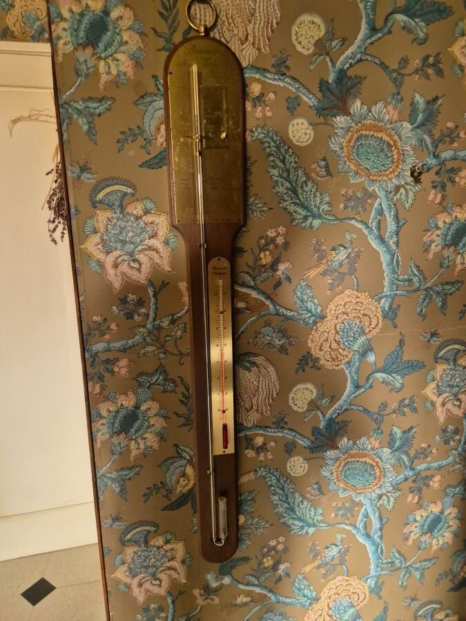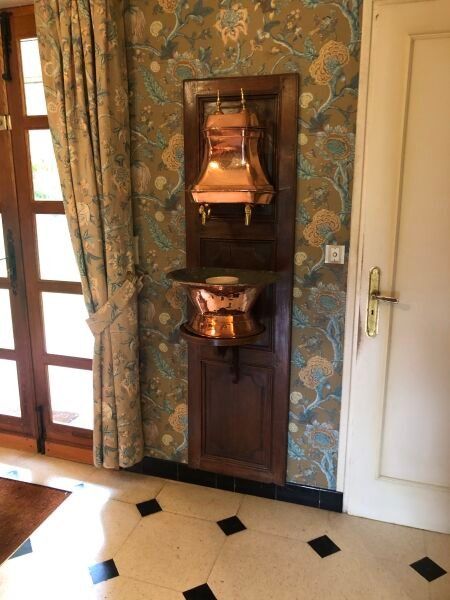 -Fountain and its basin in red copper, 18th century, on a panel forming a support in natural wood. Various copper shapes and a barometer are attached.