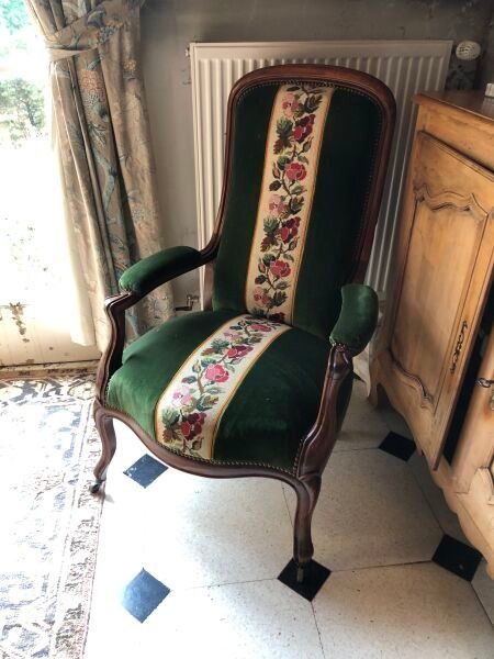 -Voltaire type armchair in moulded mahogany, green velvet upholstery, 19th century