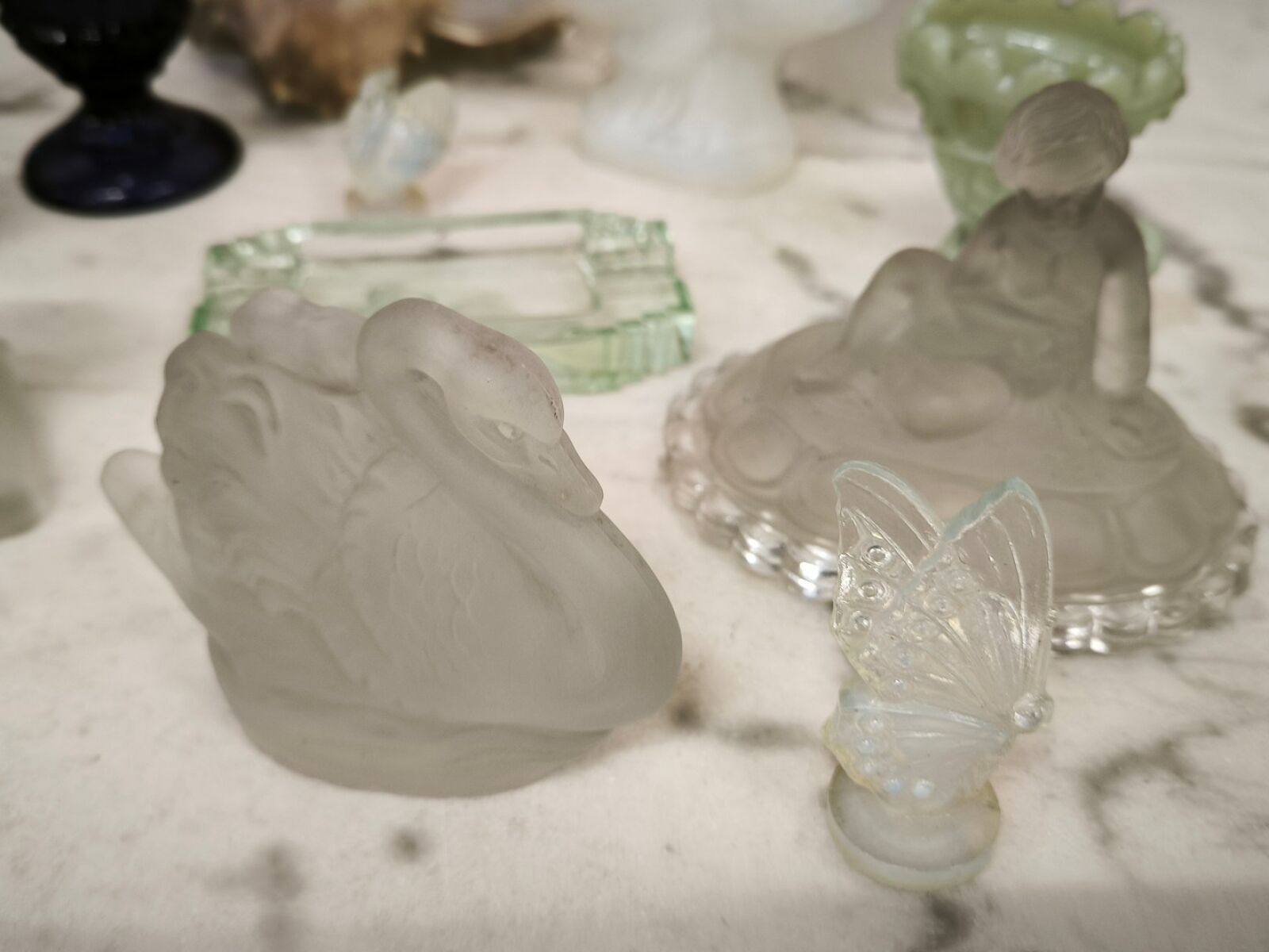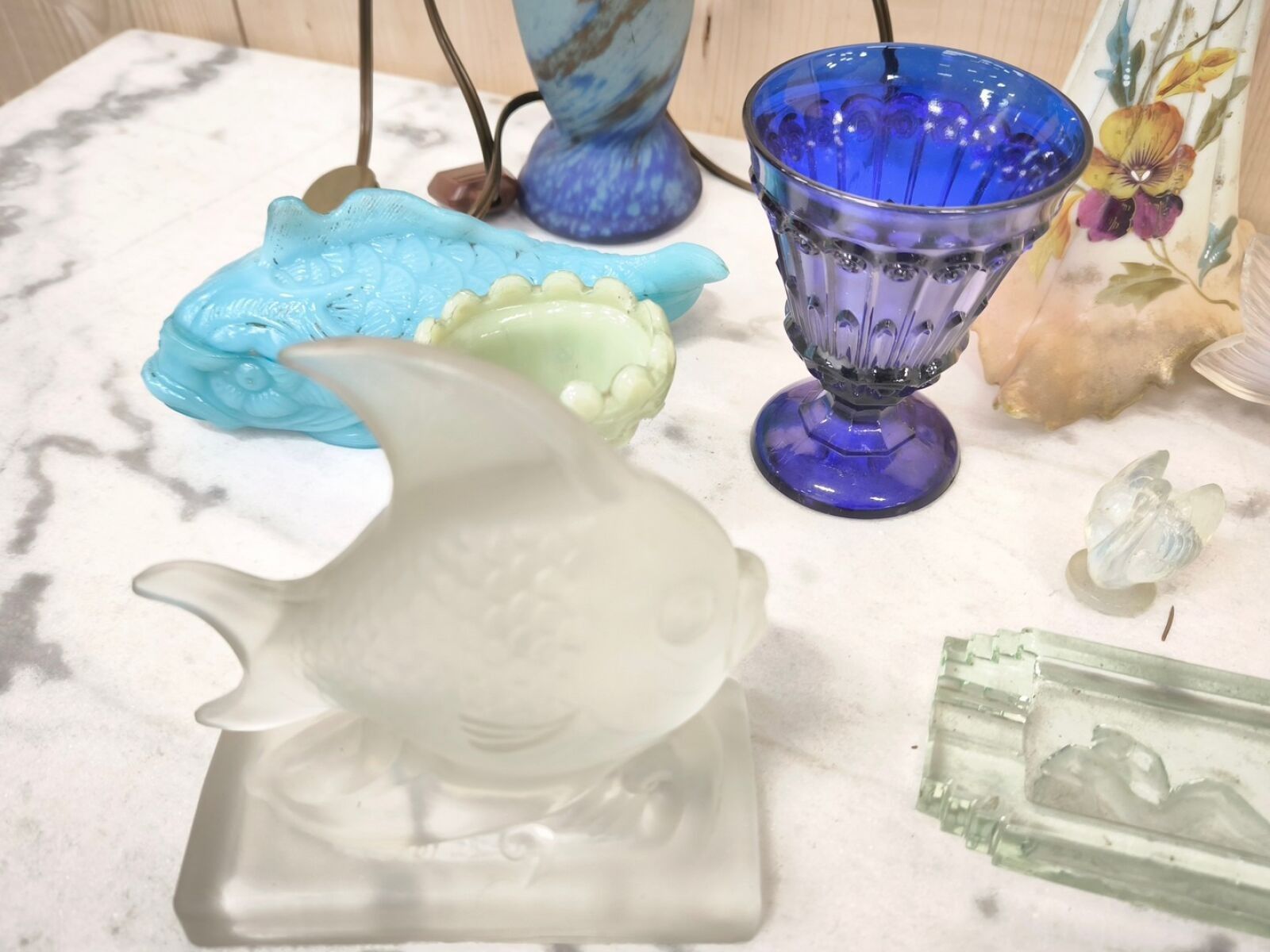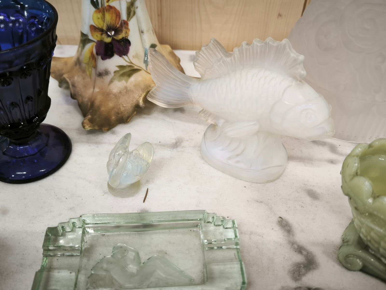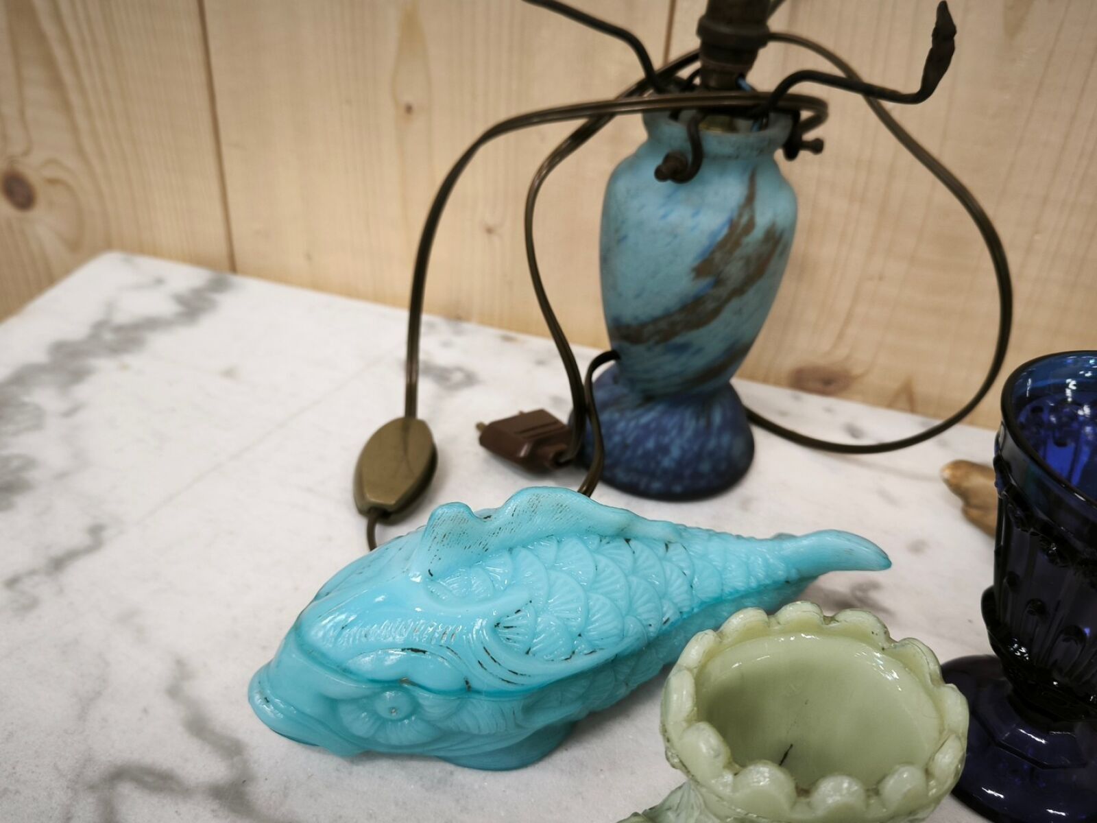 Set of various moulded glass or opaline subjects, including a fish in the Sabino style, and a fish-shaped box in blue opaline. A blue marmorated glass lamp base and an Art Deco moulded glass lampshade are included.