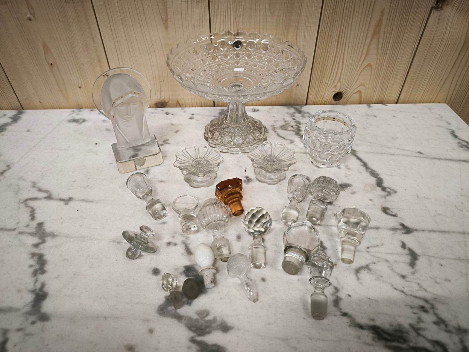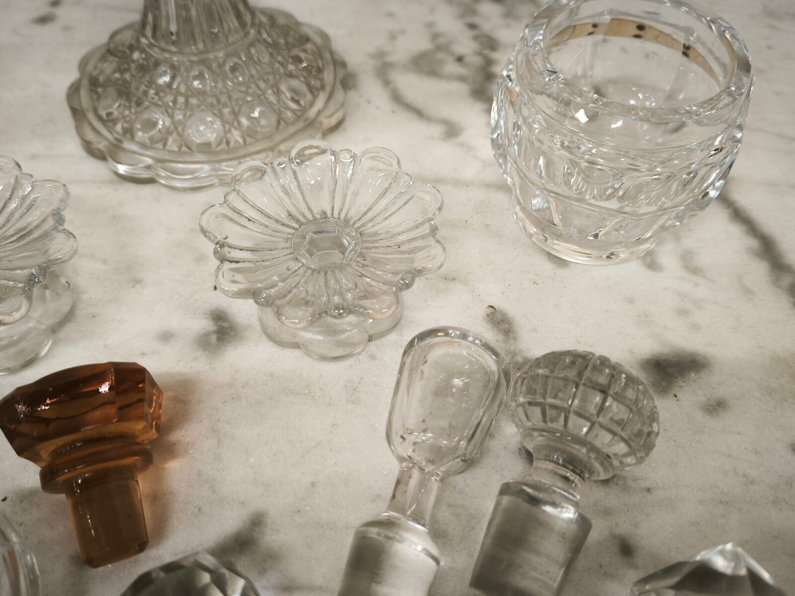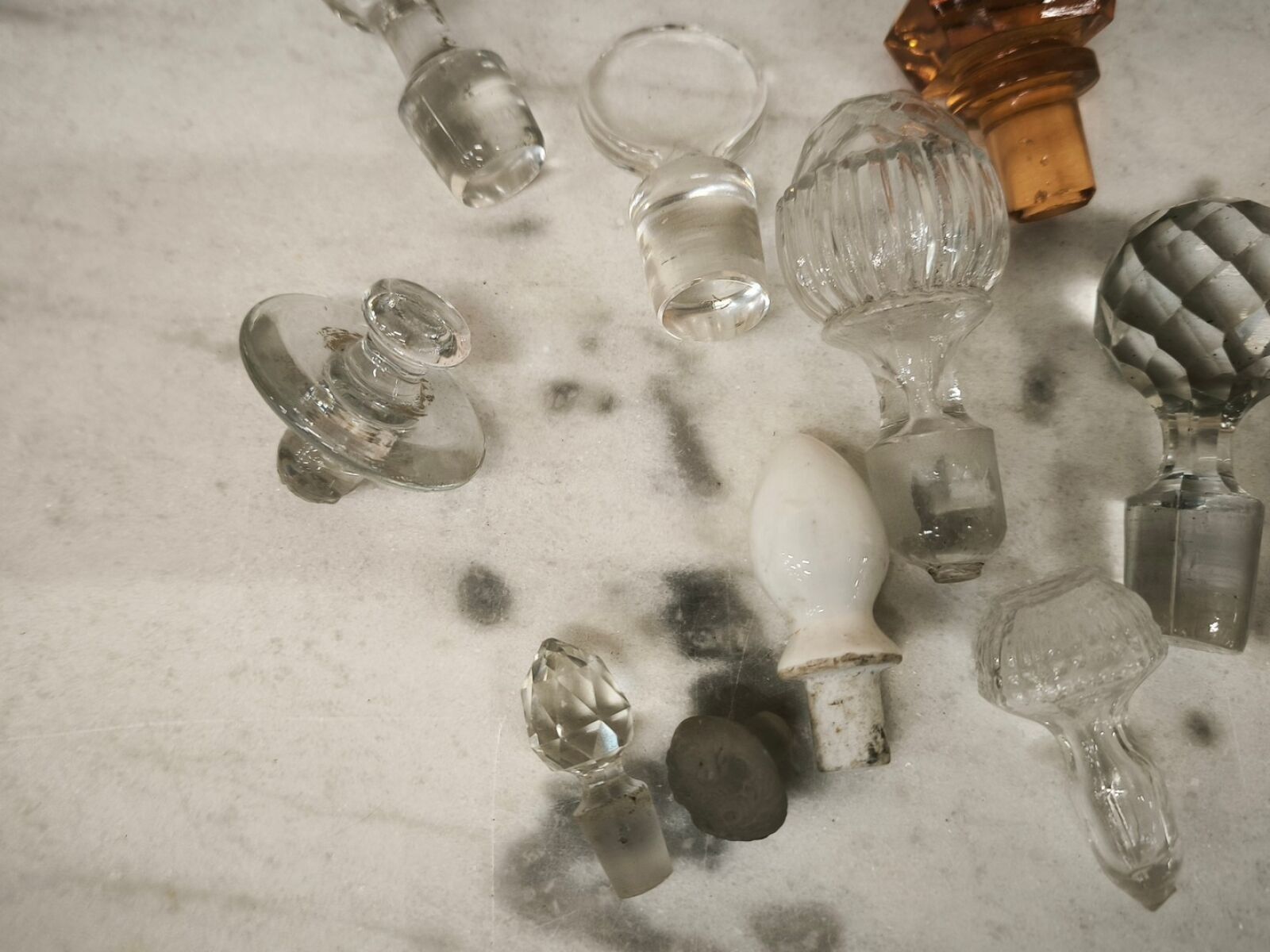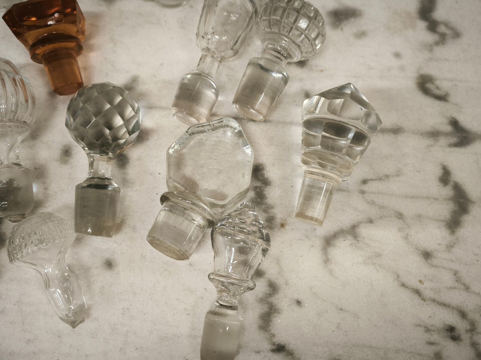 One part of a bottle signed baccarat and various stoppers.