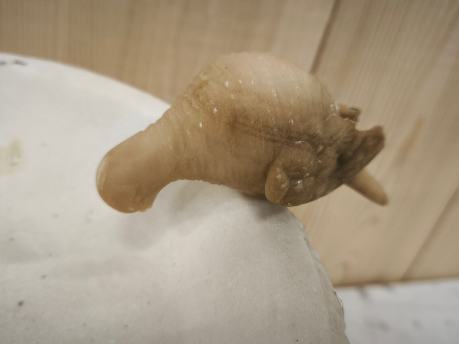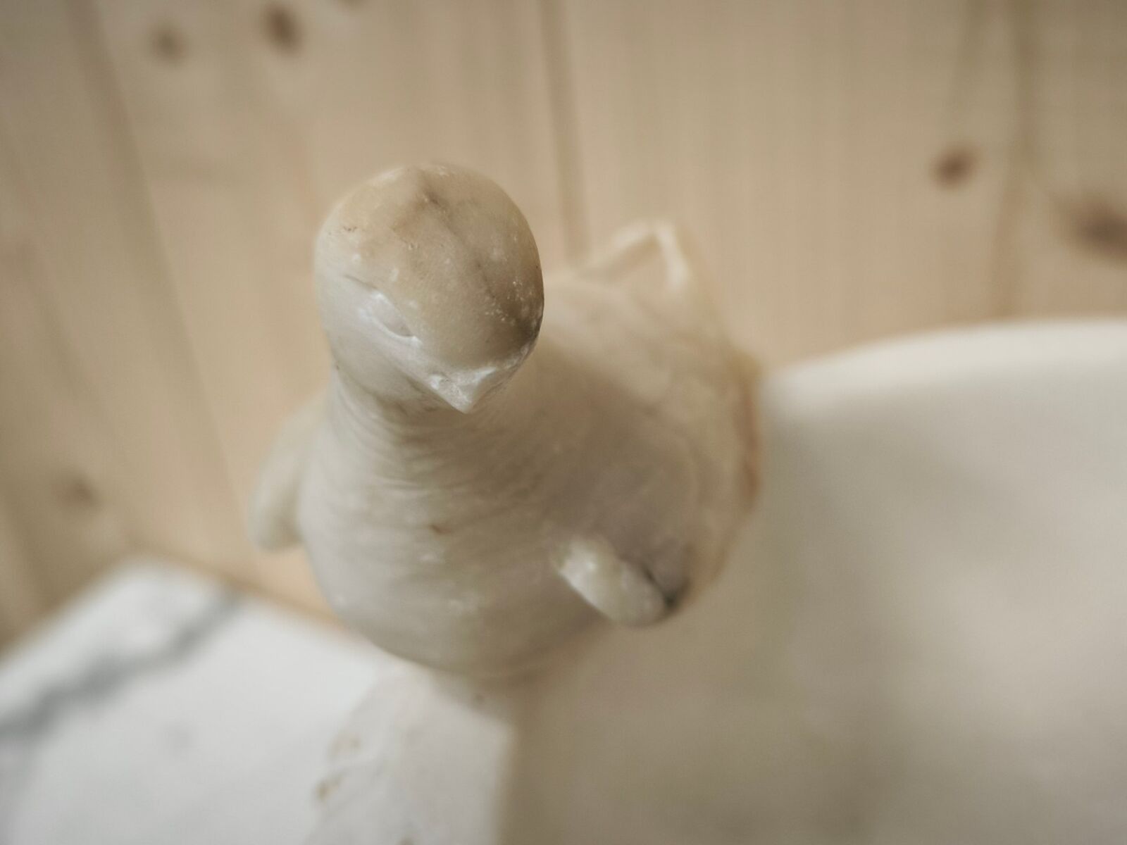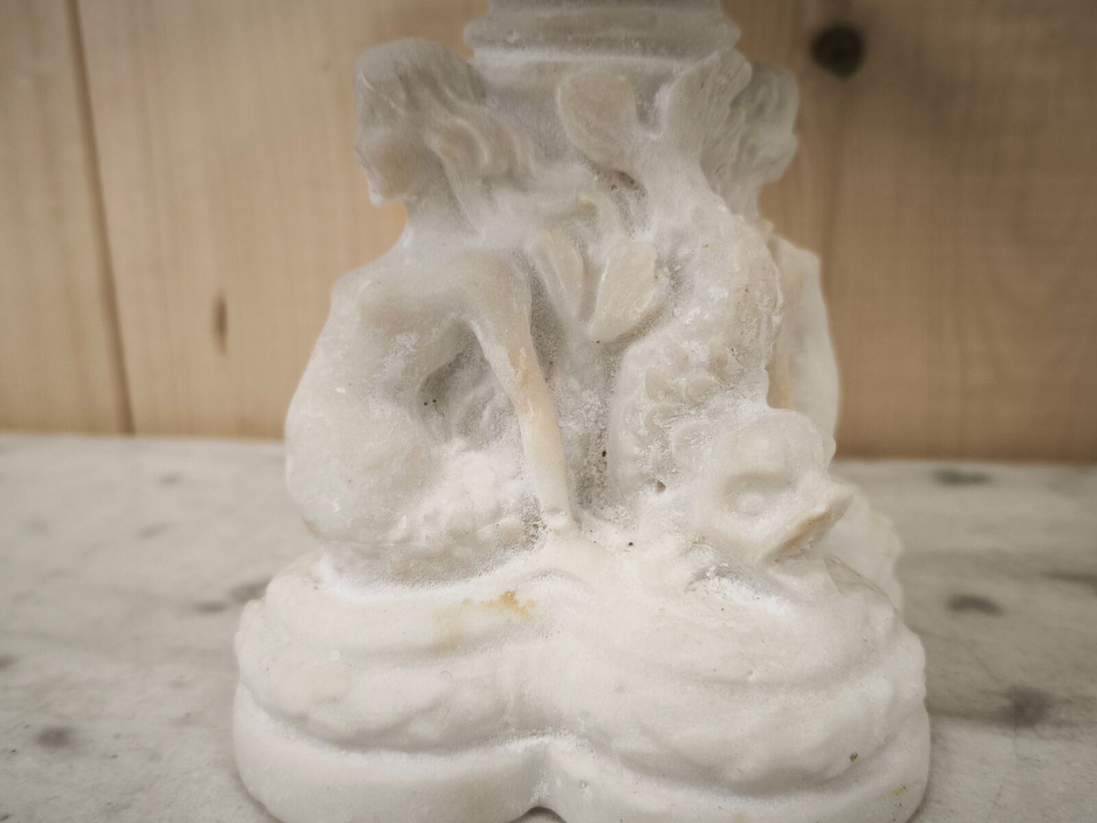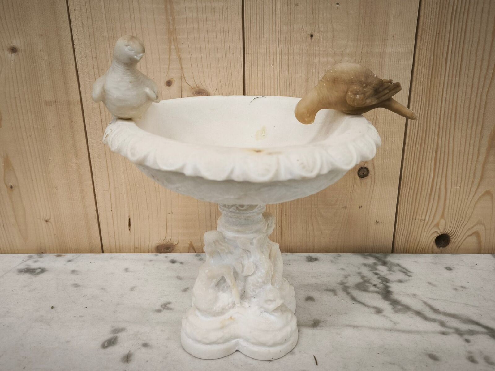 A carved alabaster bird fountain with a base decorated with mermaids.
