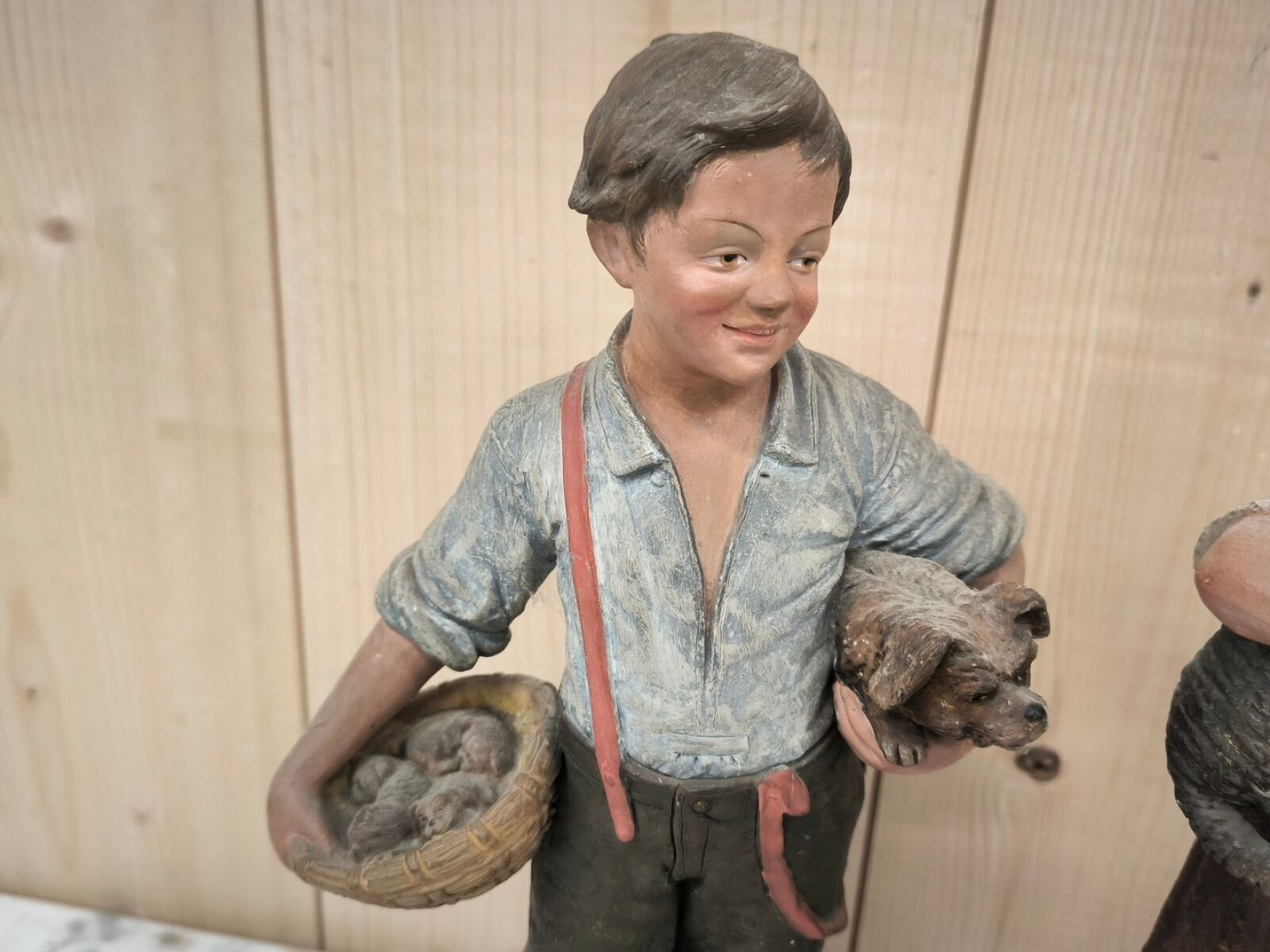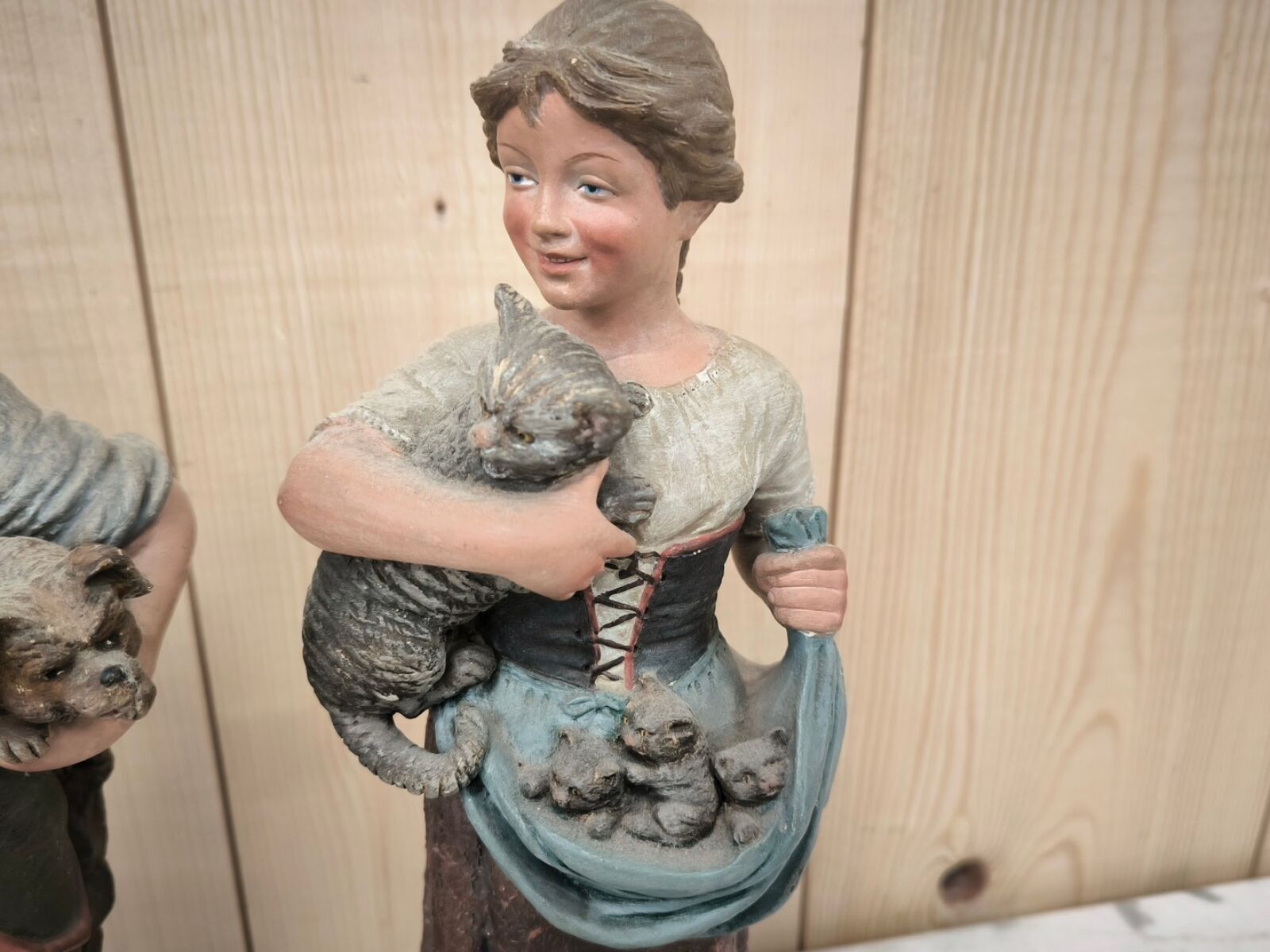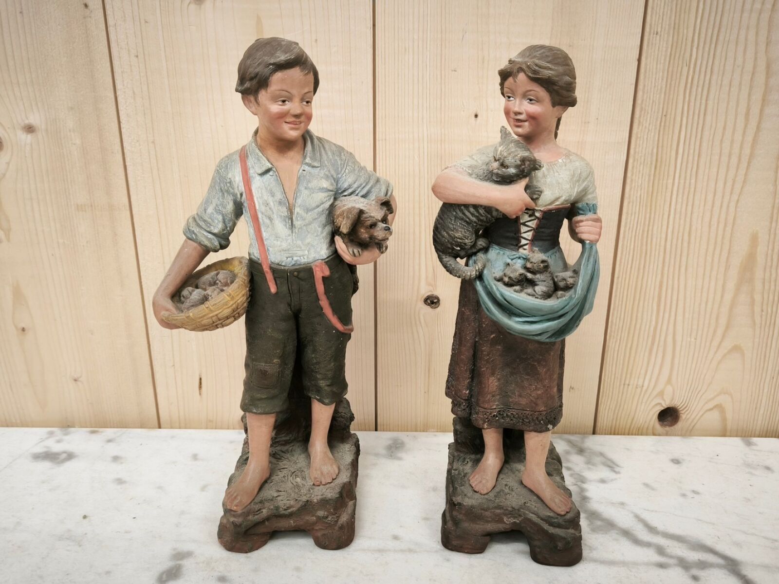 Pair of polychrome patinated terracotta subjects representing a young girl holding a cat and kittens, and a young boy holding a dog and puppies.