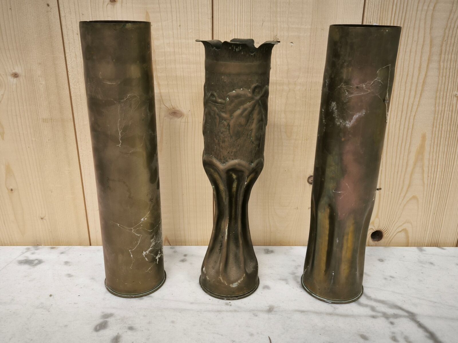 Set of 3 sockets, one with repoussé decoration of flowers.