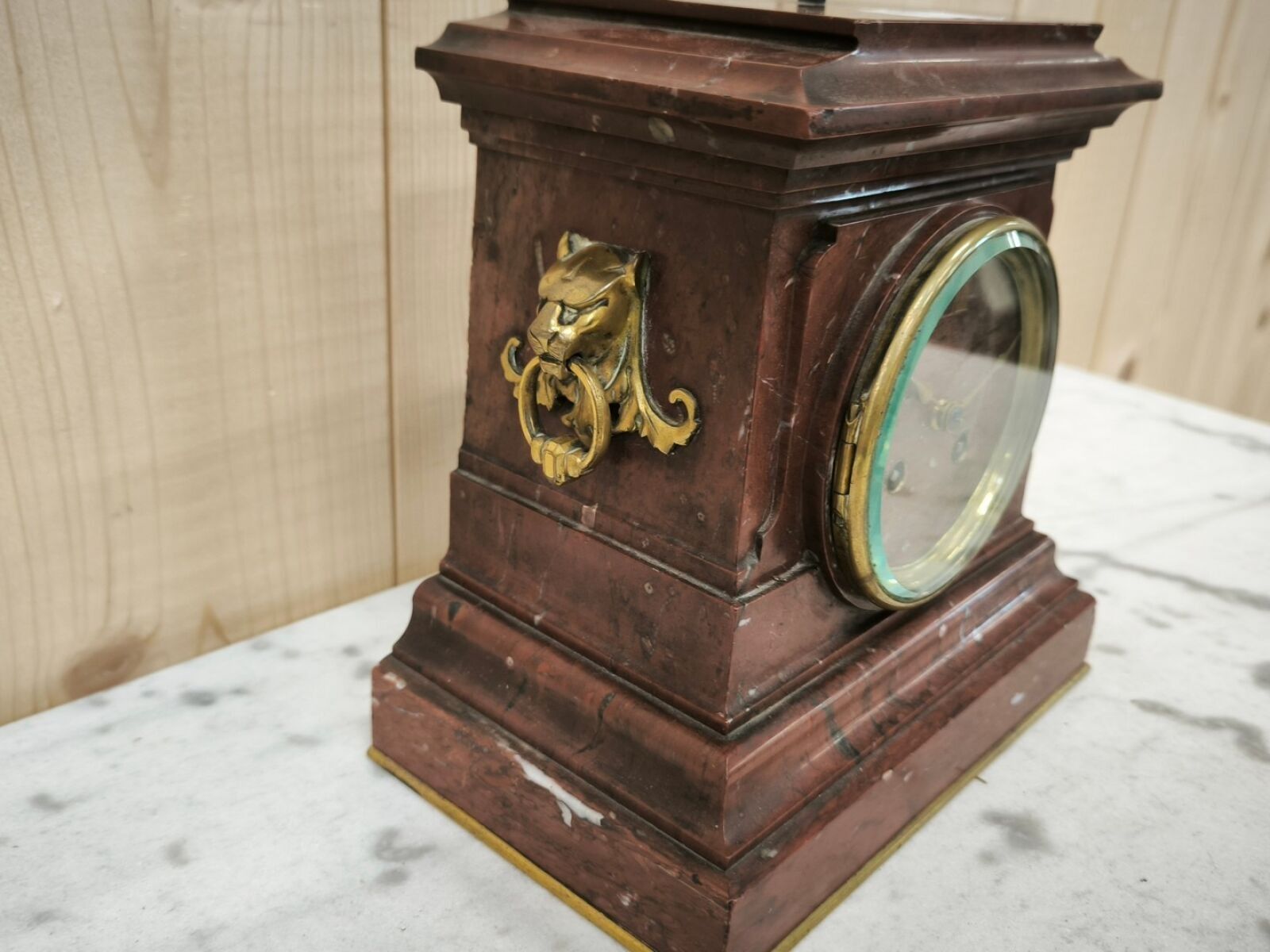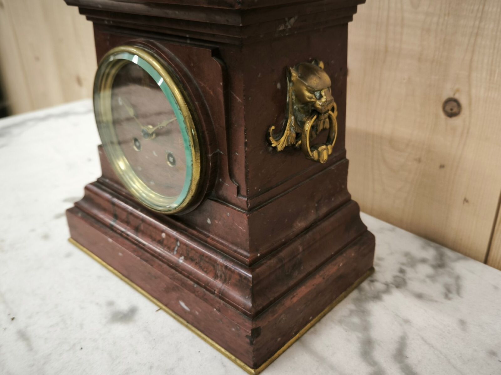 Griotte marble pedestal clock, stepped base, bronze lion gri…
