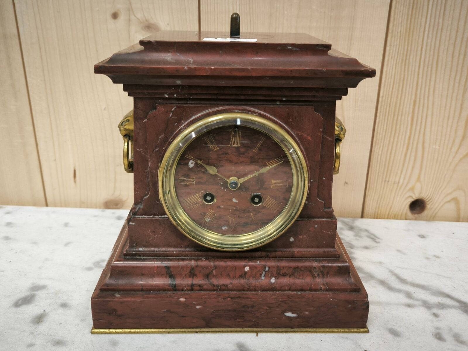 Griotte marble pedestal clock, stepped base, bronze lion grips, the round dial showing the hours in Roman numerals.
