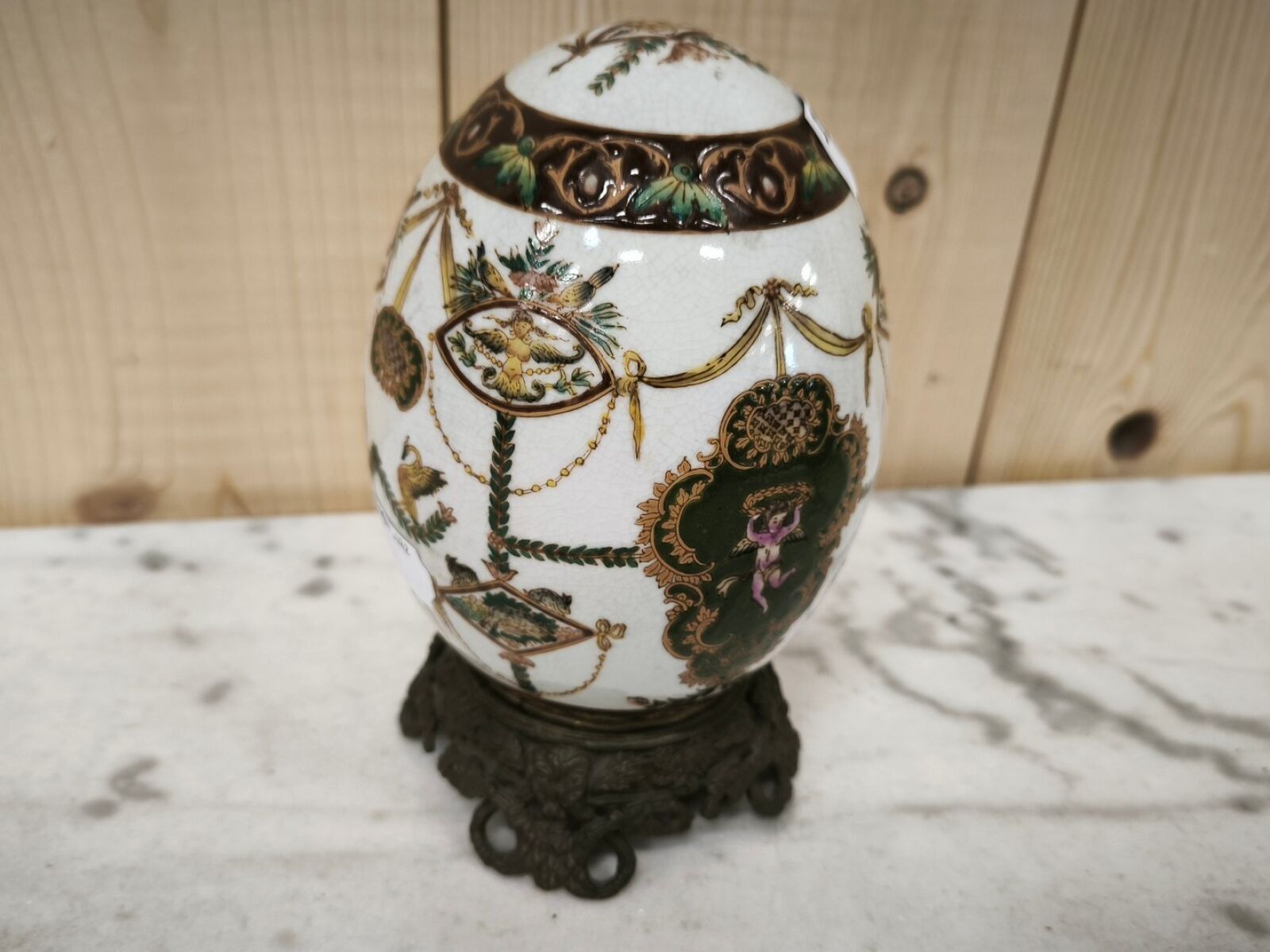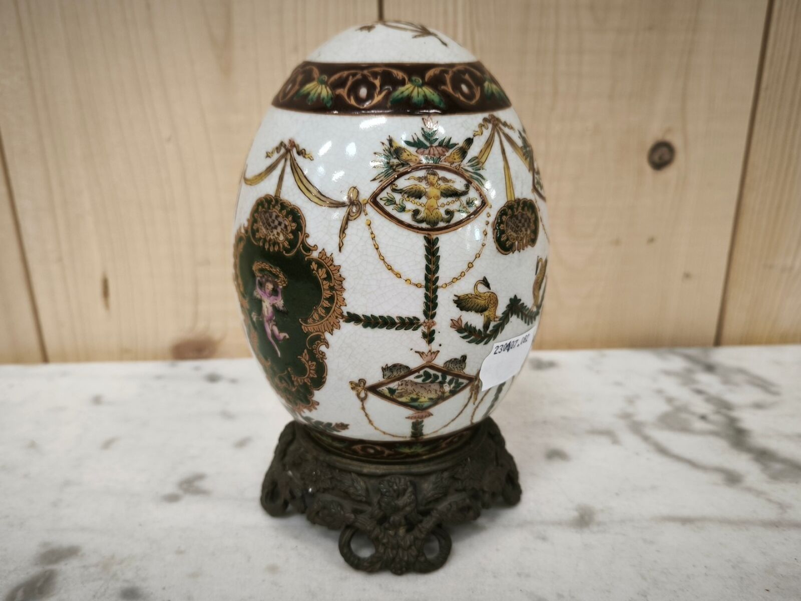 A decorative egg in enamelled porcelain with polychrome decoration in the style of Pompeian frescoes.