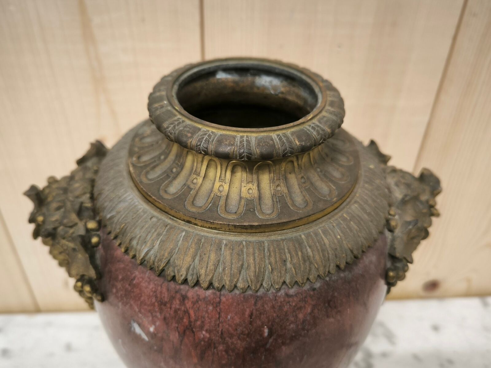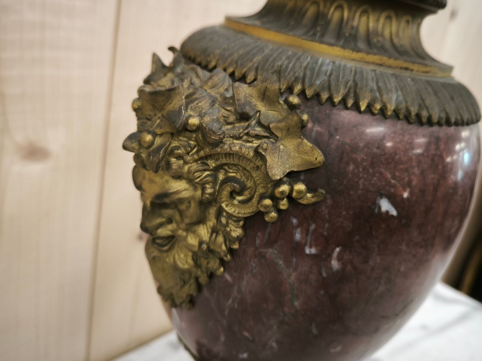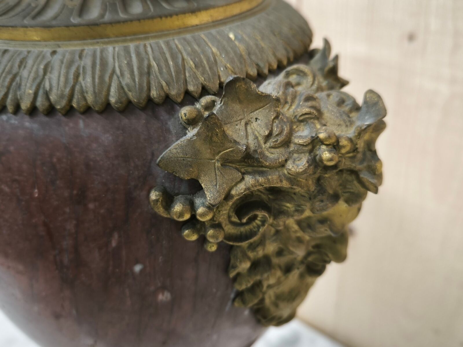 A Louis XV style ormolu and chased bronze baluster vase with simulated satyr handles (lid probably missing)