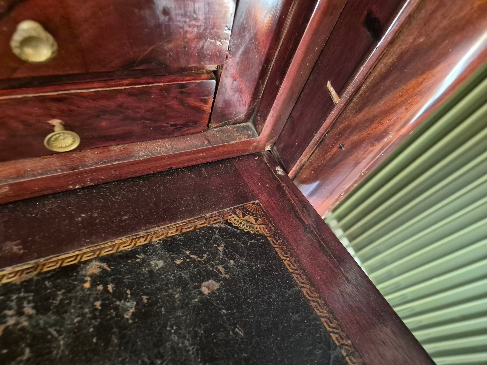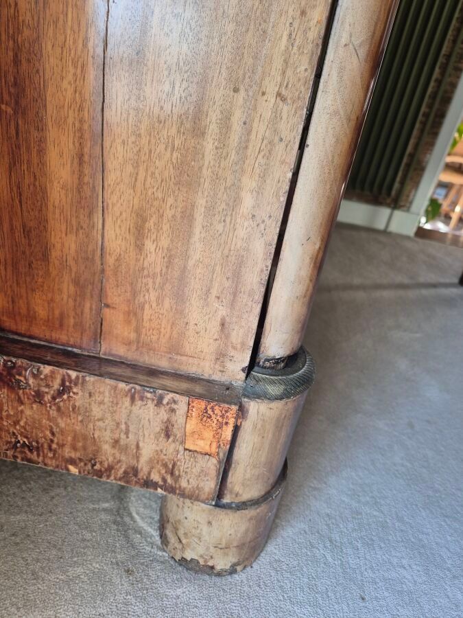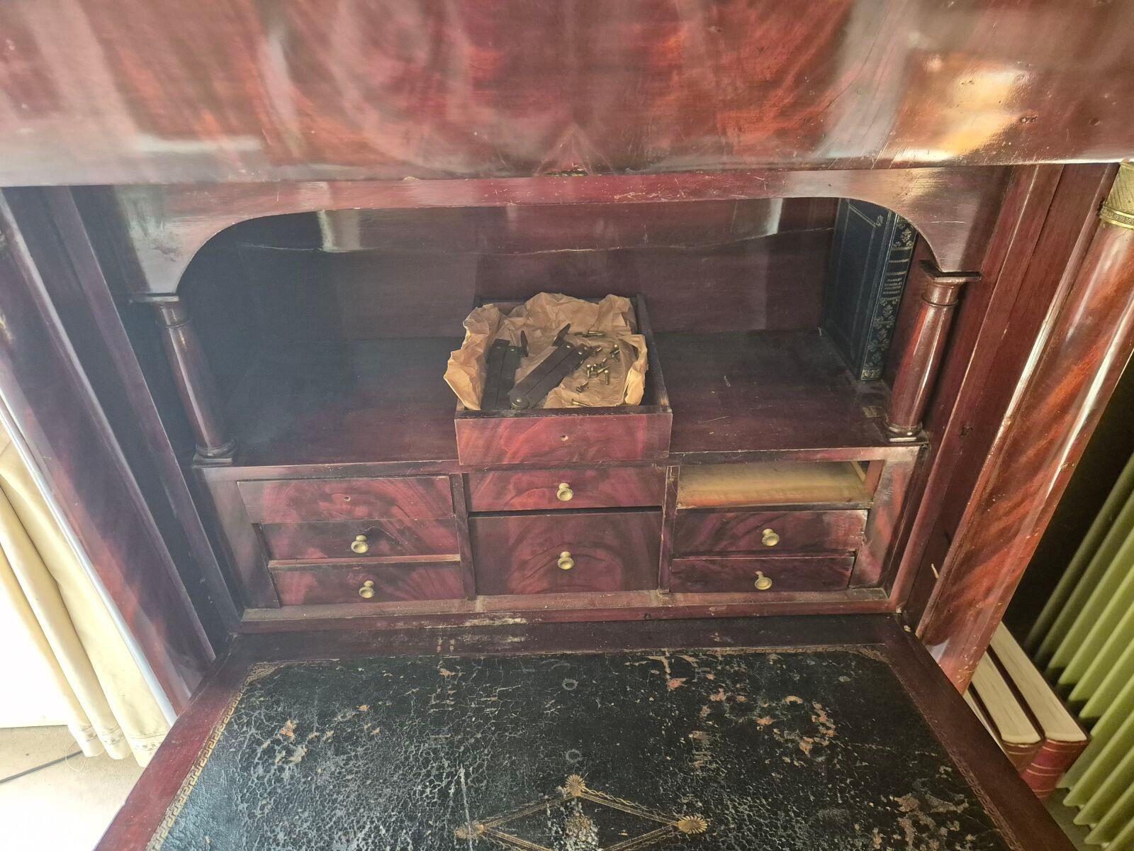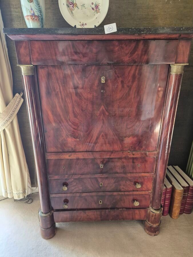 -A mahogany veneered desk with a grey Saint-Anne marble top and a half-column front, early 19th century.
