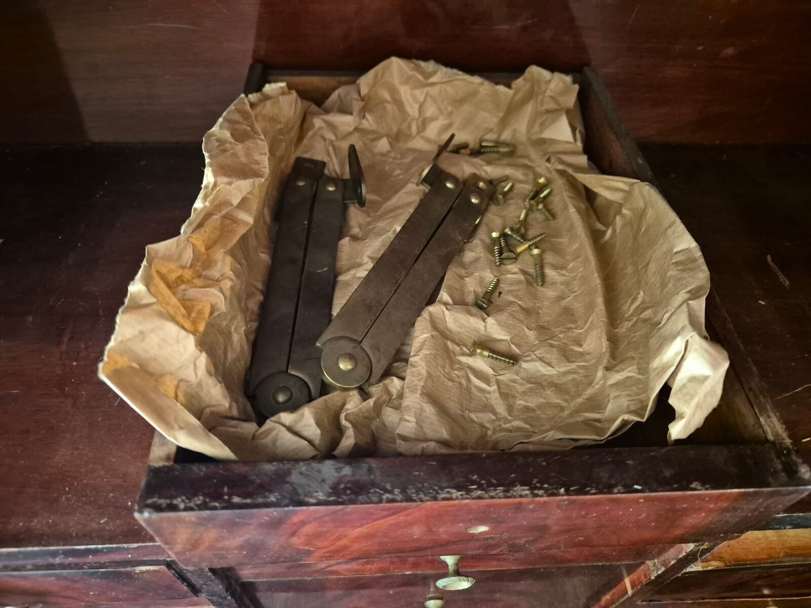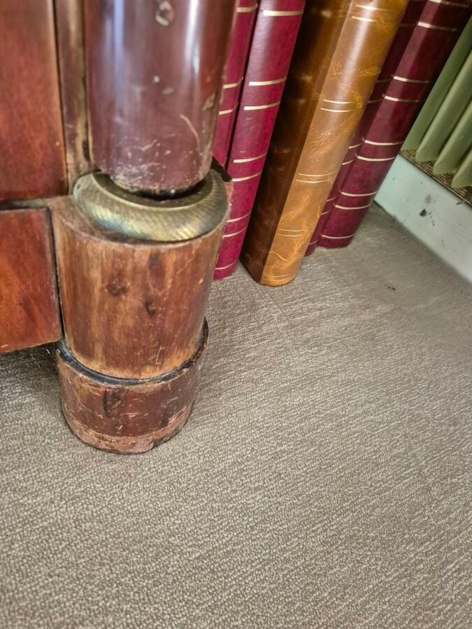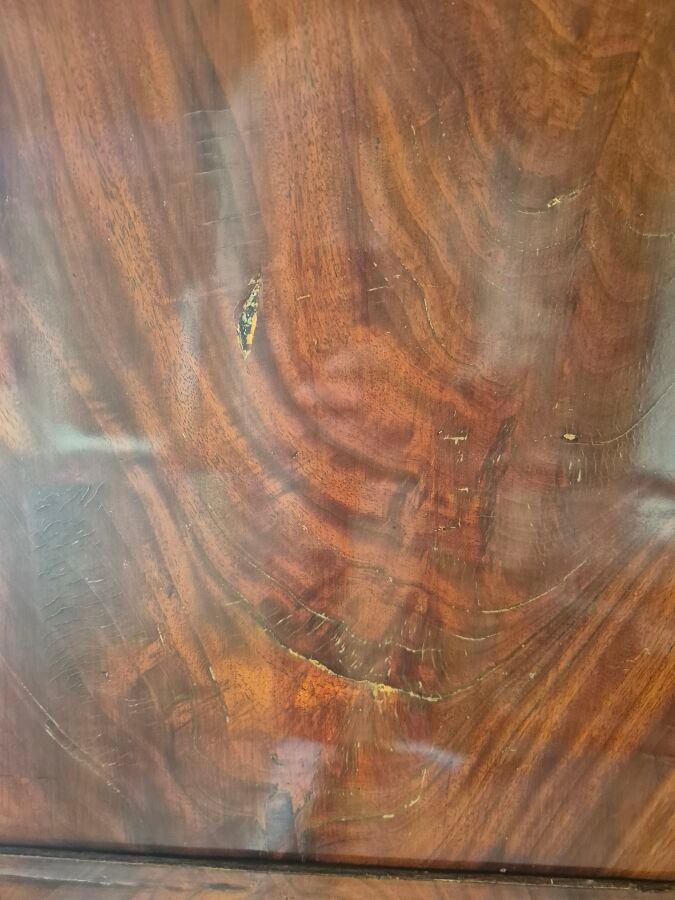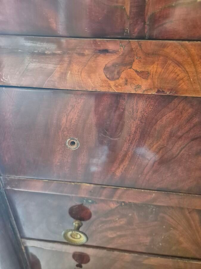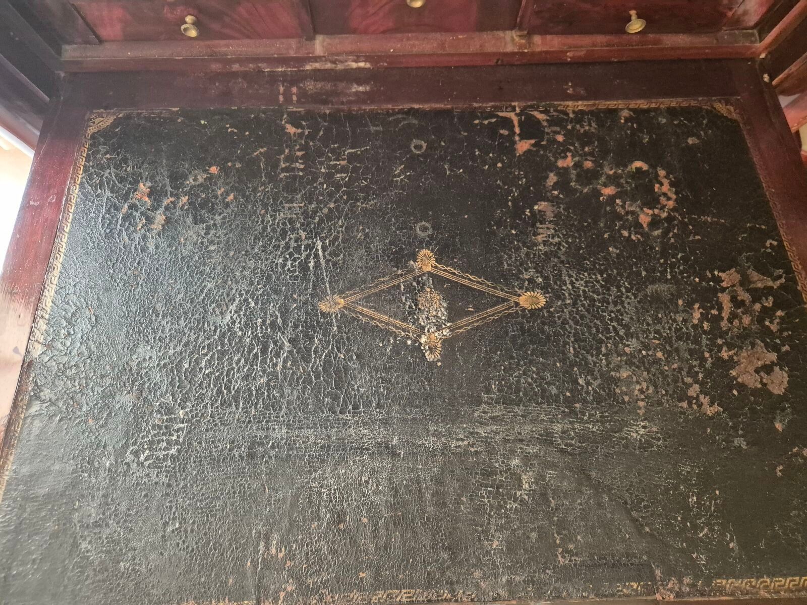 -A mahogany veneered desk with a grey Saint-Anne marble top and a half-column front, early 19th century.