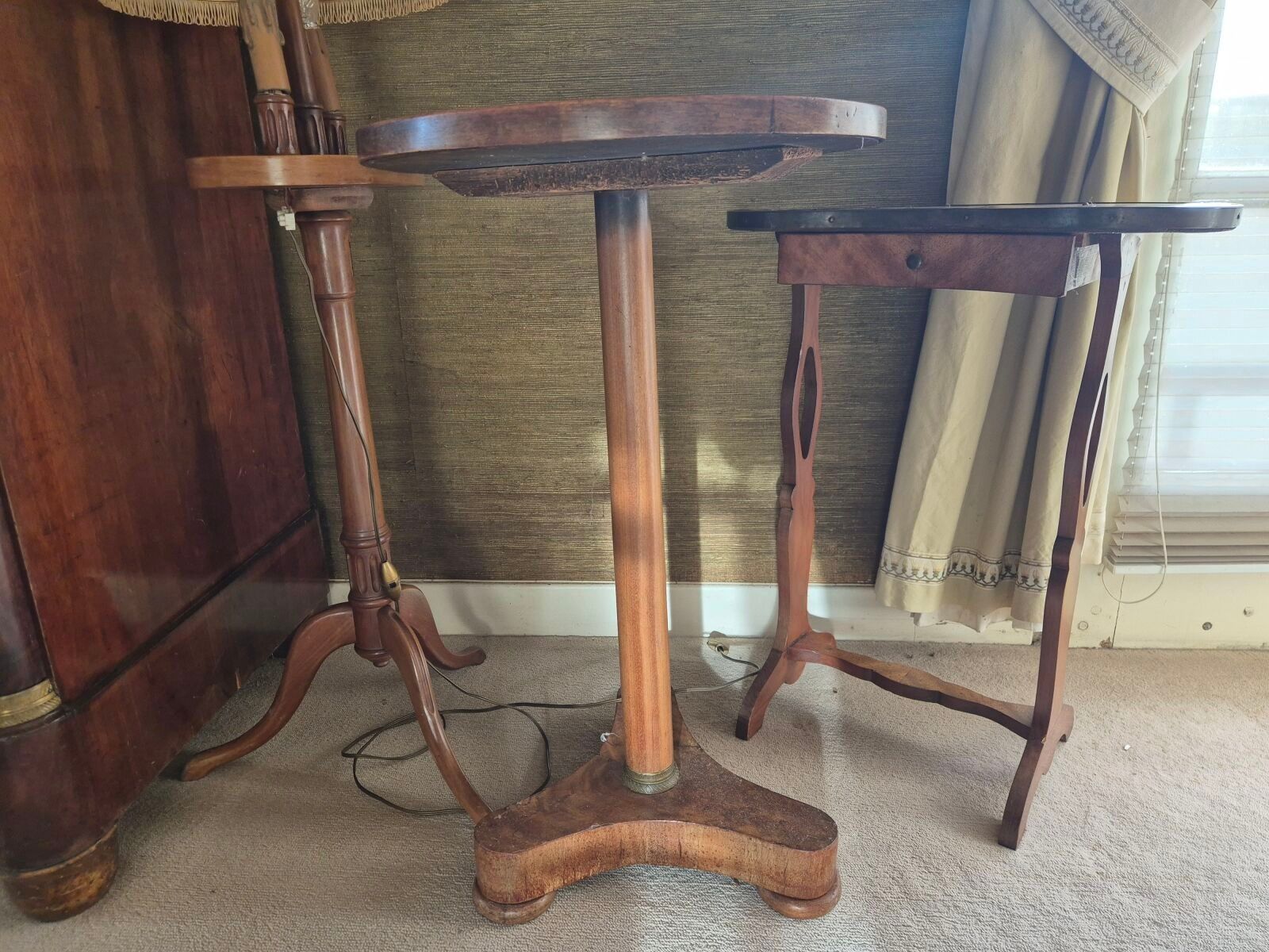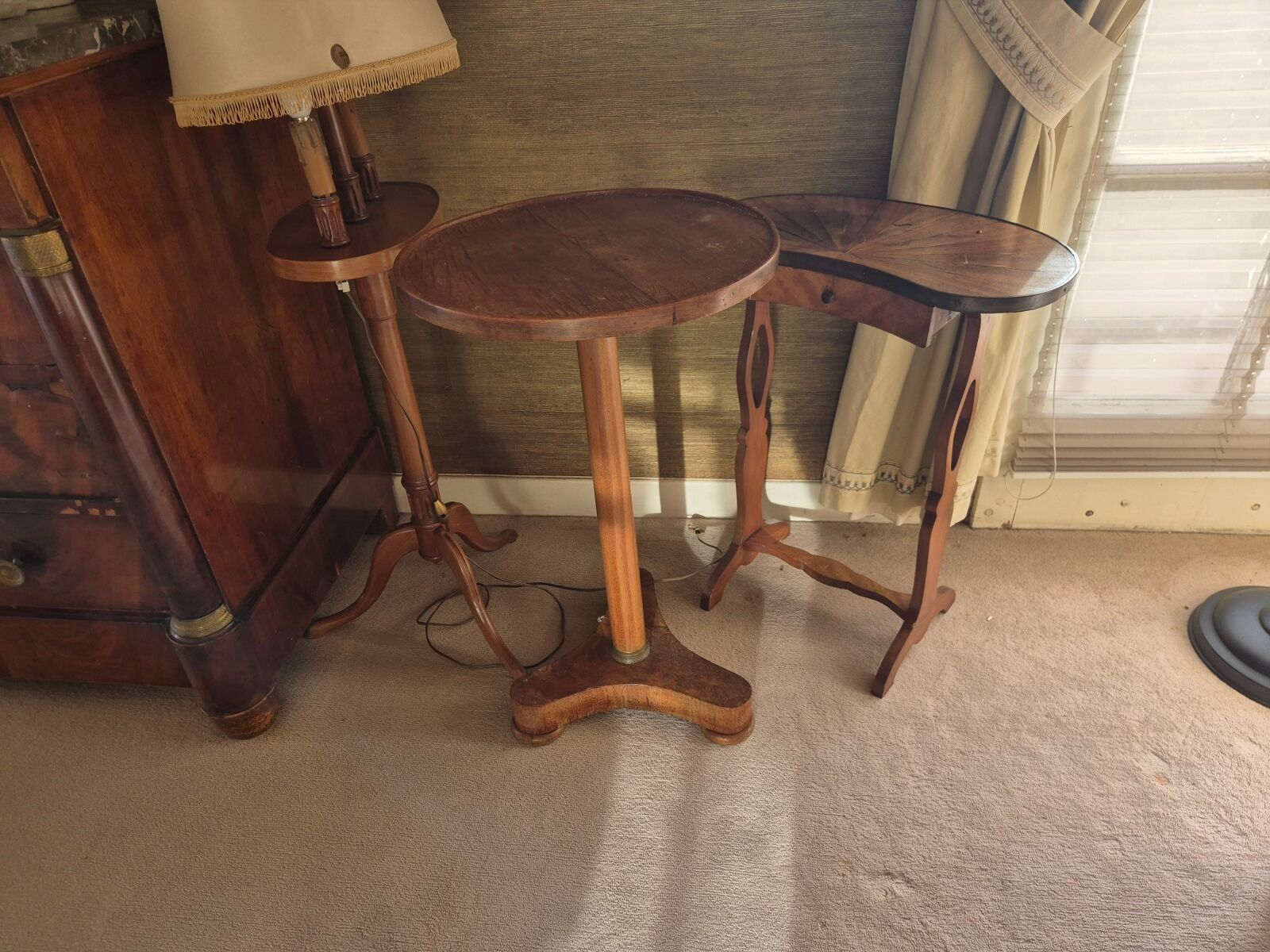 -Small tripod coffee table in natural wood, Louis XVI style, 20th century. A small kidney-shaped table and a small serving table with two light arms are attached.