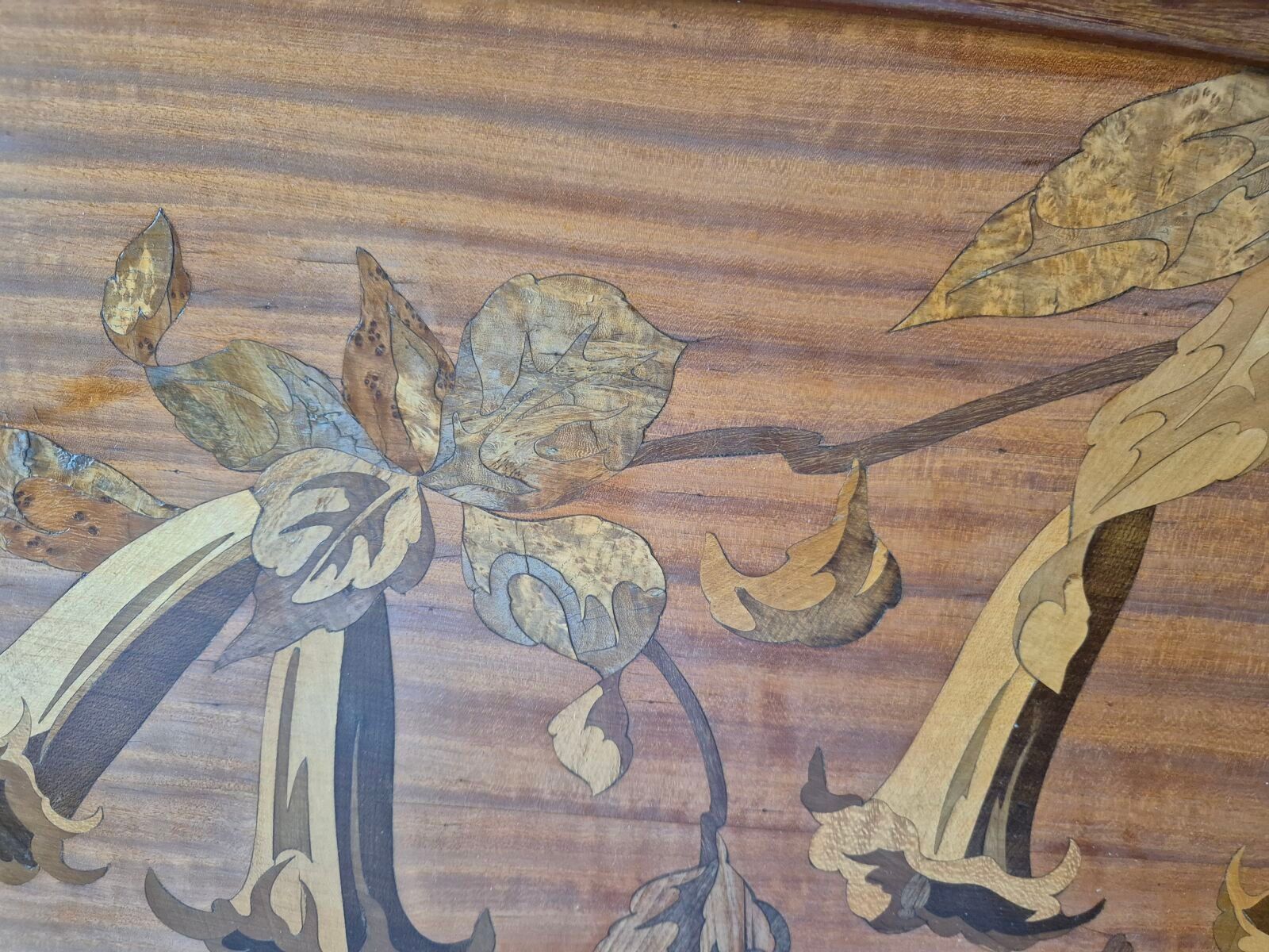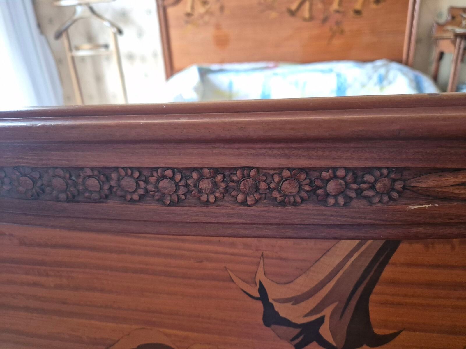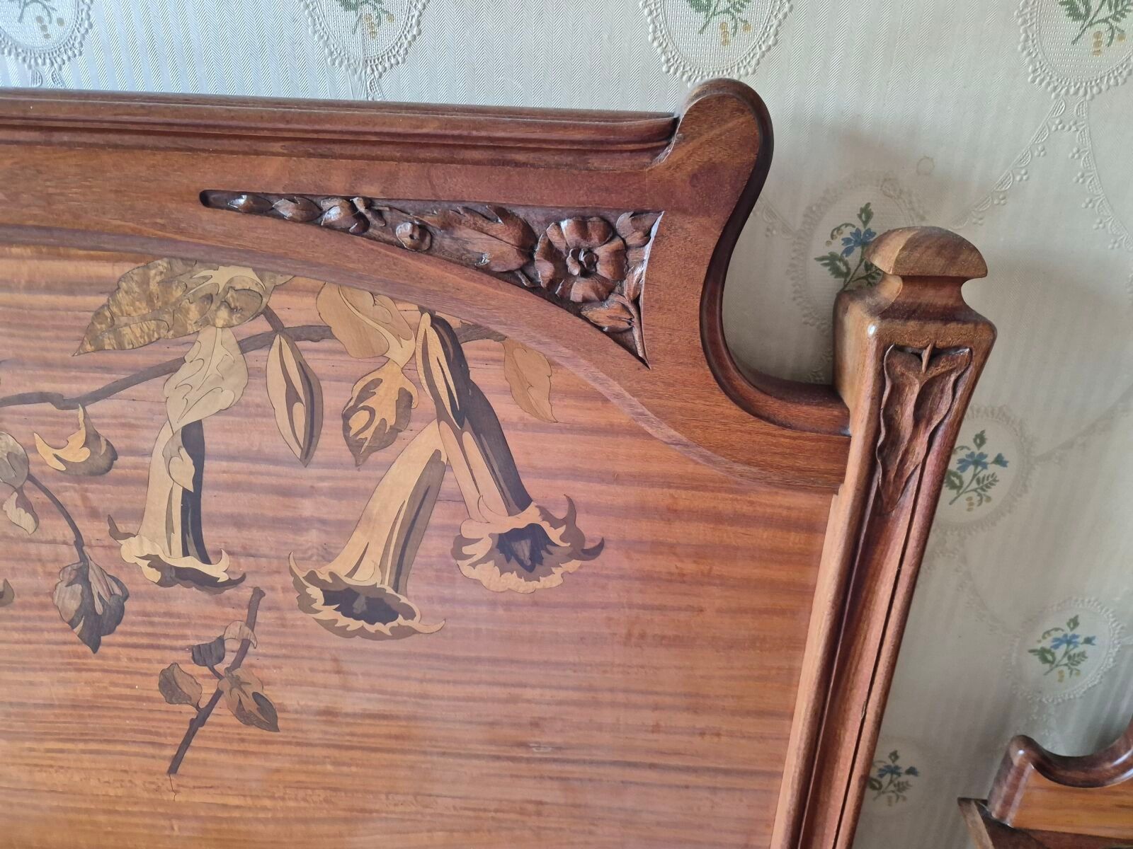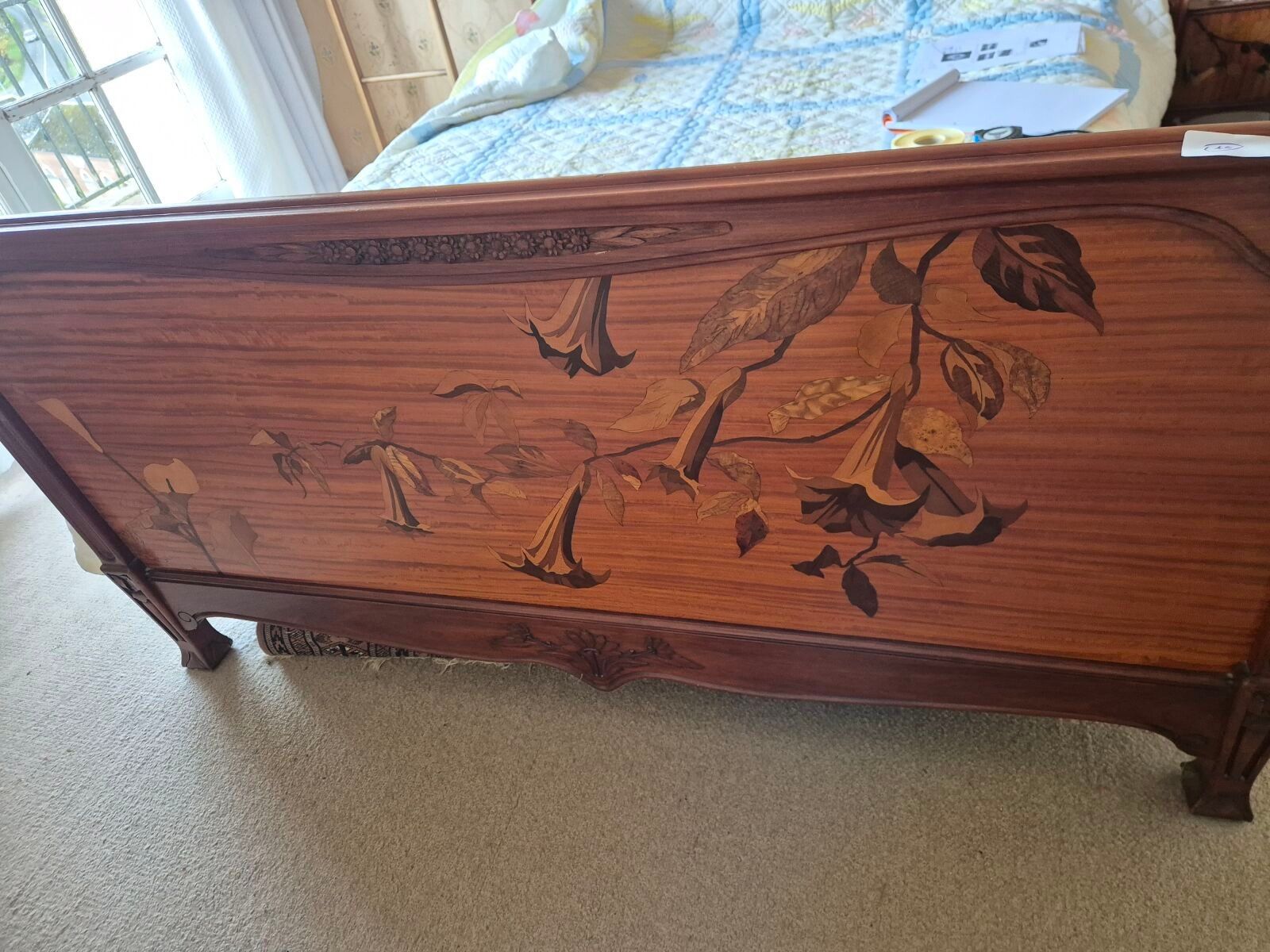 -Moulded and carved mahogany double bed with matching bedside table, veneered and inlaid with natura flowers, circa 1900 (one drawer missing)