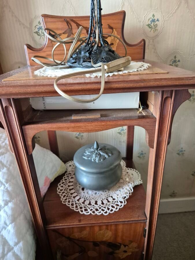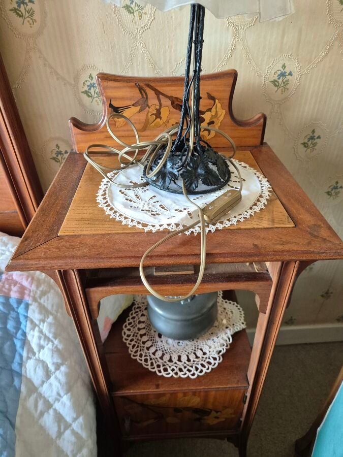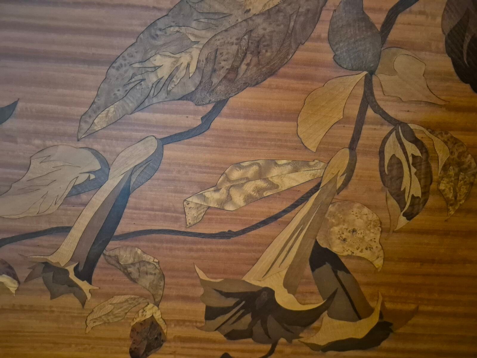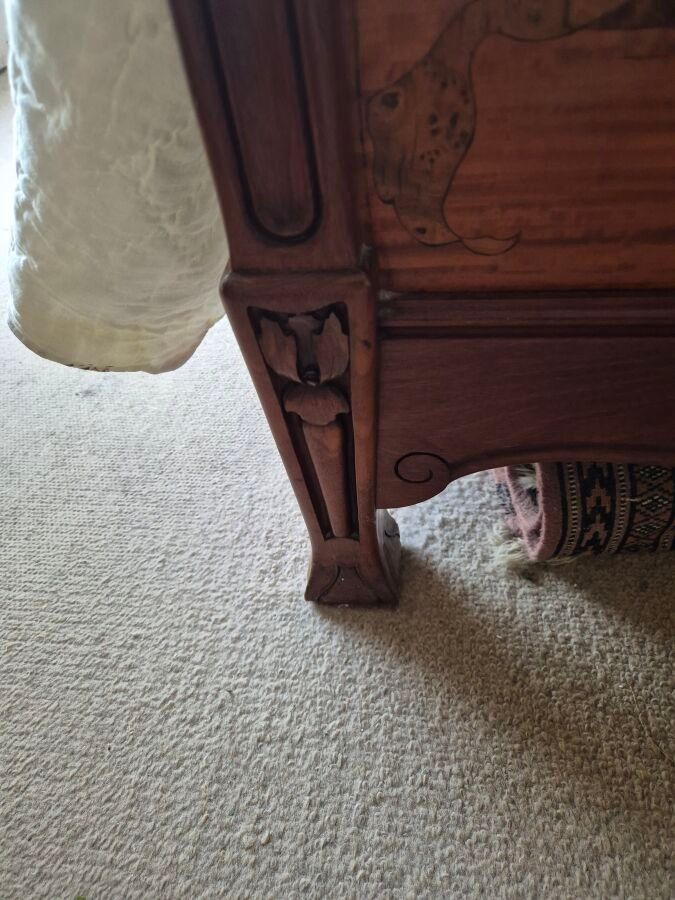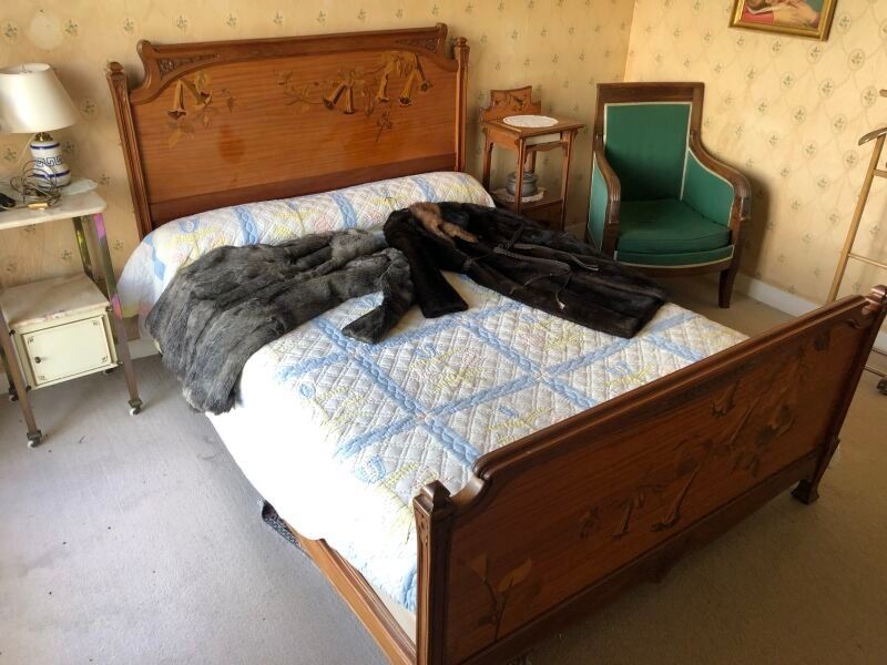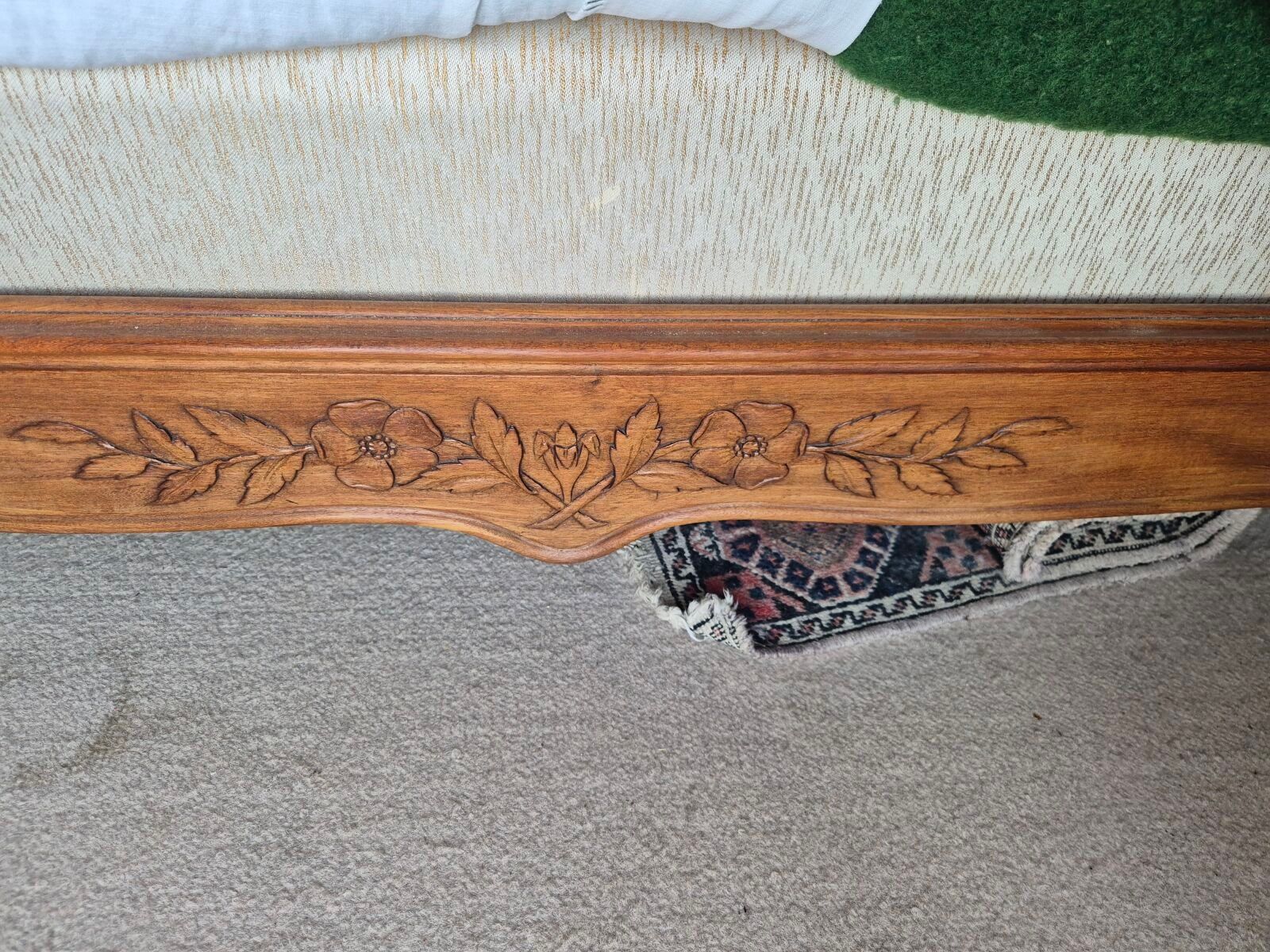 -Moulded and carved mahogany double bed with matching bedside table, veneered and inlaid with natura flowers, circa 1900 (one drawer missing)