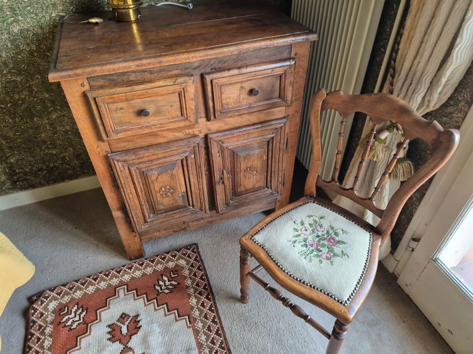 Set of furniture contained in a bedroom including -Low sideboard in moulded oak opening with two doors and two drawers, antique elements, rustic, carpets and miscellaneous.